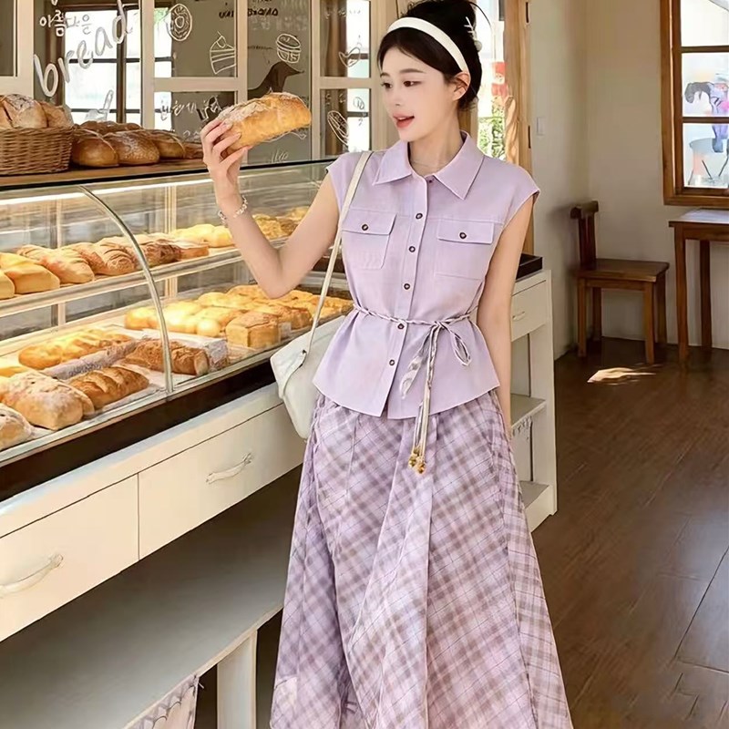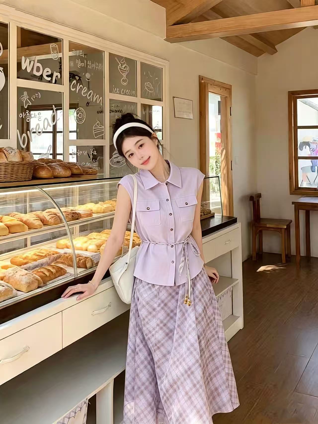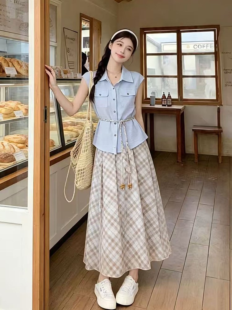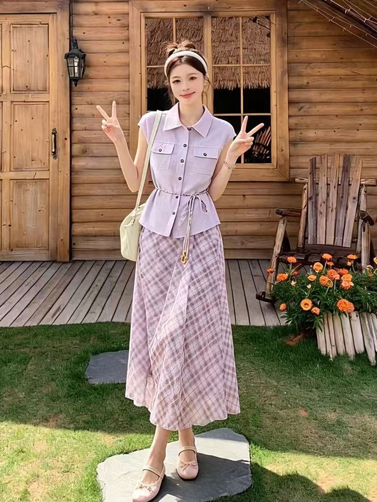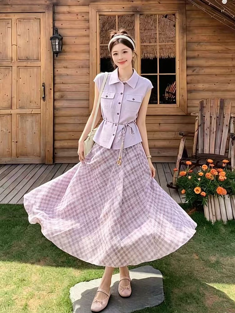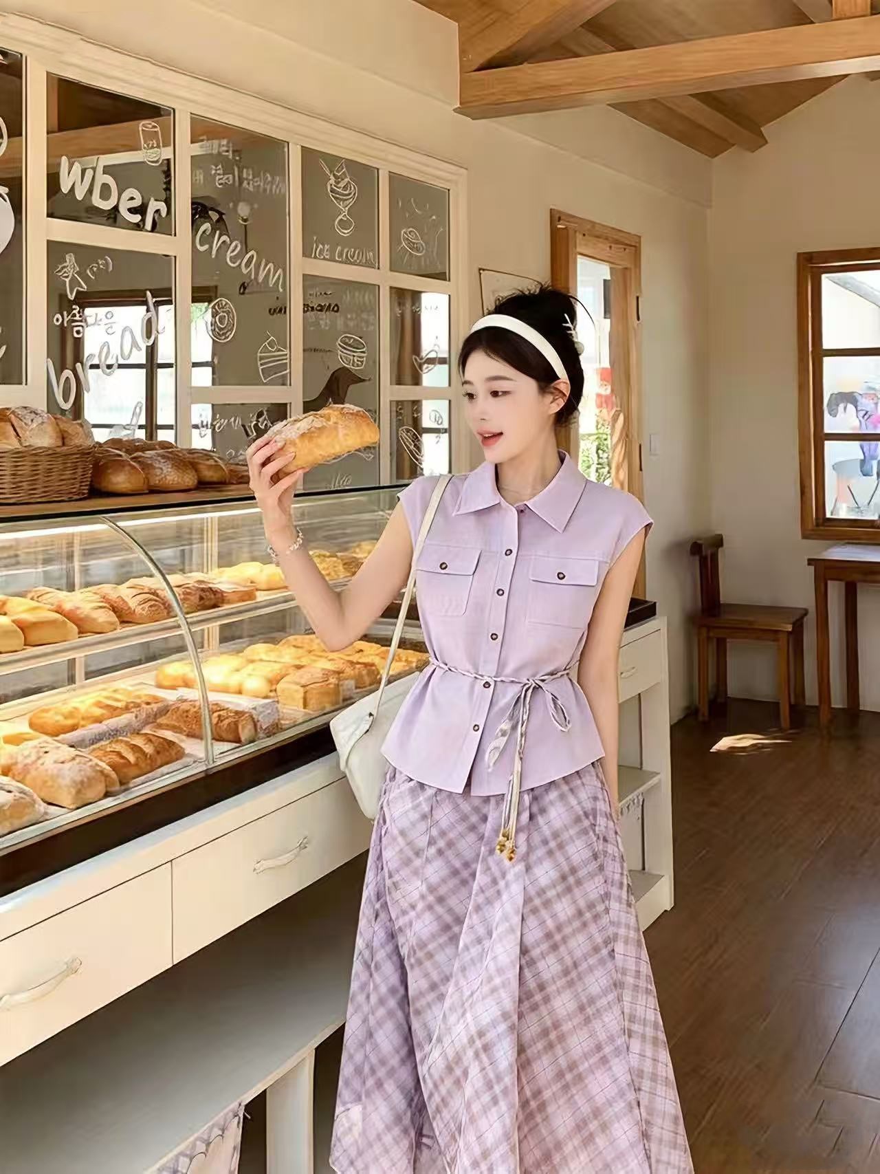 RY3695# 法式轻熟风套装裙女2026夏新款大码气质翻领衬衫格纹半身裙两件套