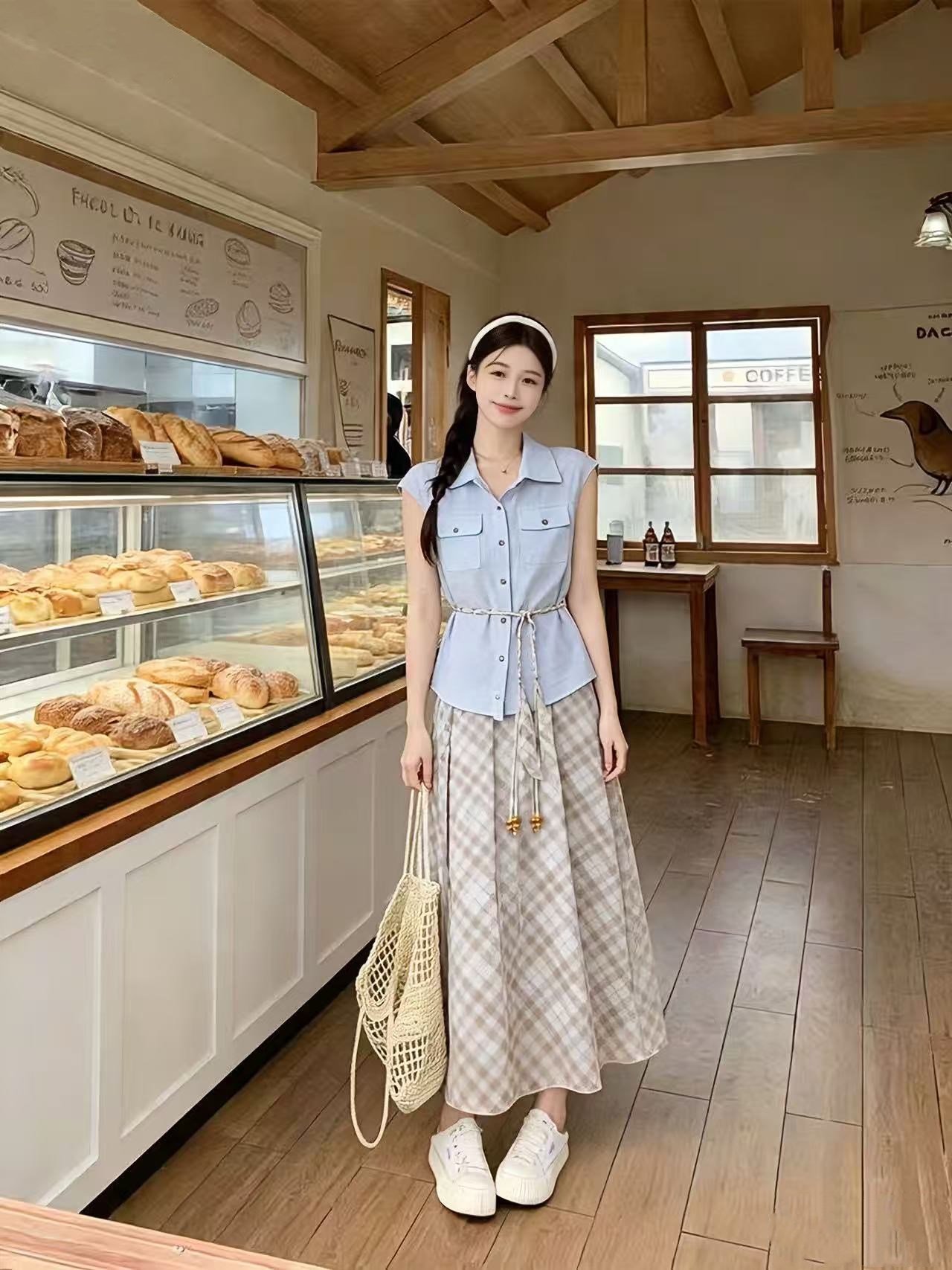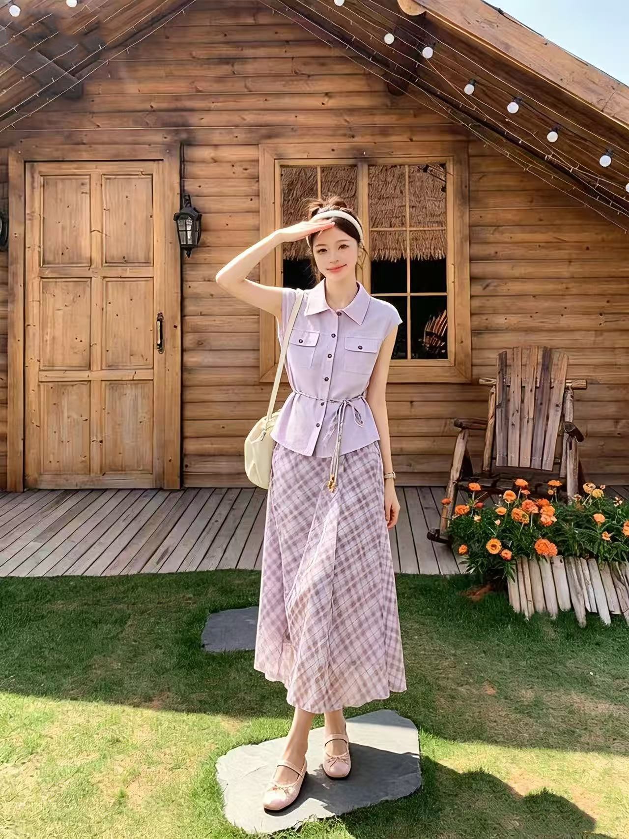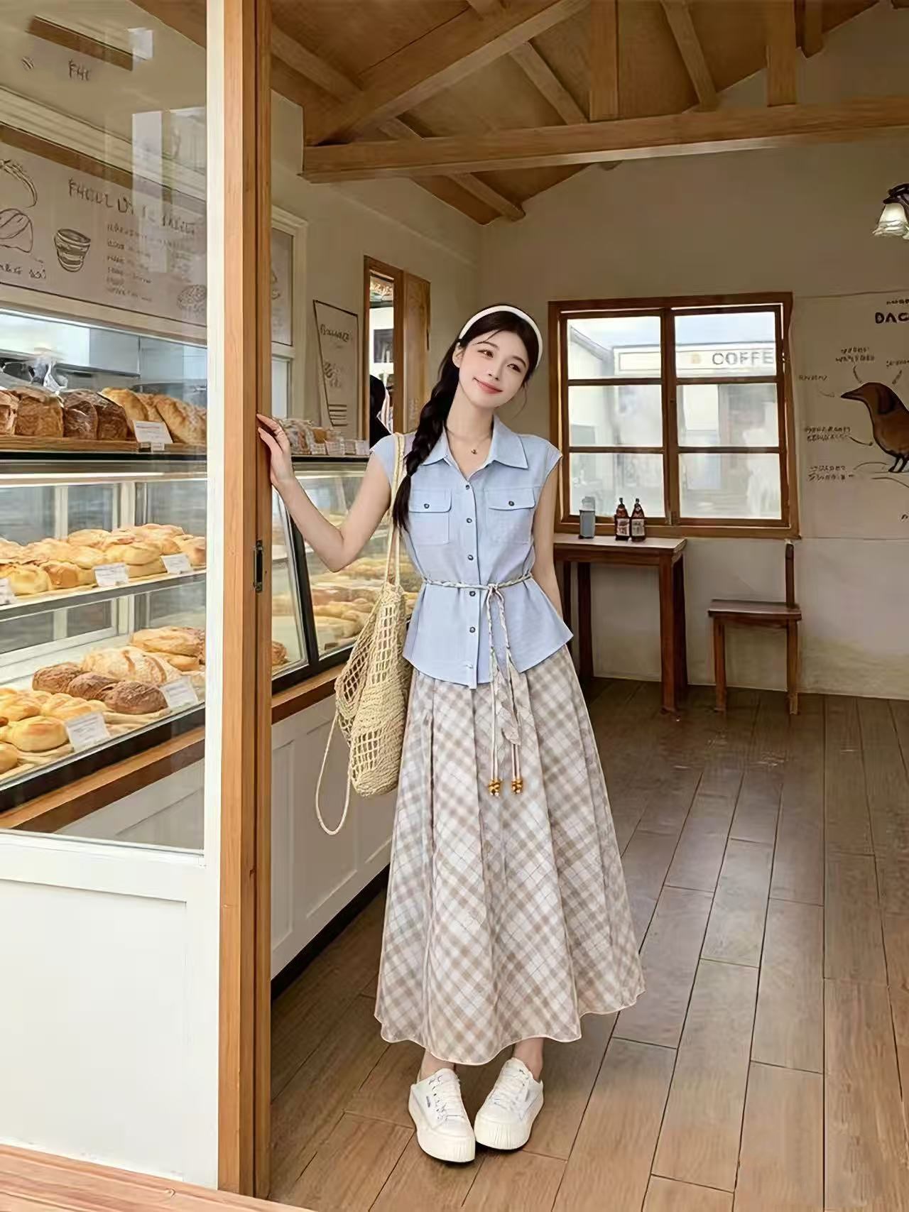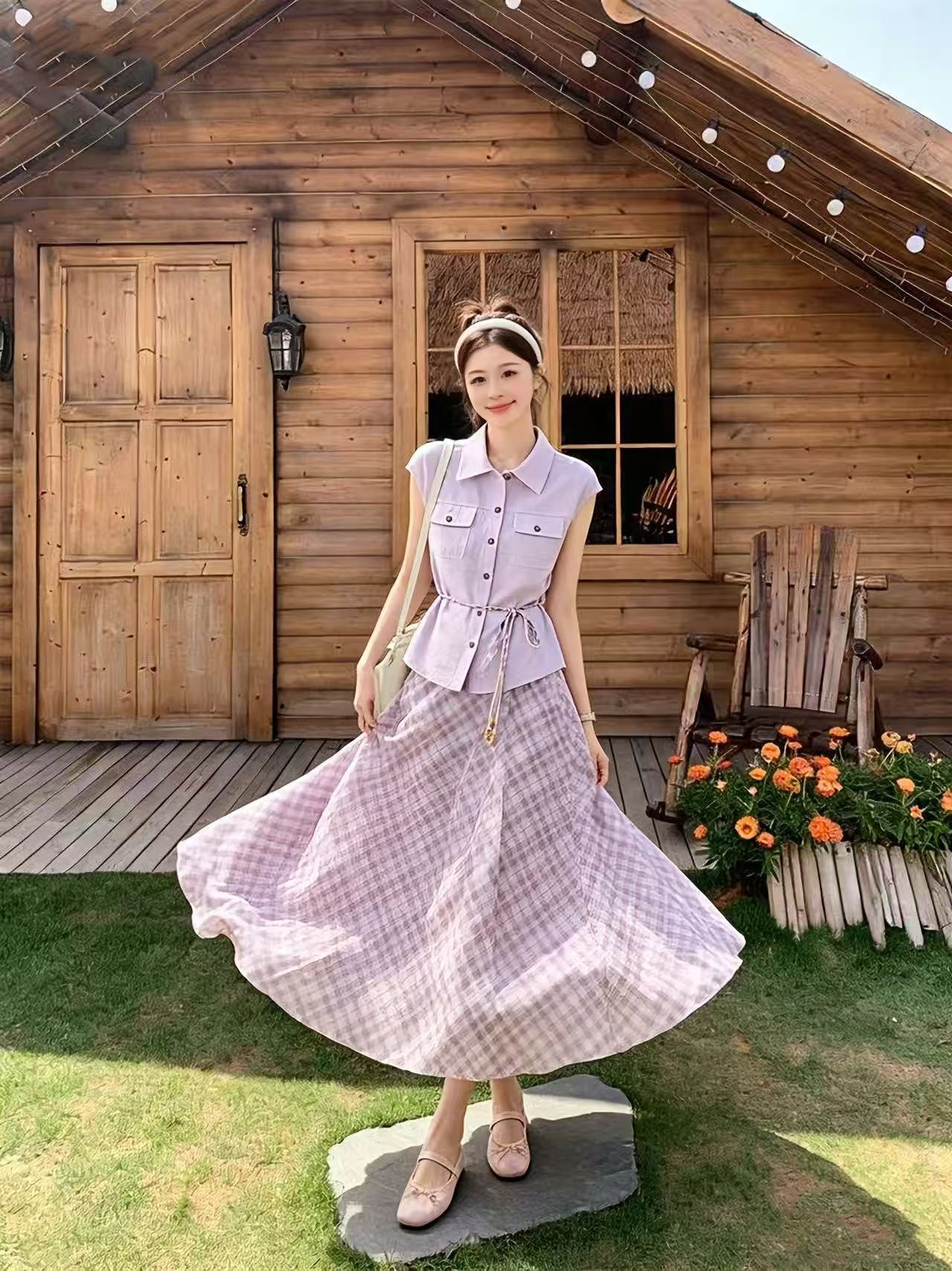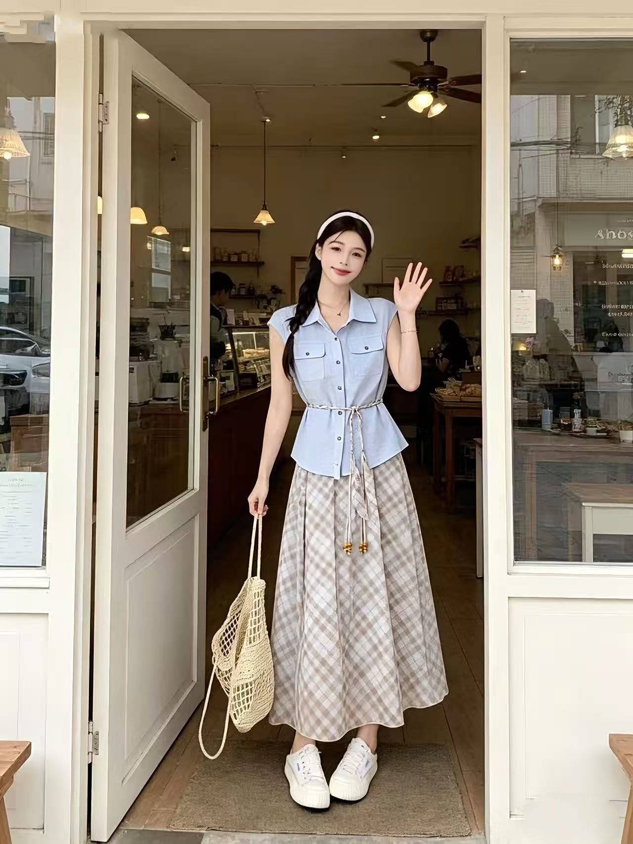 RY3695# 法式轻熟风套装裙女2026夏新款大码气质翻领衬衫格纹半身裙两件套