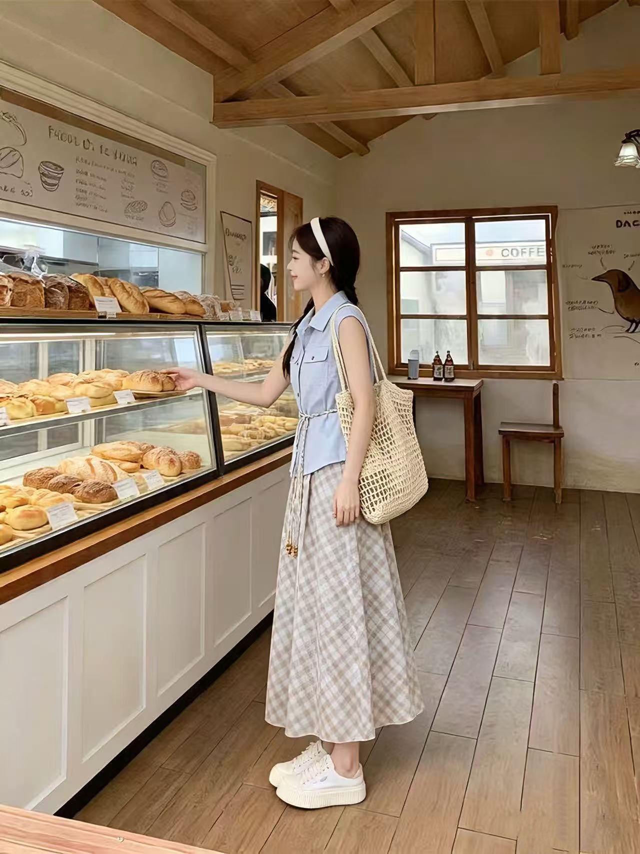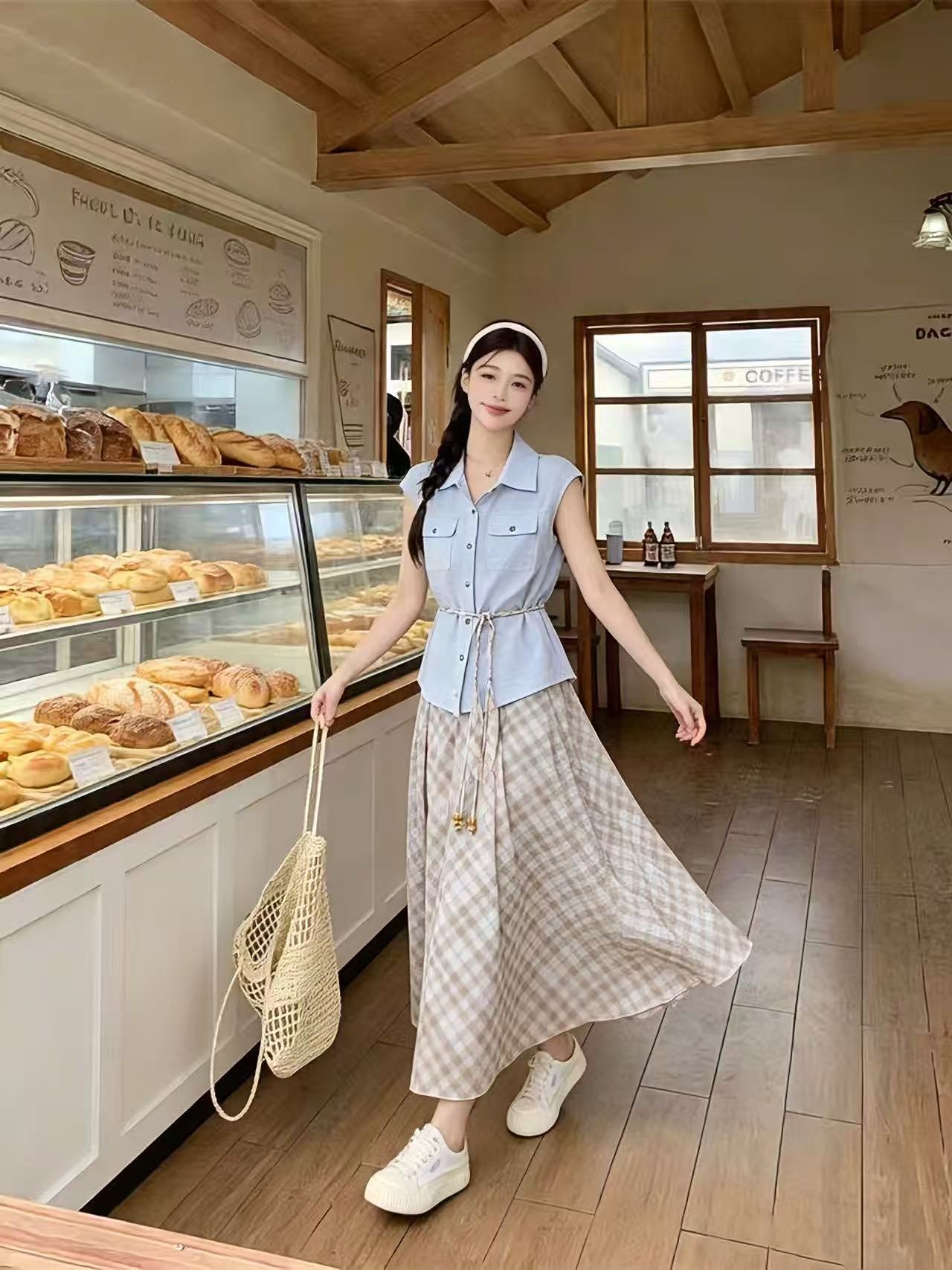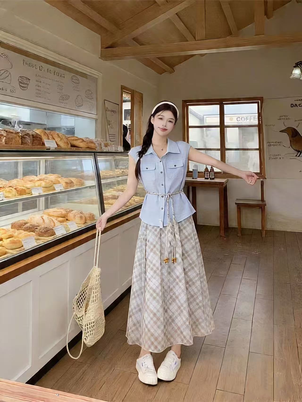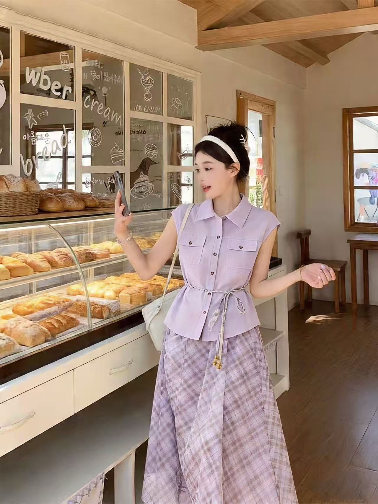 RY3695# 法式轻熟风套装裙女2026夏新款大码气质翻领衬衫格纹半身裙两件套