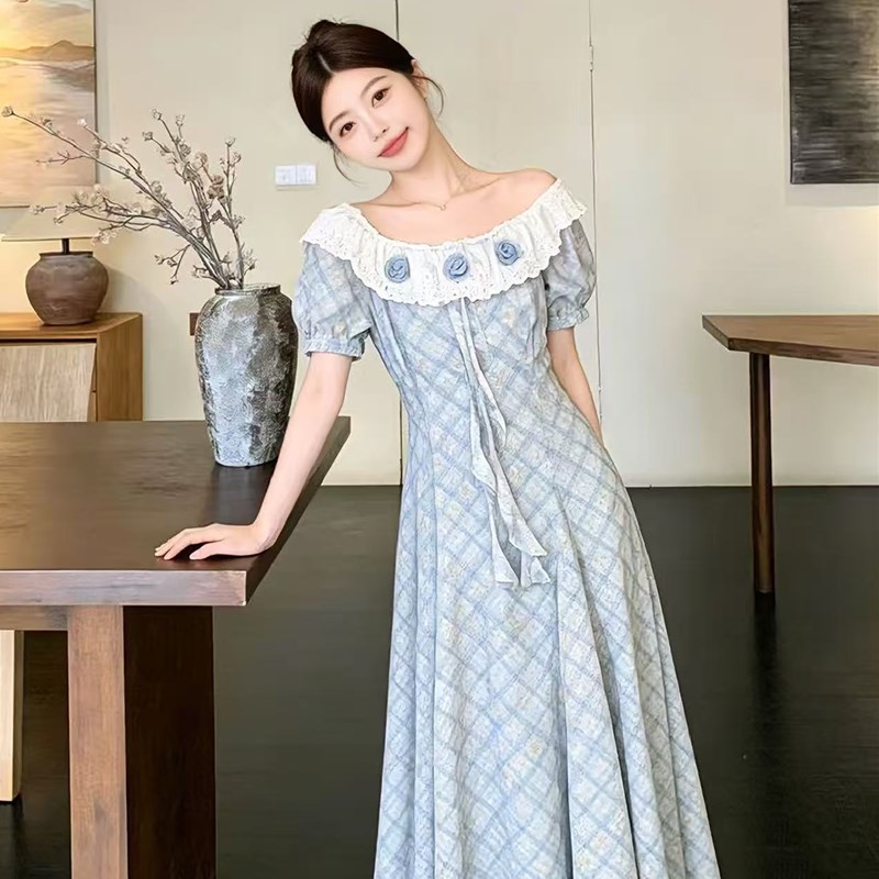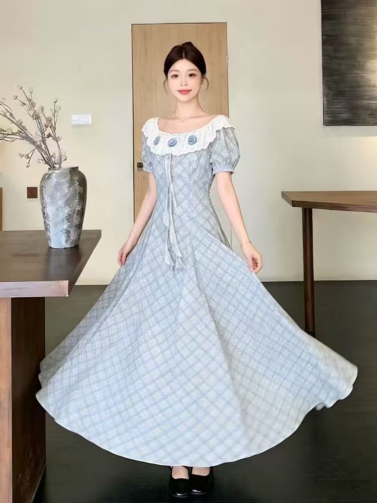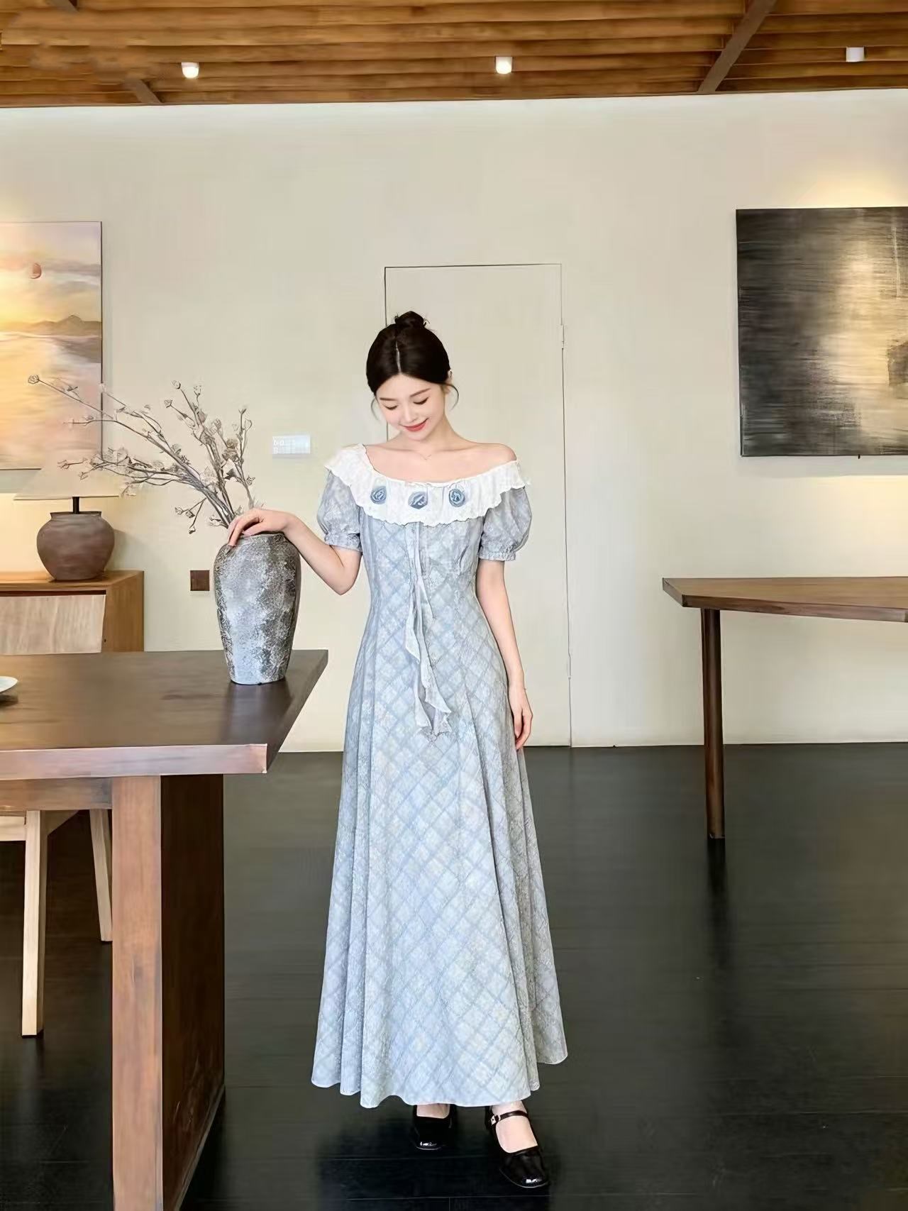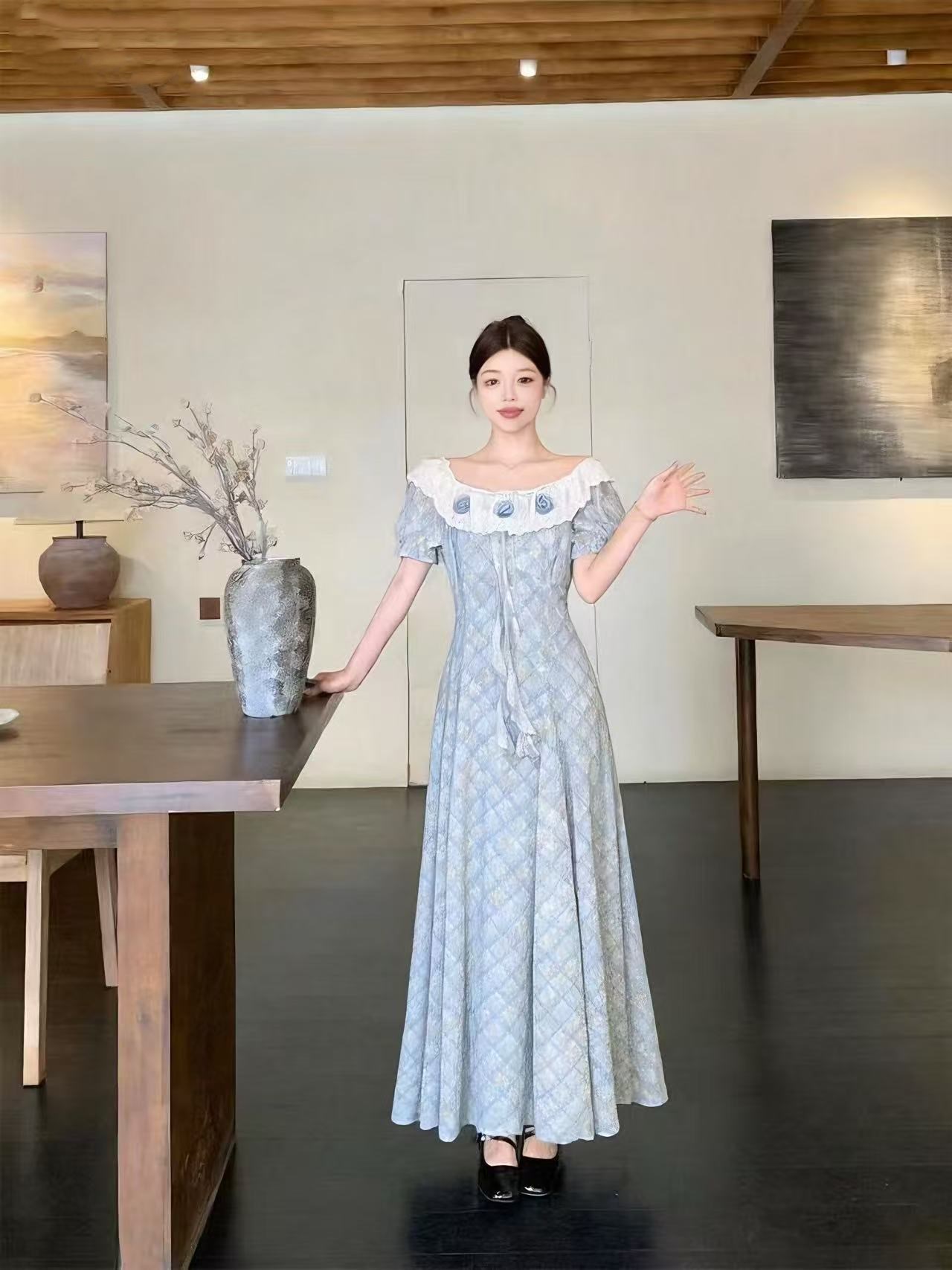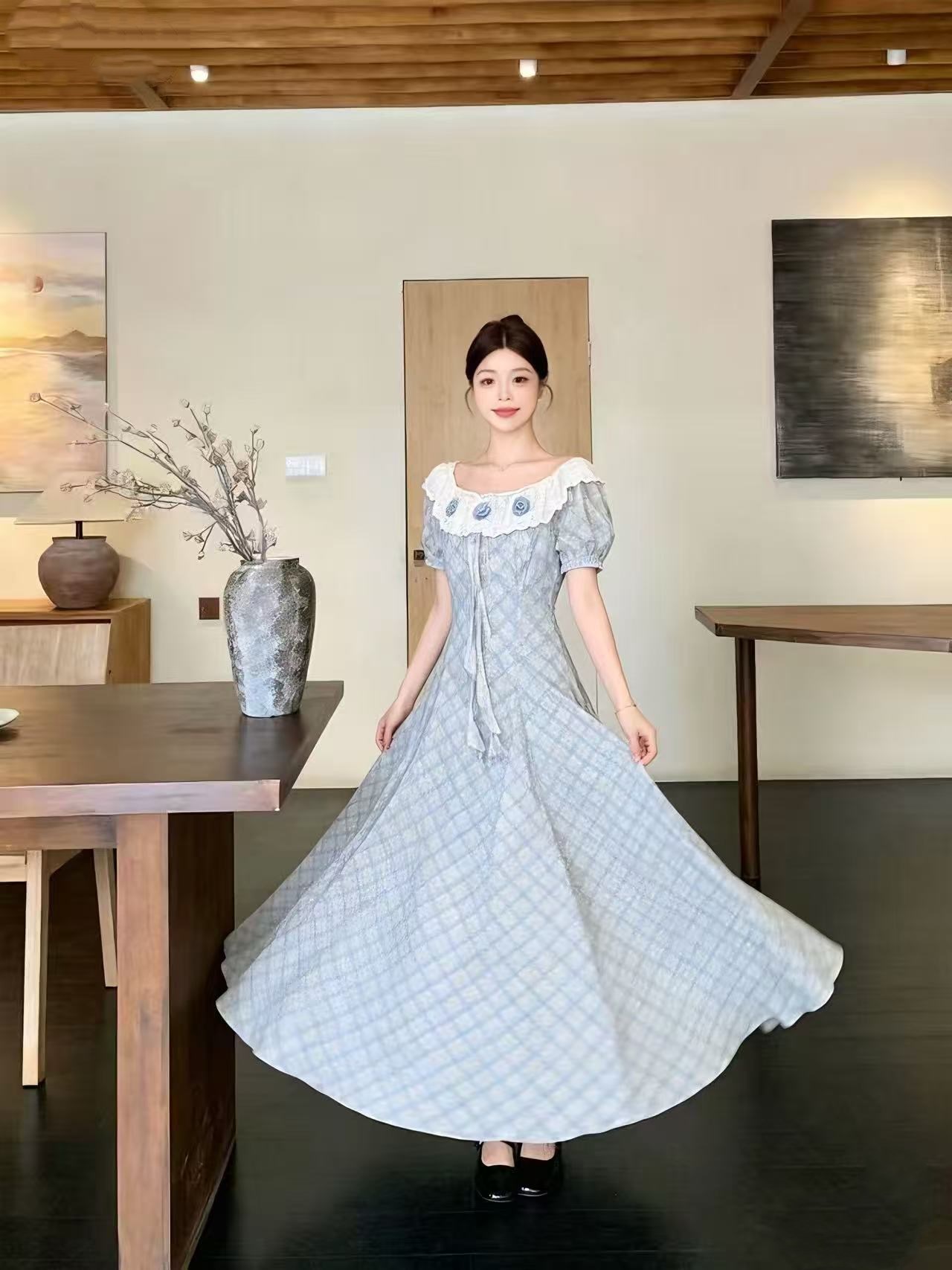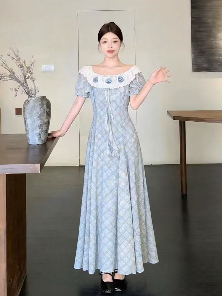 RY3696# 大码女装2026夏季新款设计感度假风碎花蕾丝显瘦短袖长款连衣裙子