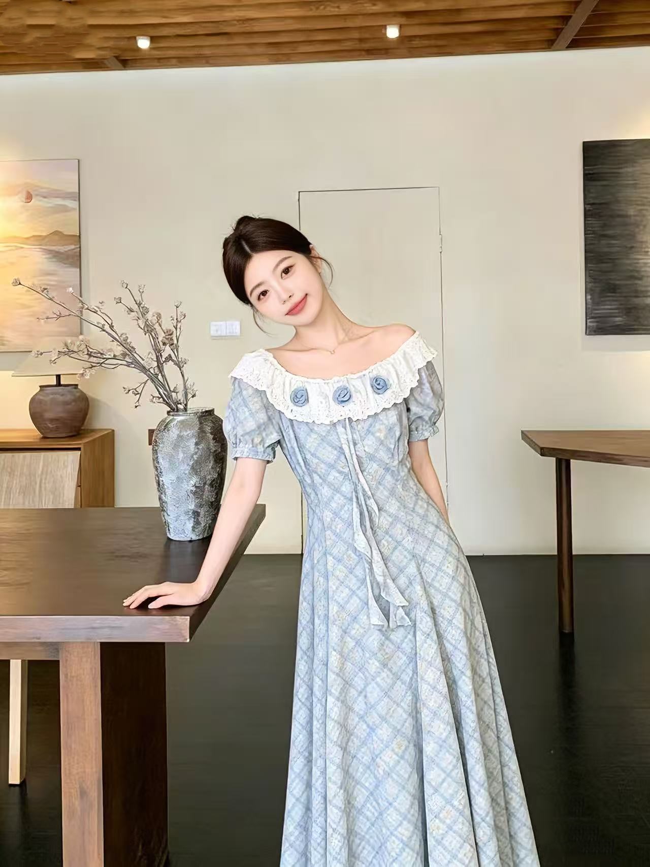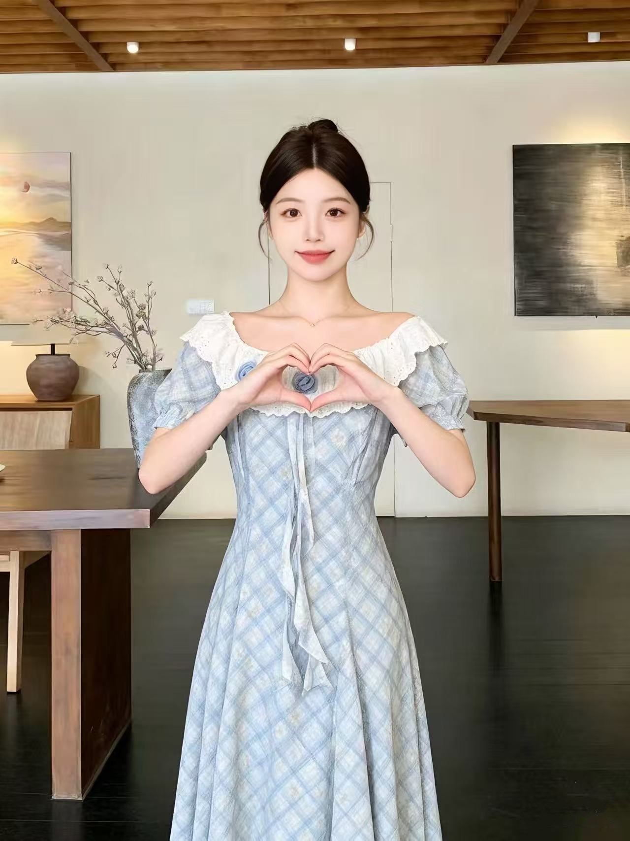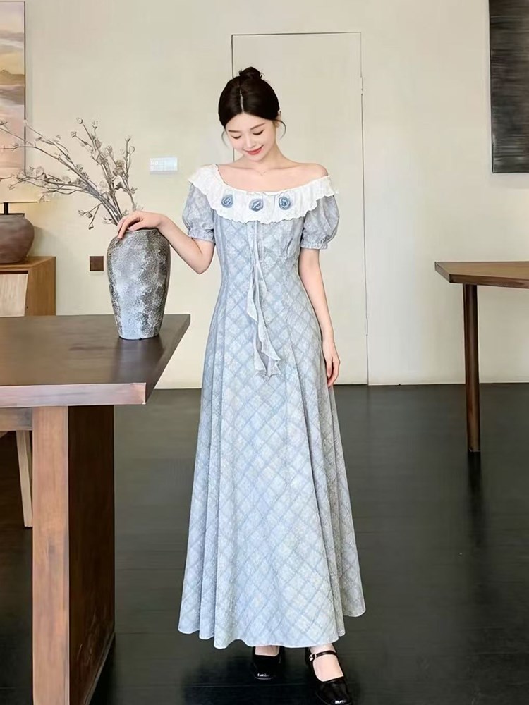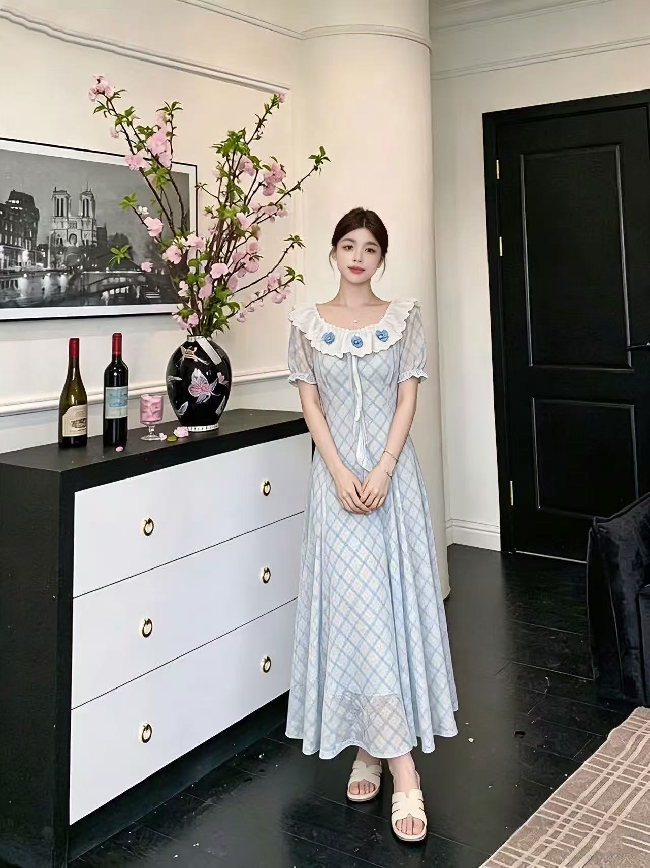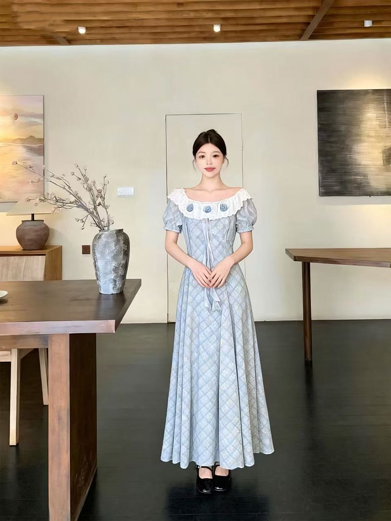 RY3696# 大码女装2026夏季新款设计感度假风碎花蕾丝显瘦短袖长款连衣裙子