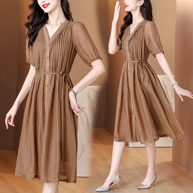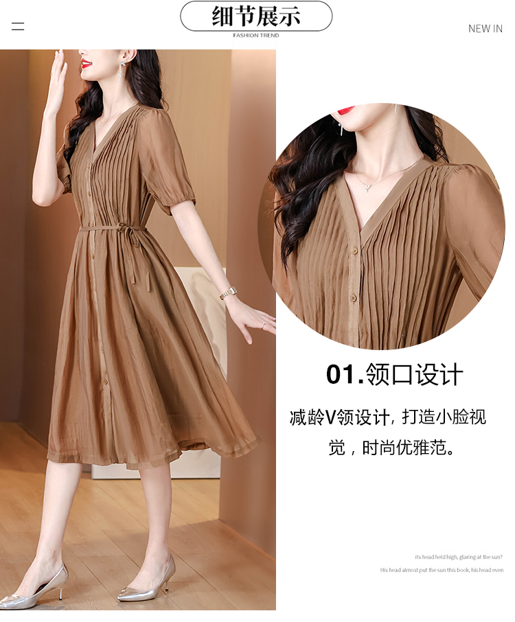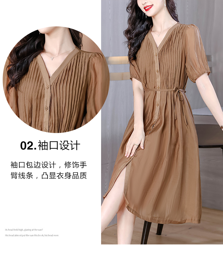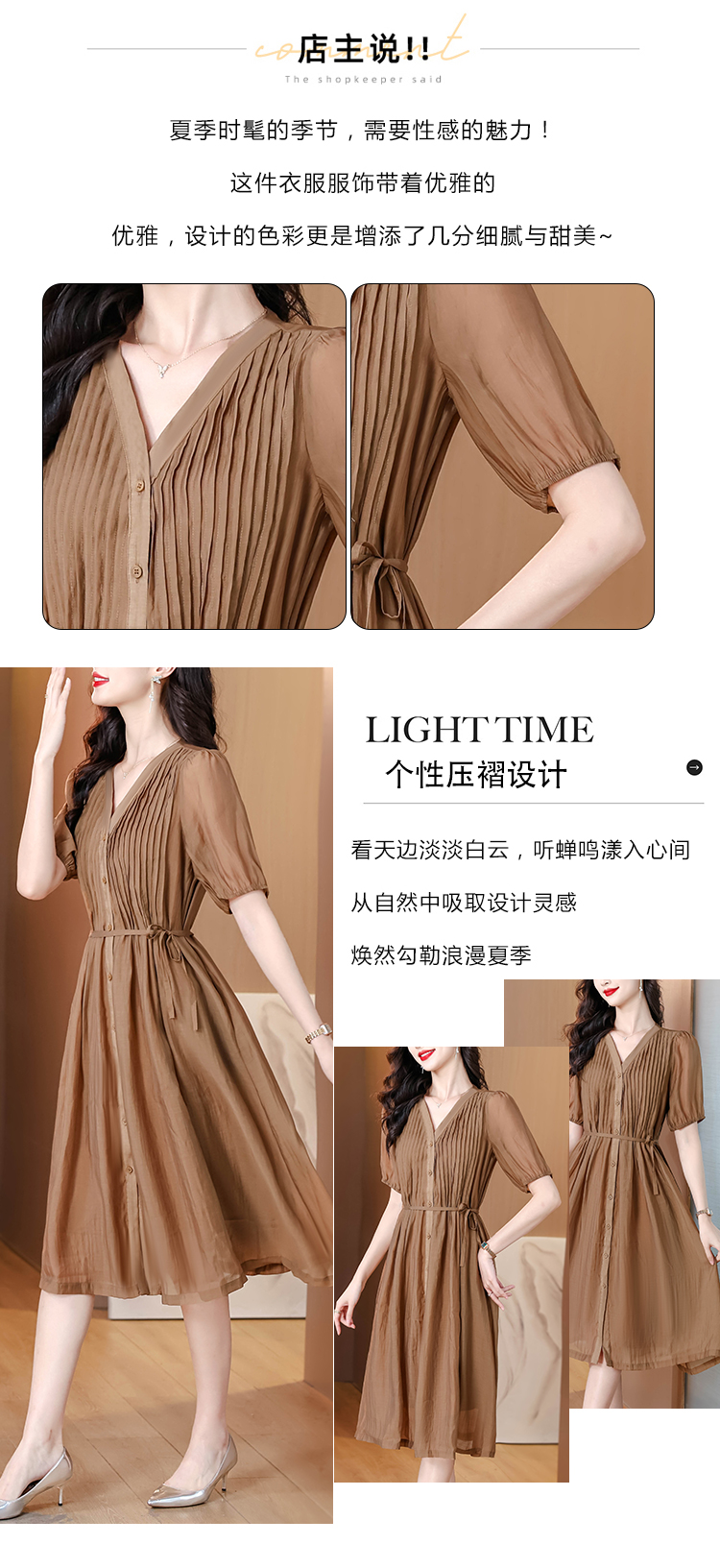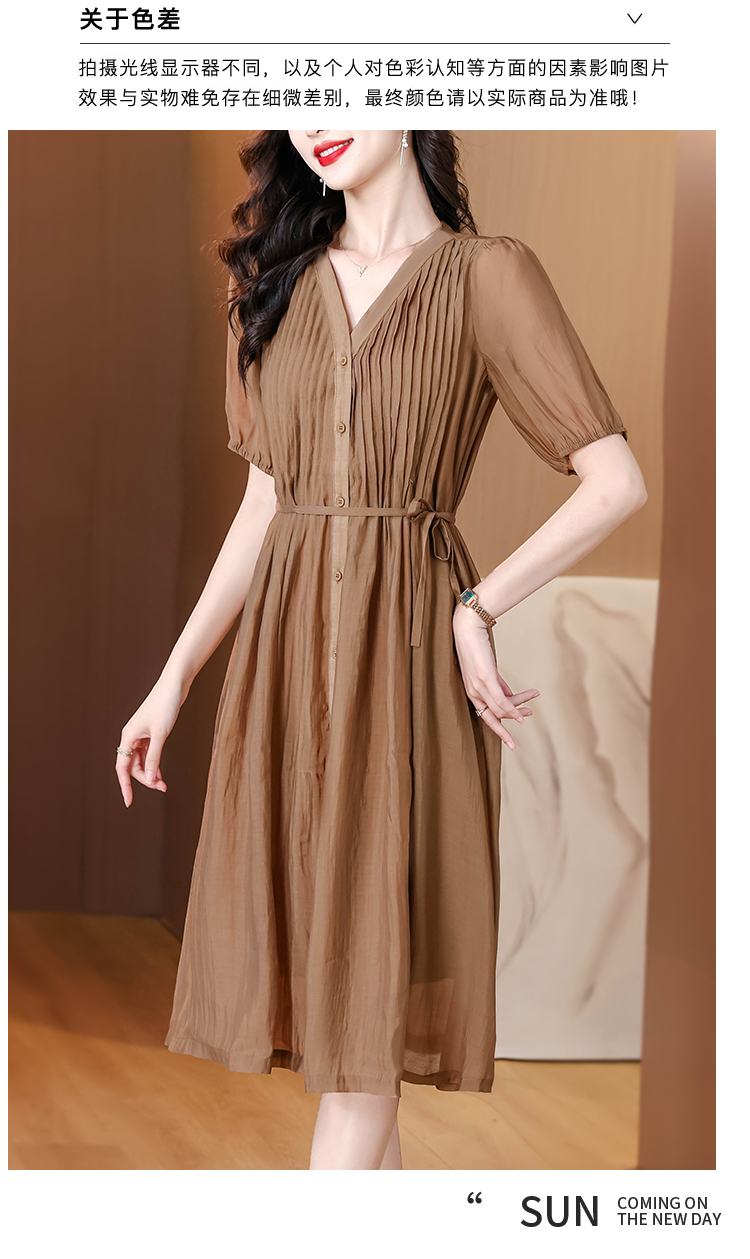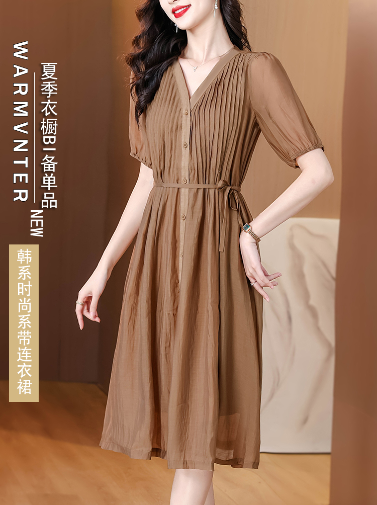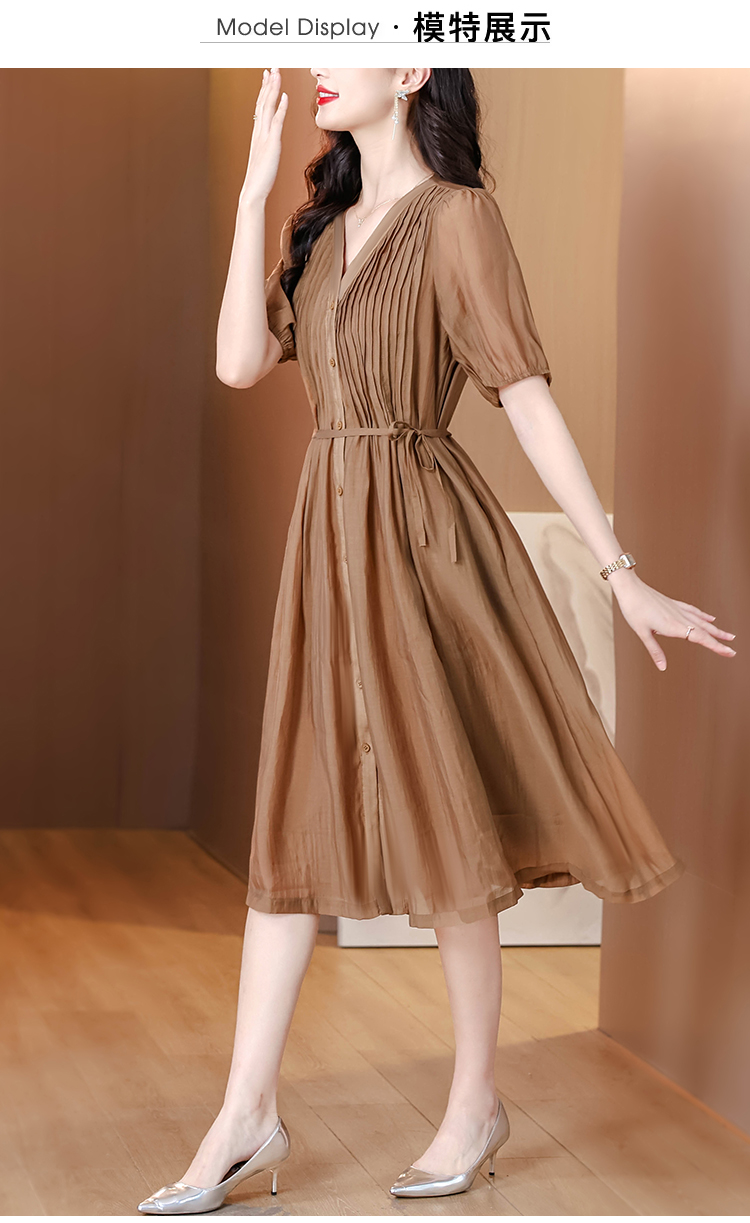RY3700# 时尚褶皱连衣裙女2026夏季新款V领简约长裙欧货减龄女装