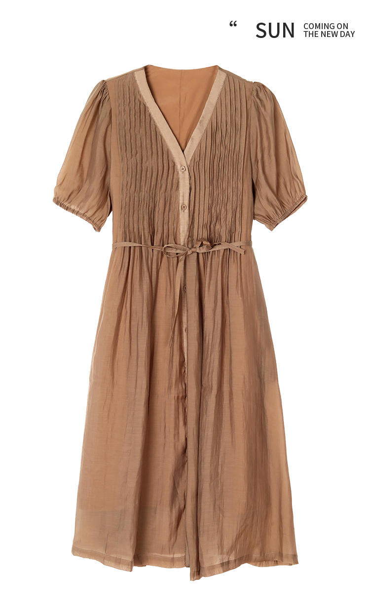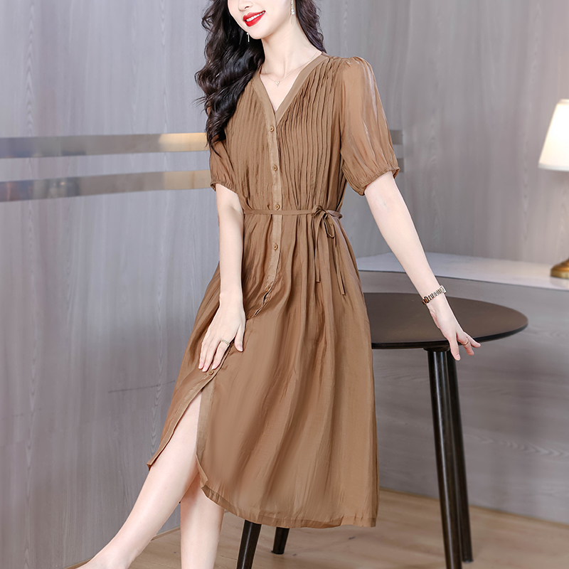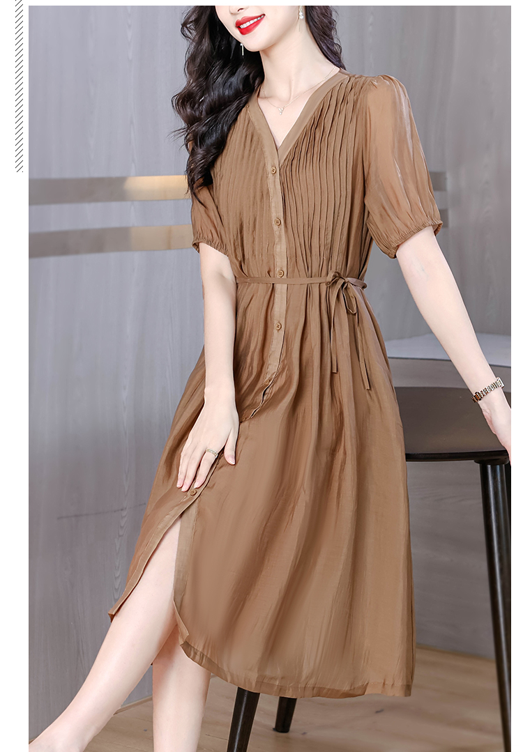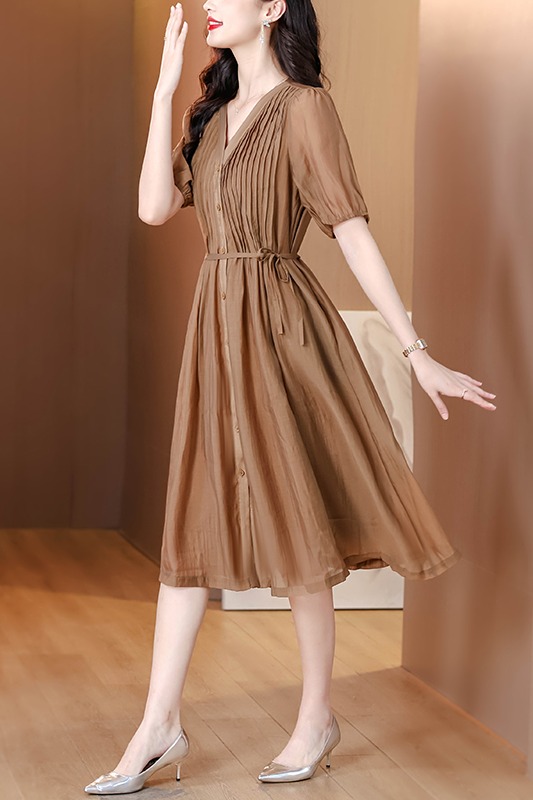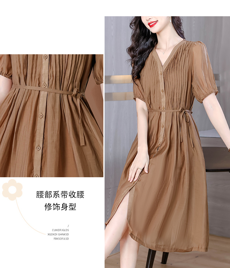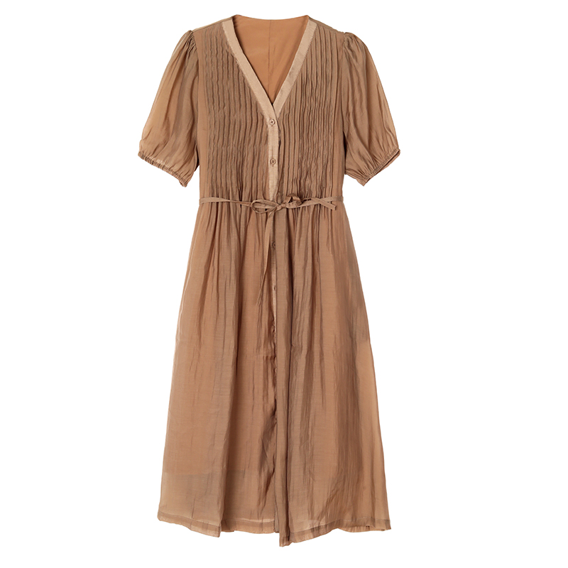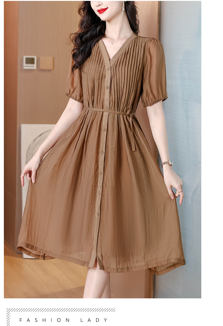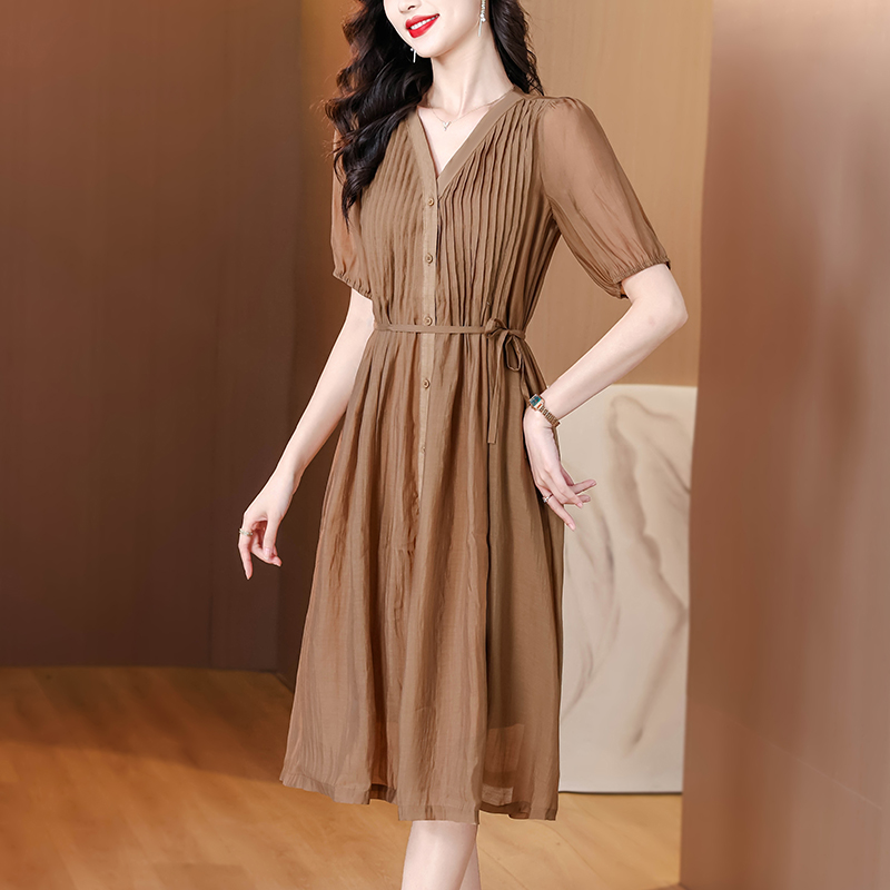 RY3700# 时尚褶皱连衣裙女2026夏季新款V领简约长裙欧货减龄女装