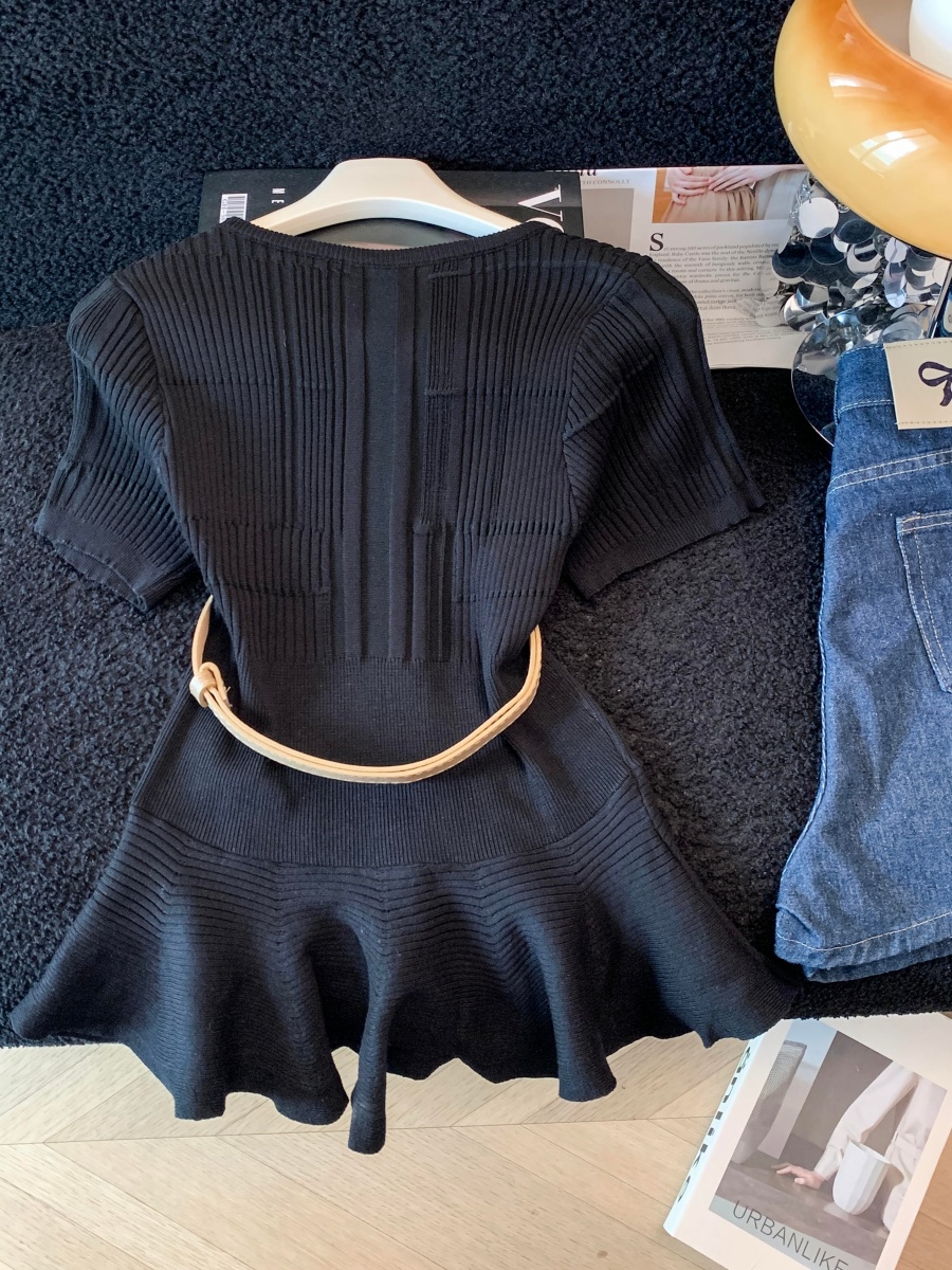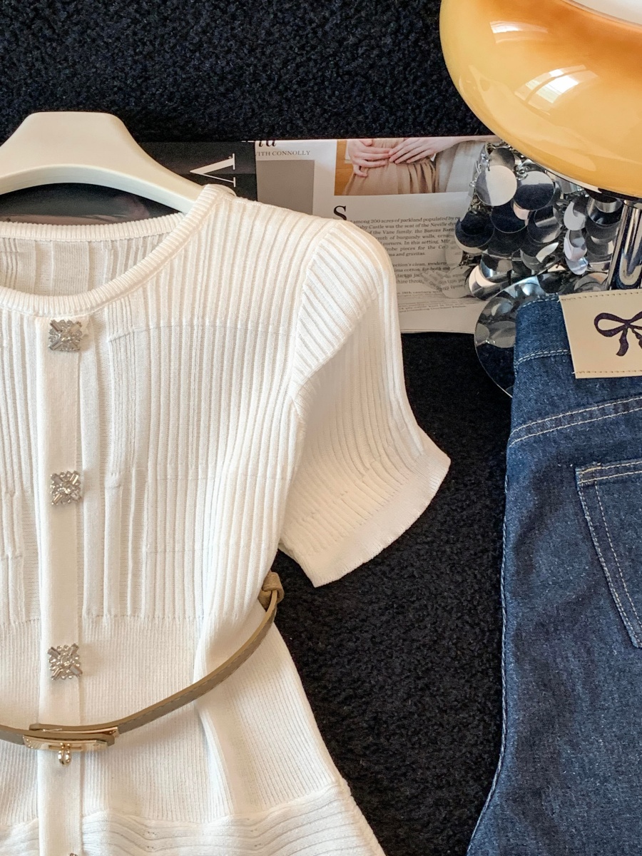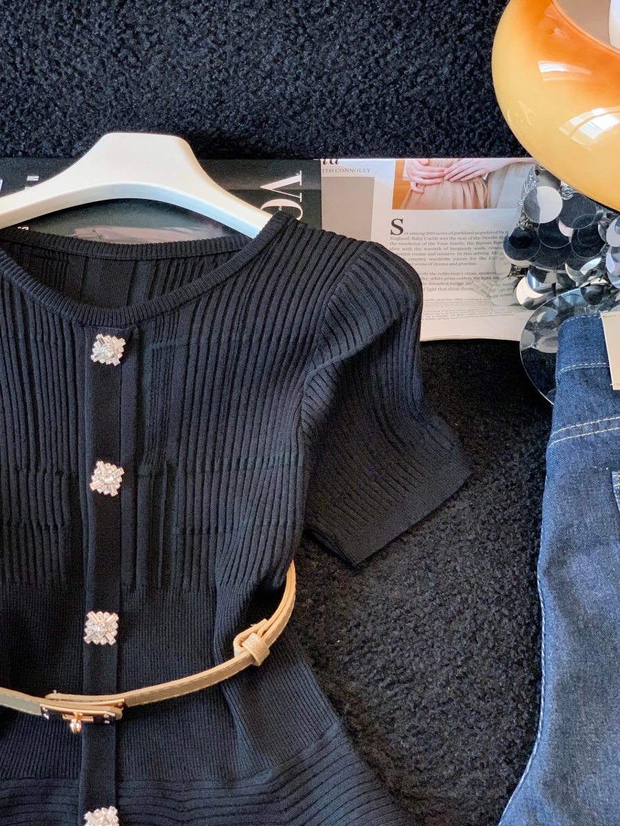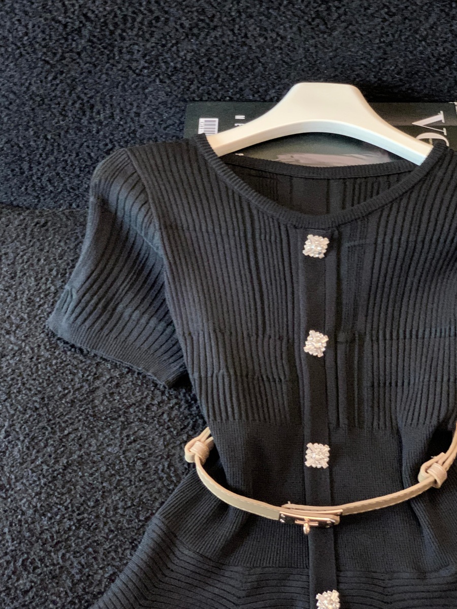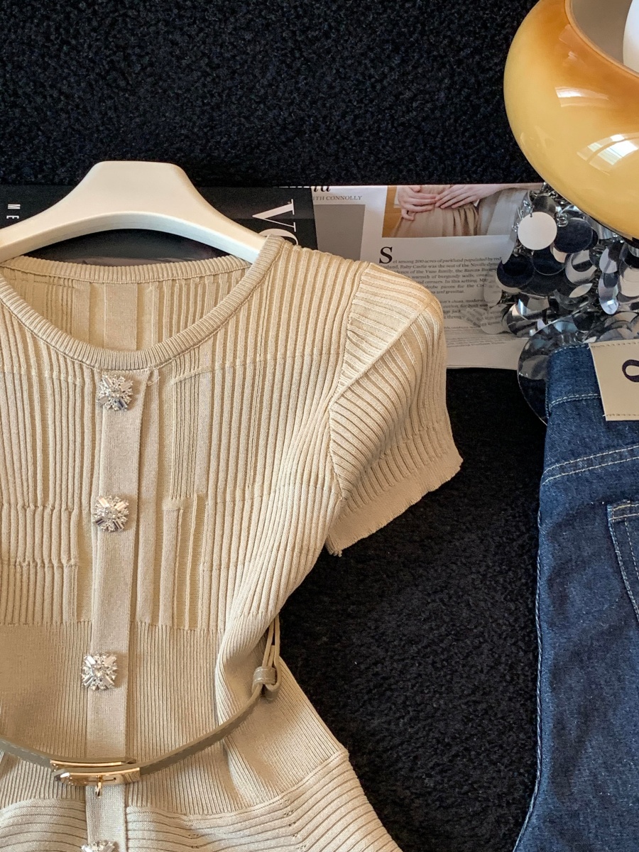 RY3714# 实拍轻奢名媛风针织衫2026新款高级感休闲百搭显瘦短袖上衣带腰带