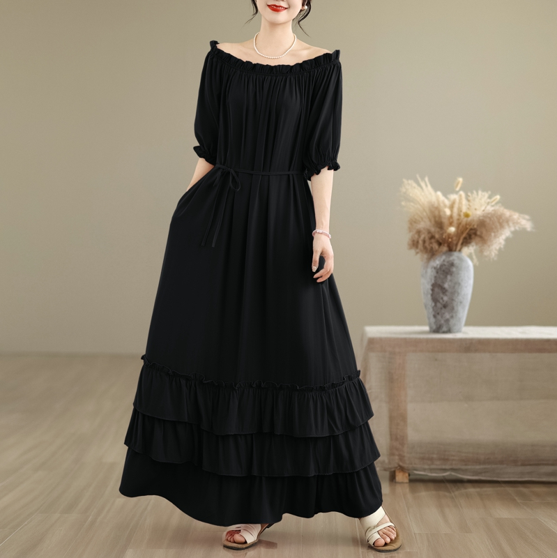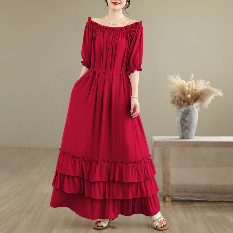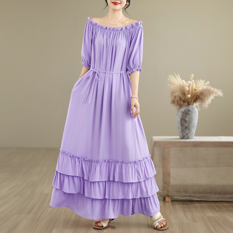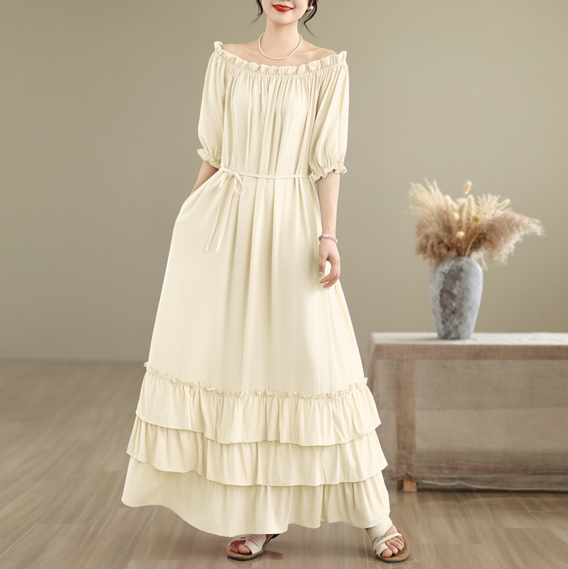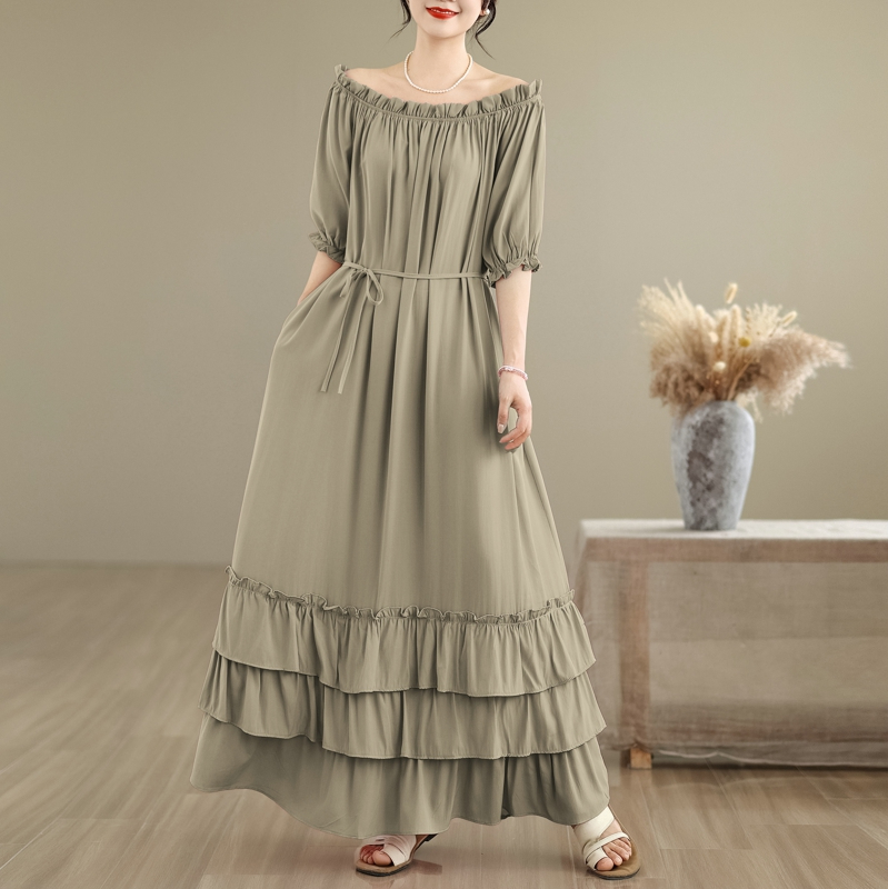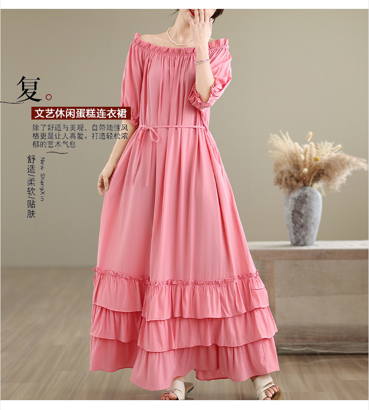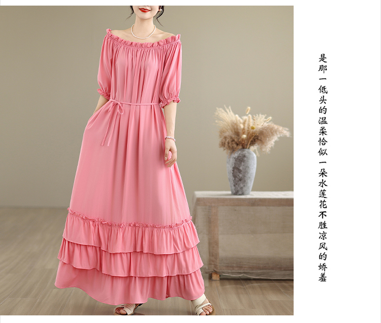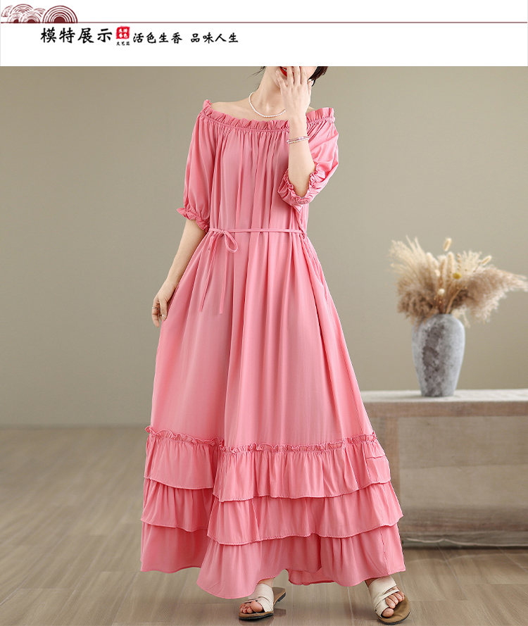 RY3716# 实拍2026新款一字肩宽松系带拼接双层荷叶边休闲连衣裙