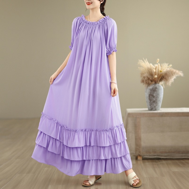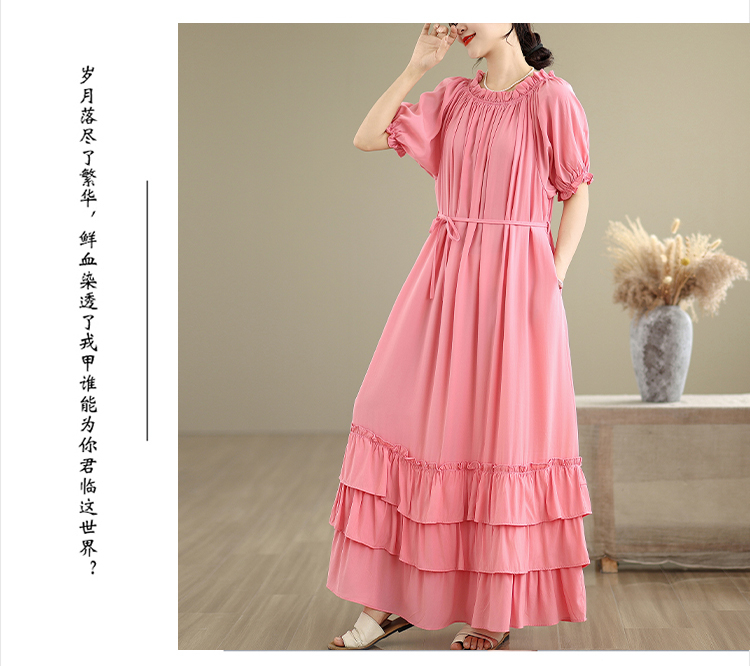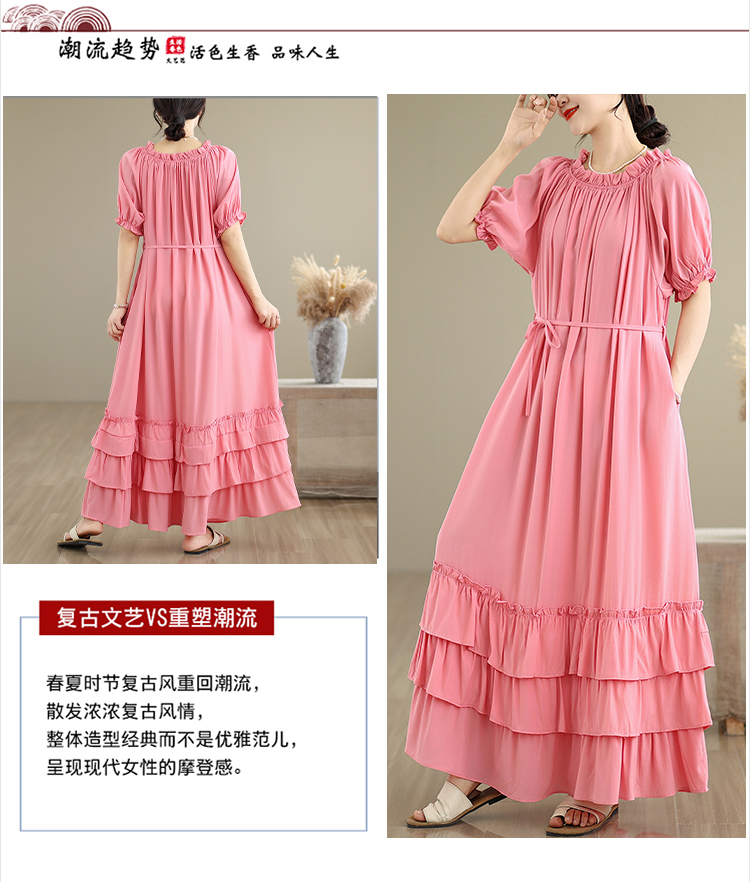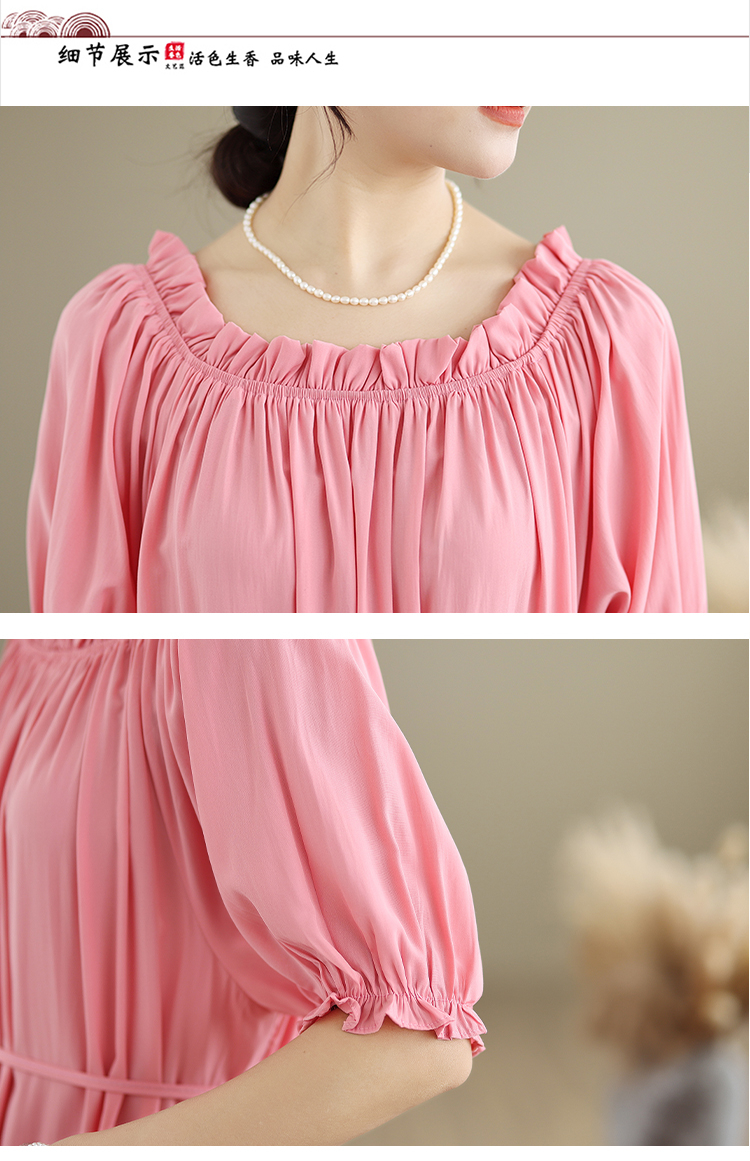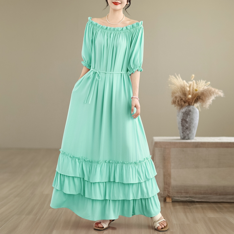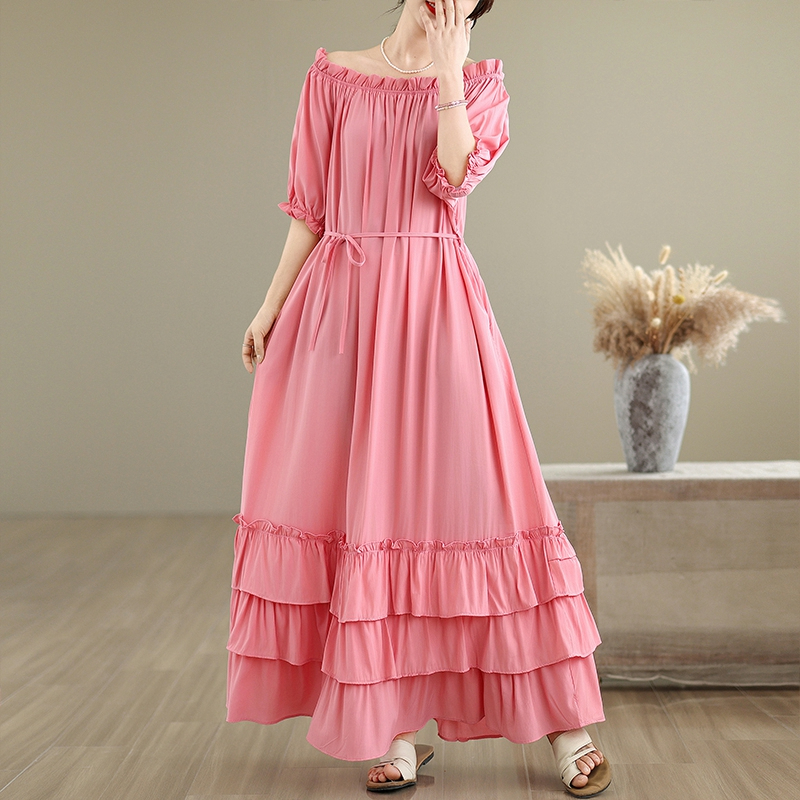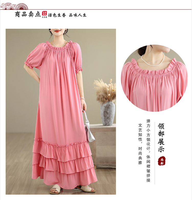 RY3716# 实拍2026新款一字肩宽松系带拼接双层荷叶边休闲连衣裙