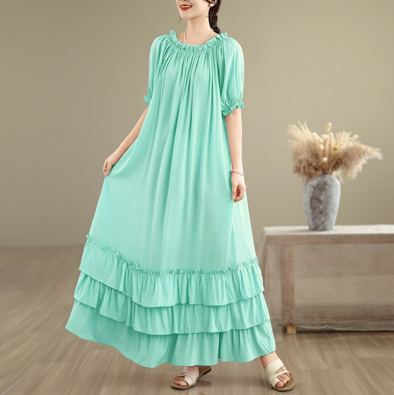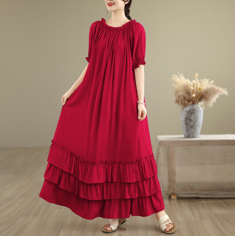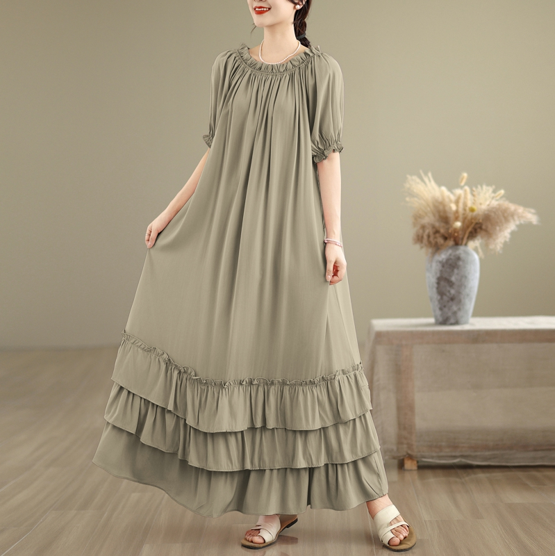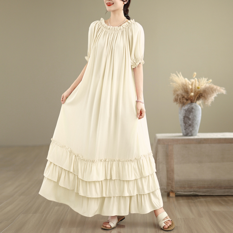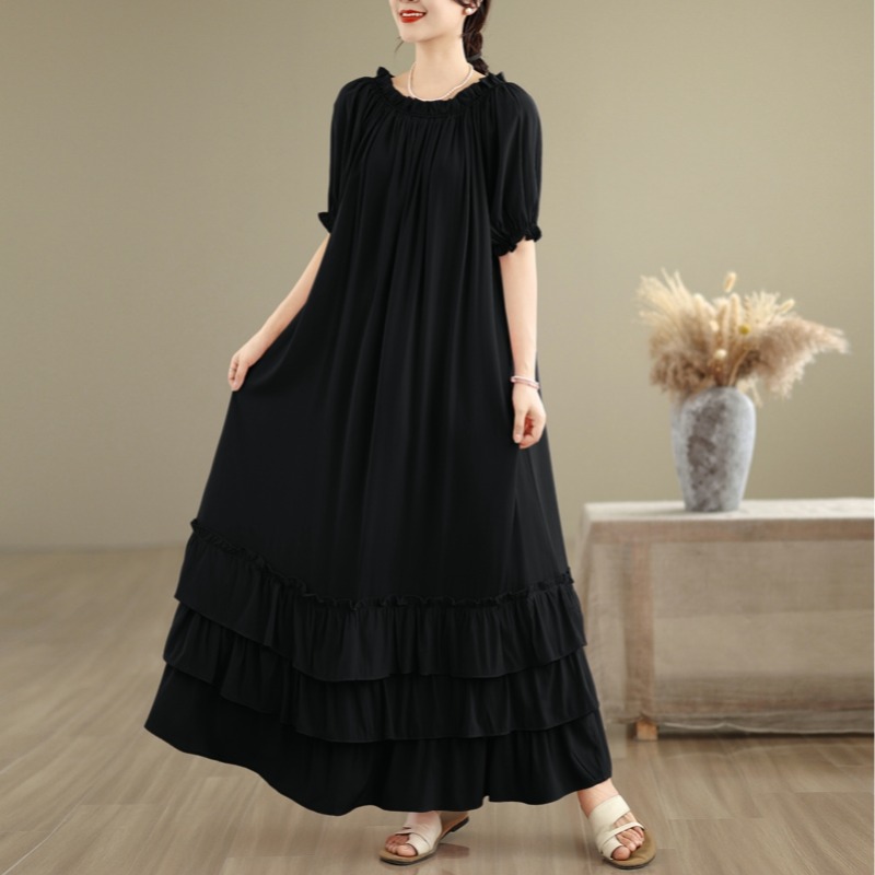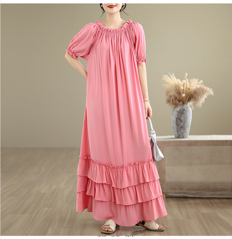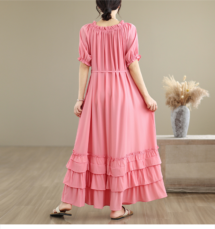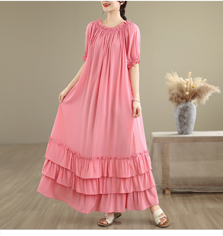 RY3716# 实拍2026新款一字肩宽松系带拼接双层荷叶边休闲连衣裙