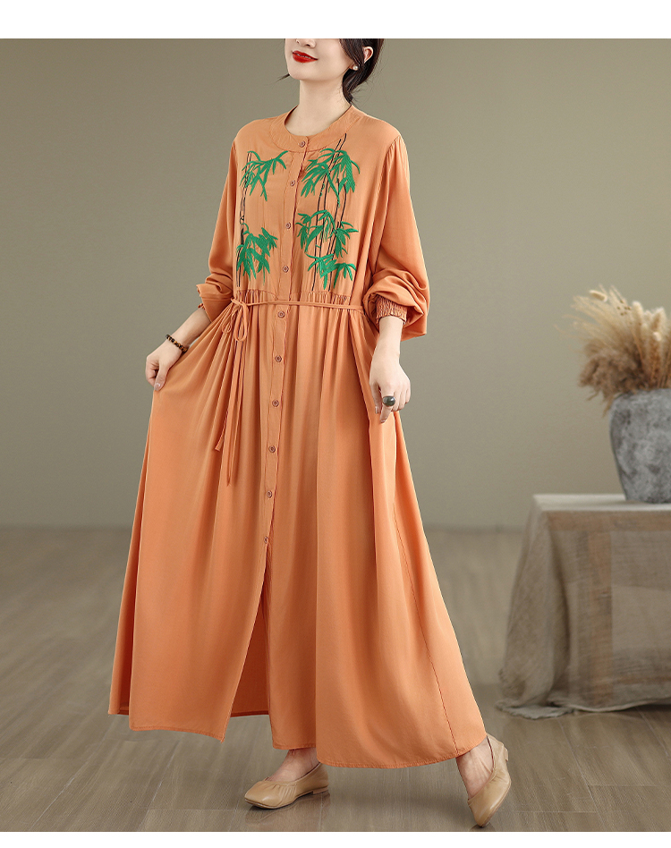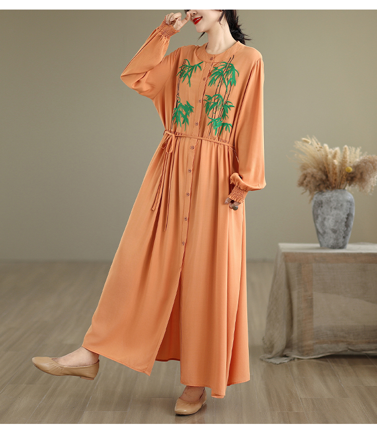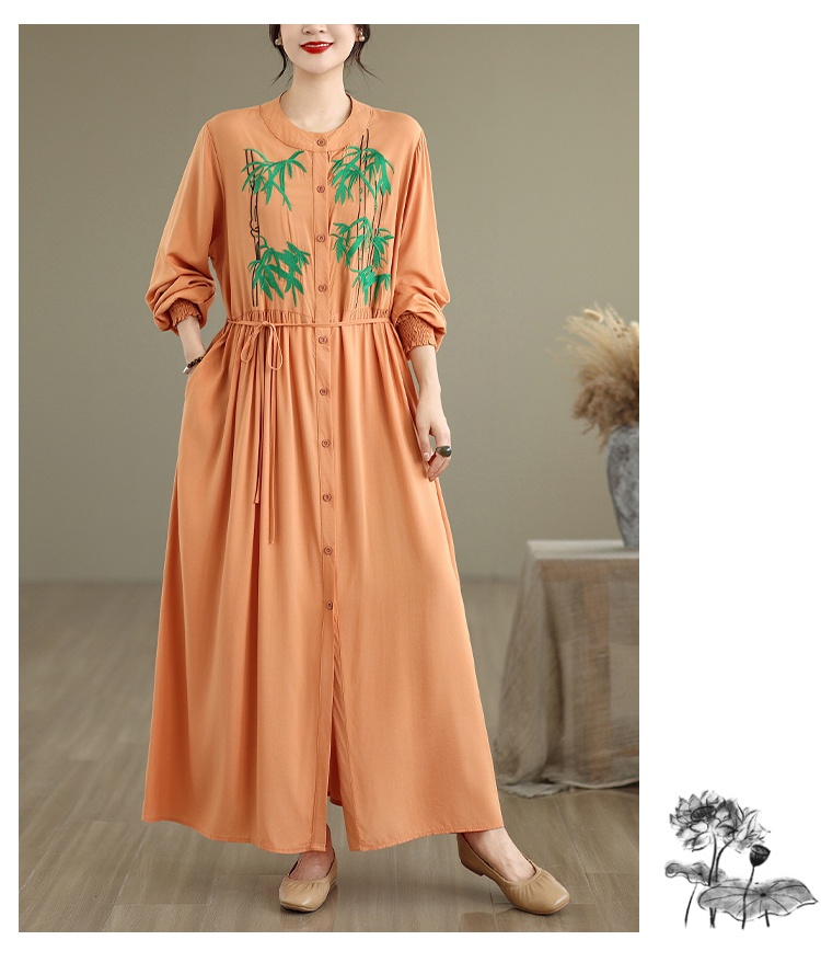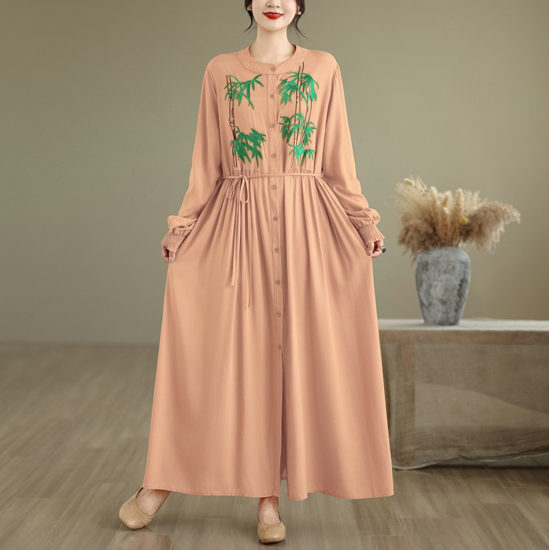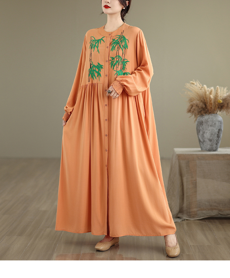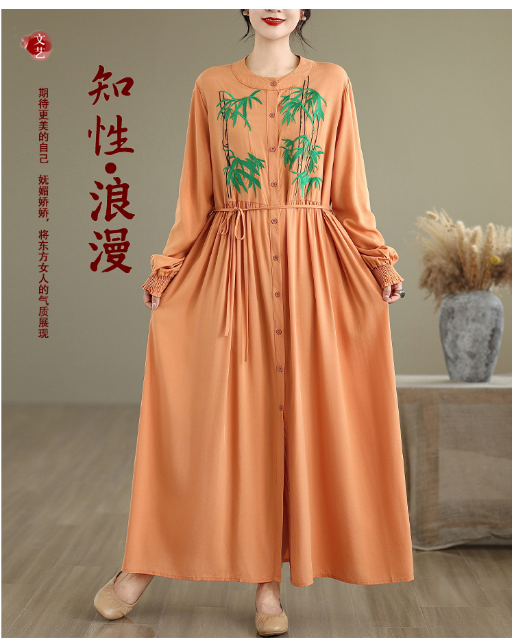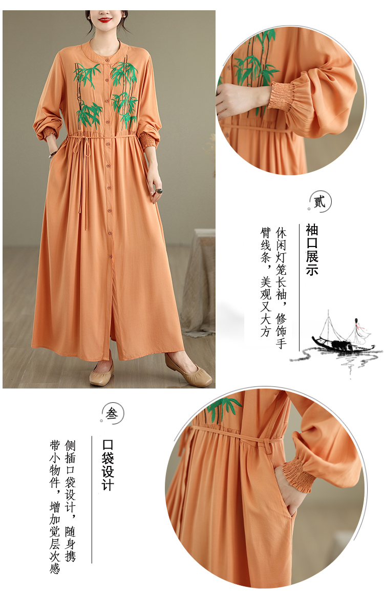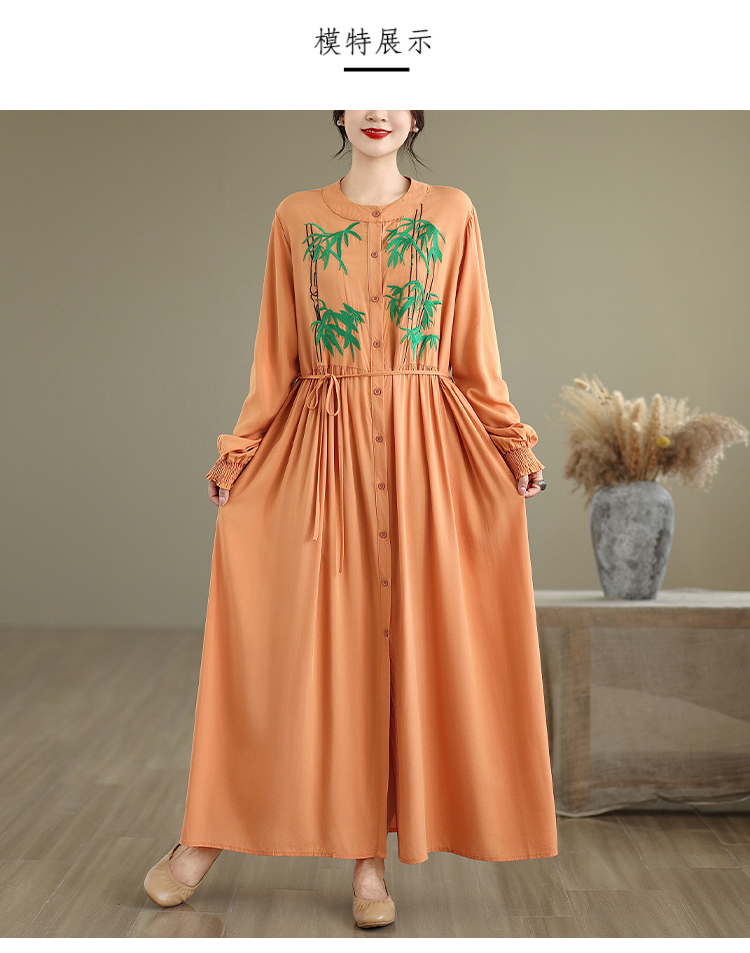 RY3718# 实拍2026胖mm复古绣花单排扣长袖宽松长款连衣裙女
