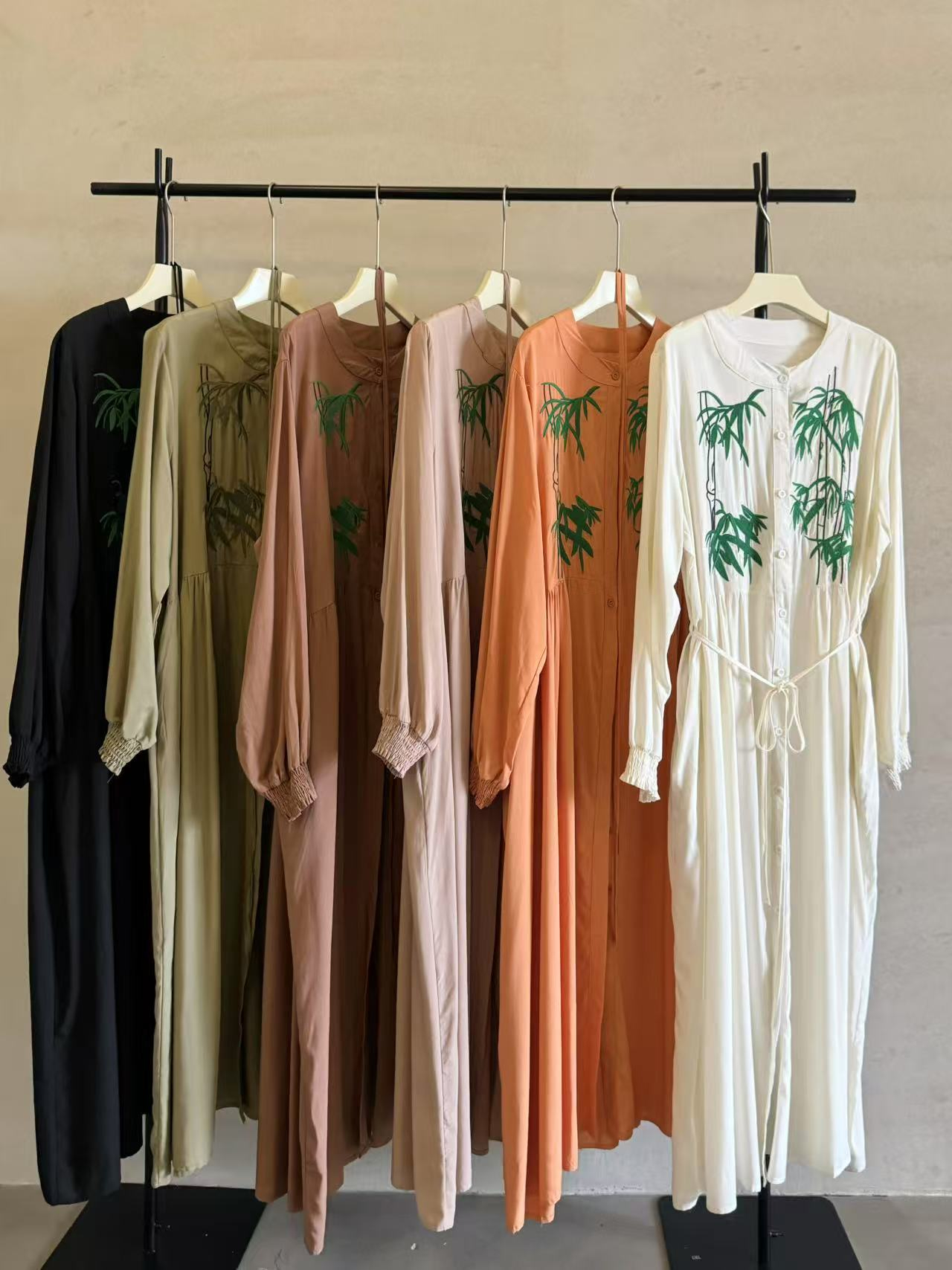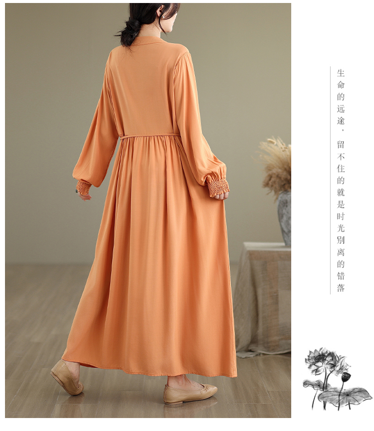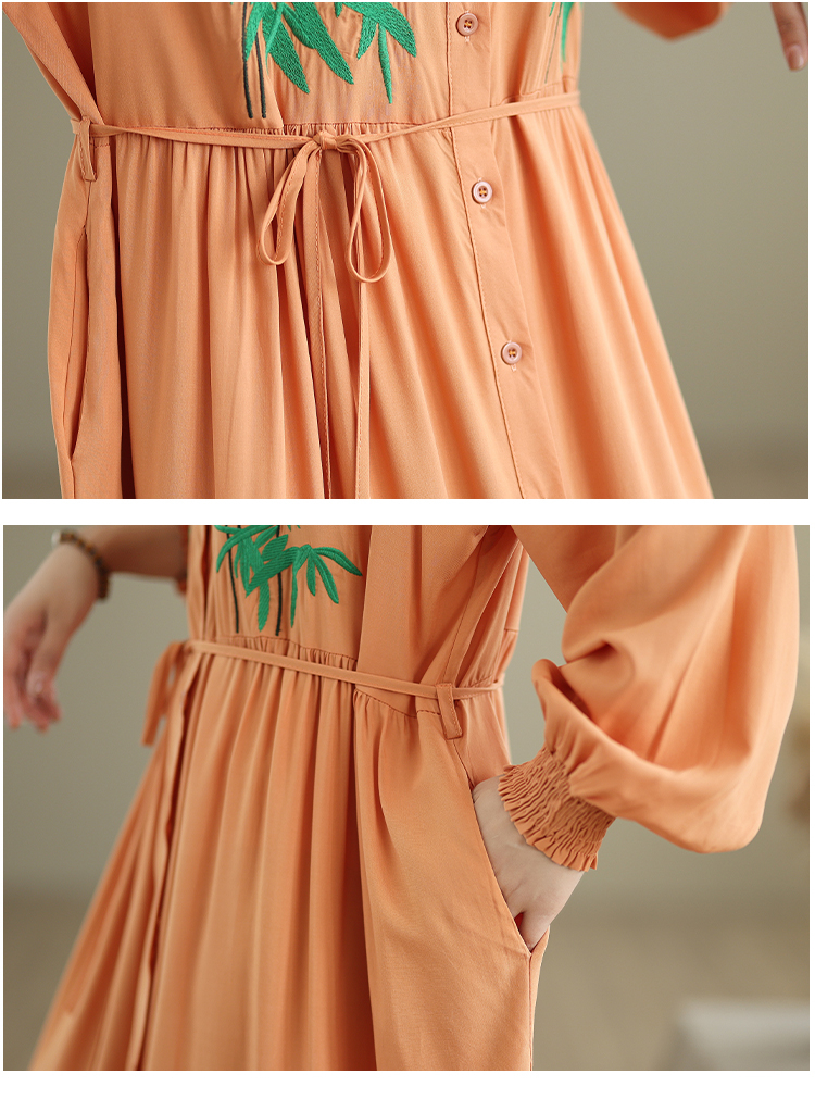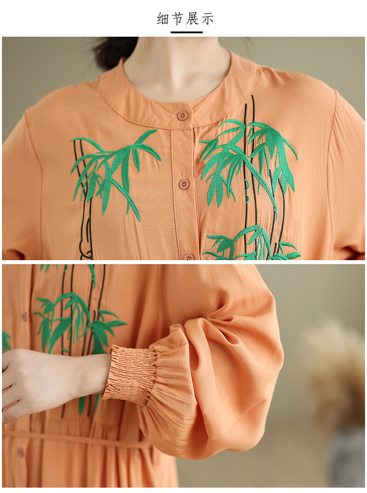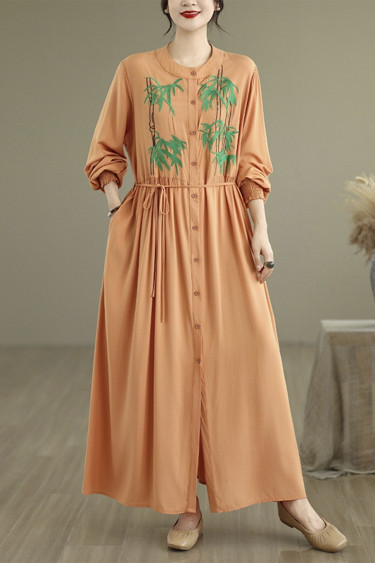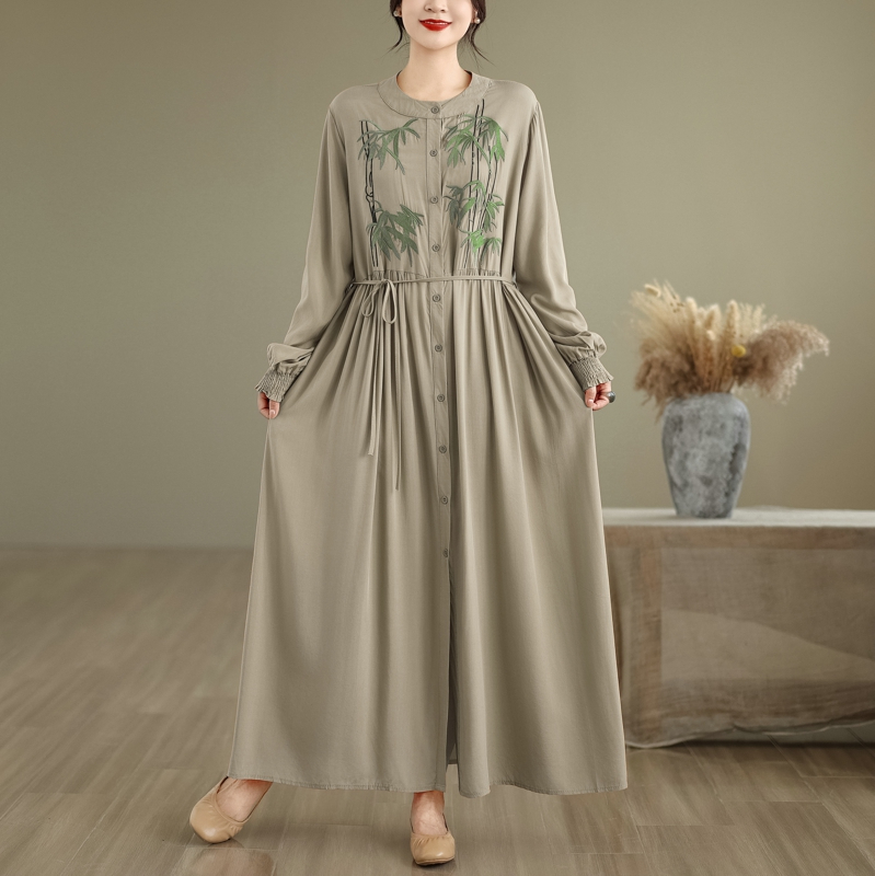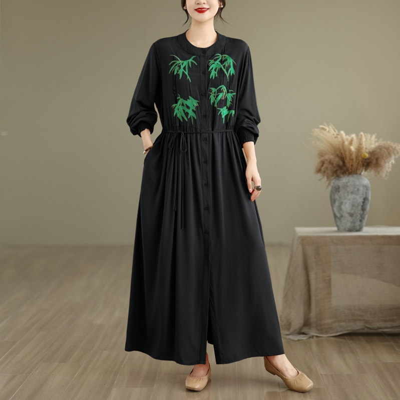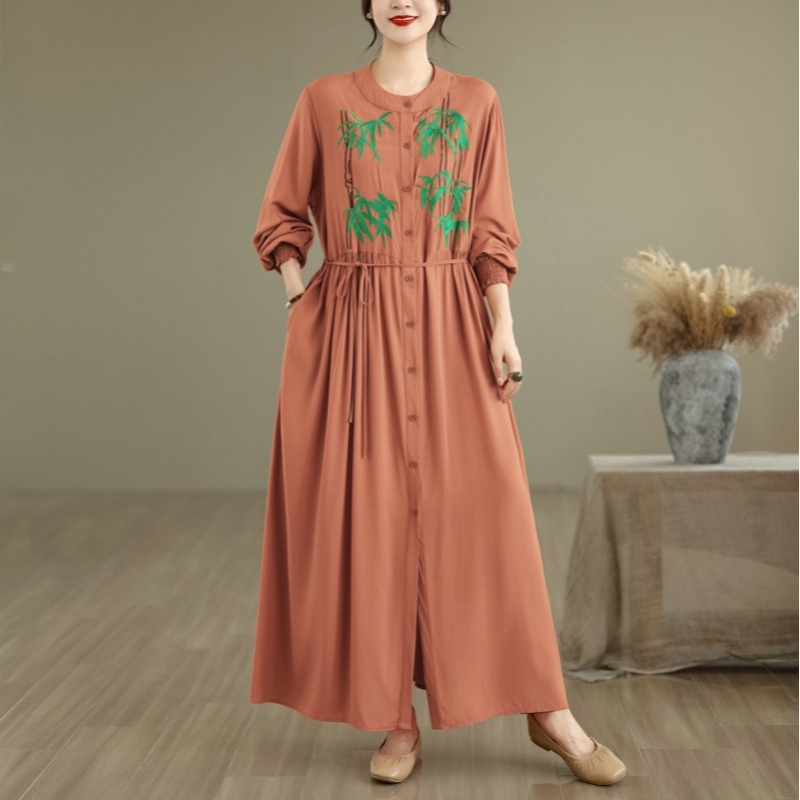 RY3718# 实拍2026胖mm复古绣花单排扣长袖宽松长款连衣裙女