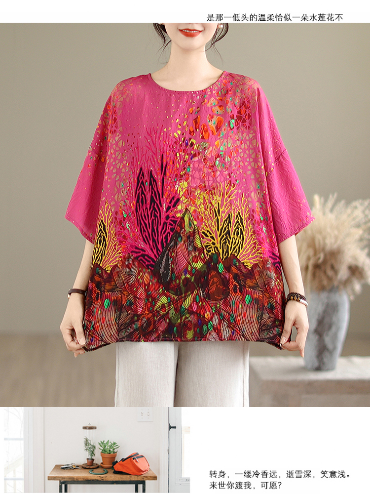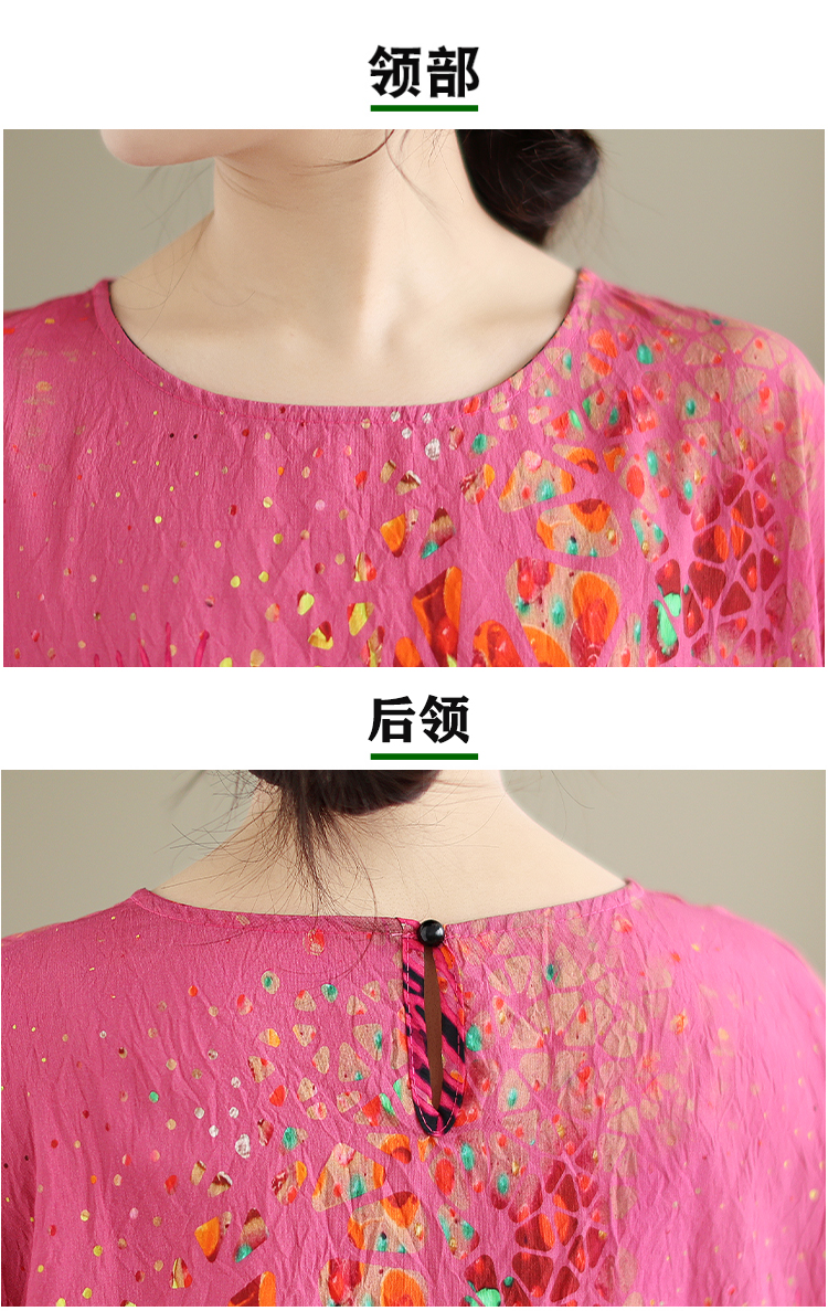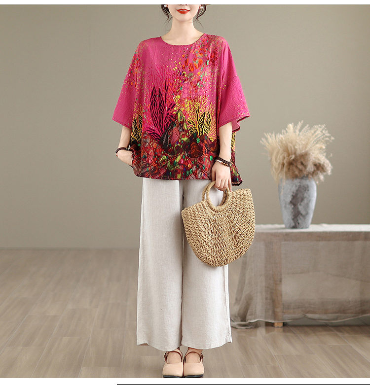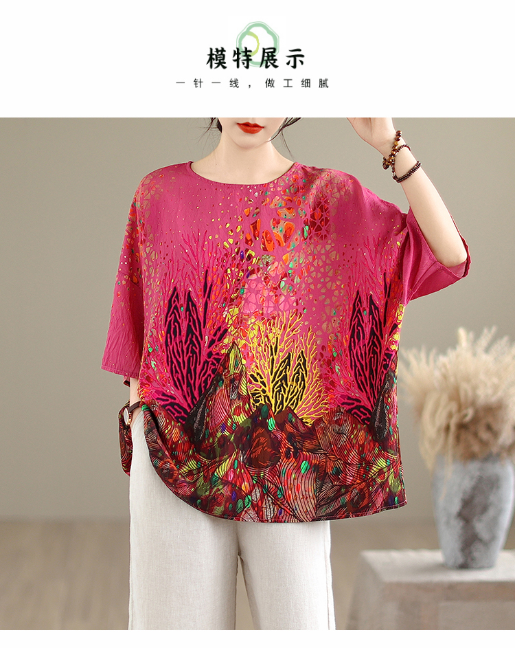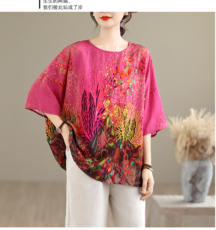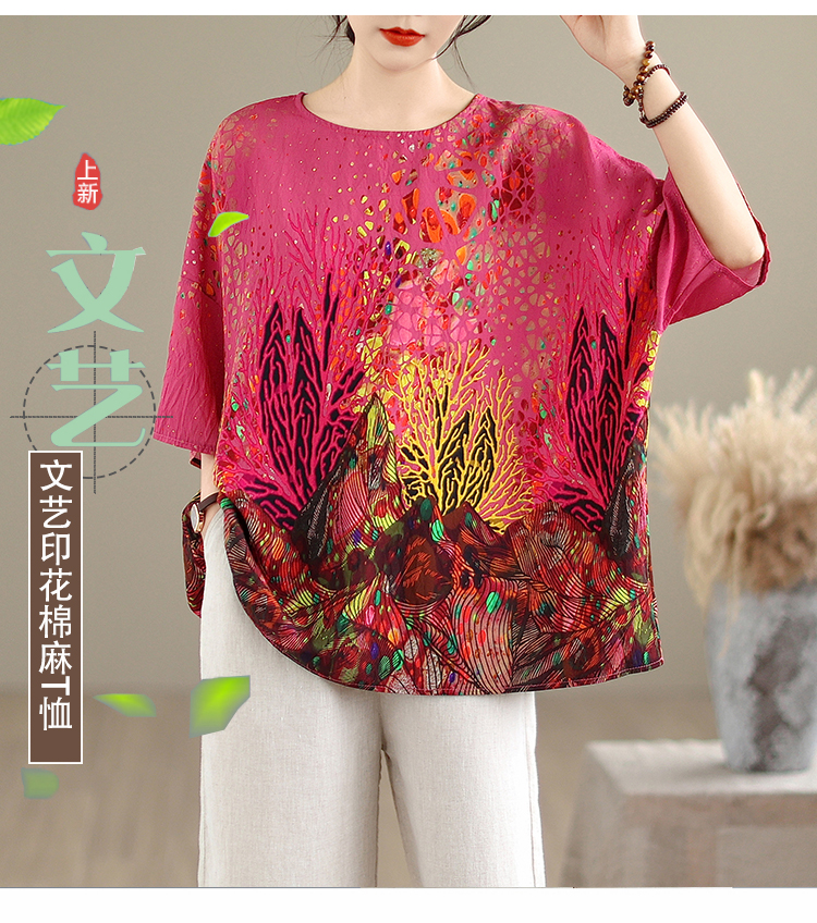 RY3727# 实拍2026夏季新品麻棉民族风蝙蝠袖宽松大码圆领T恤女
