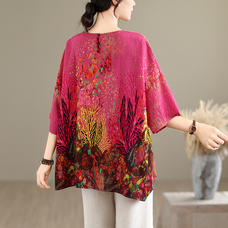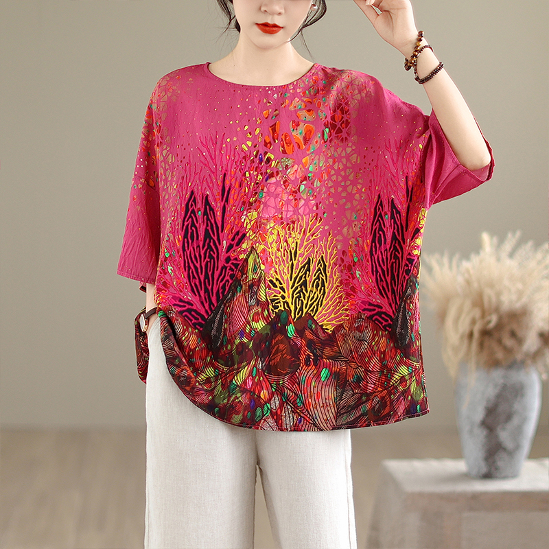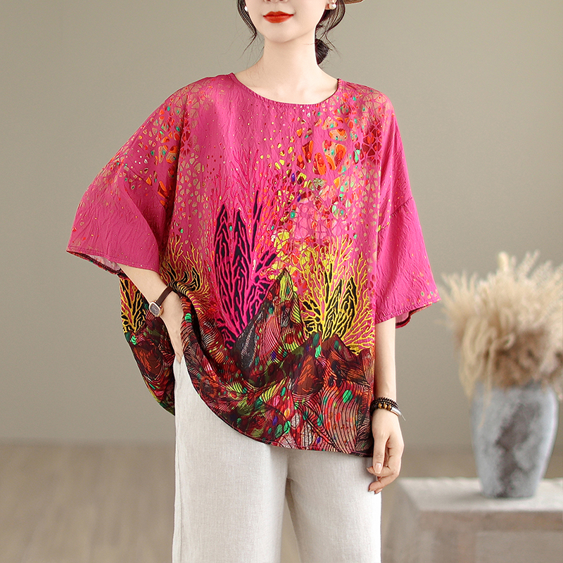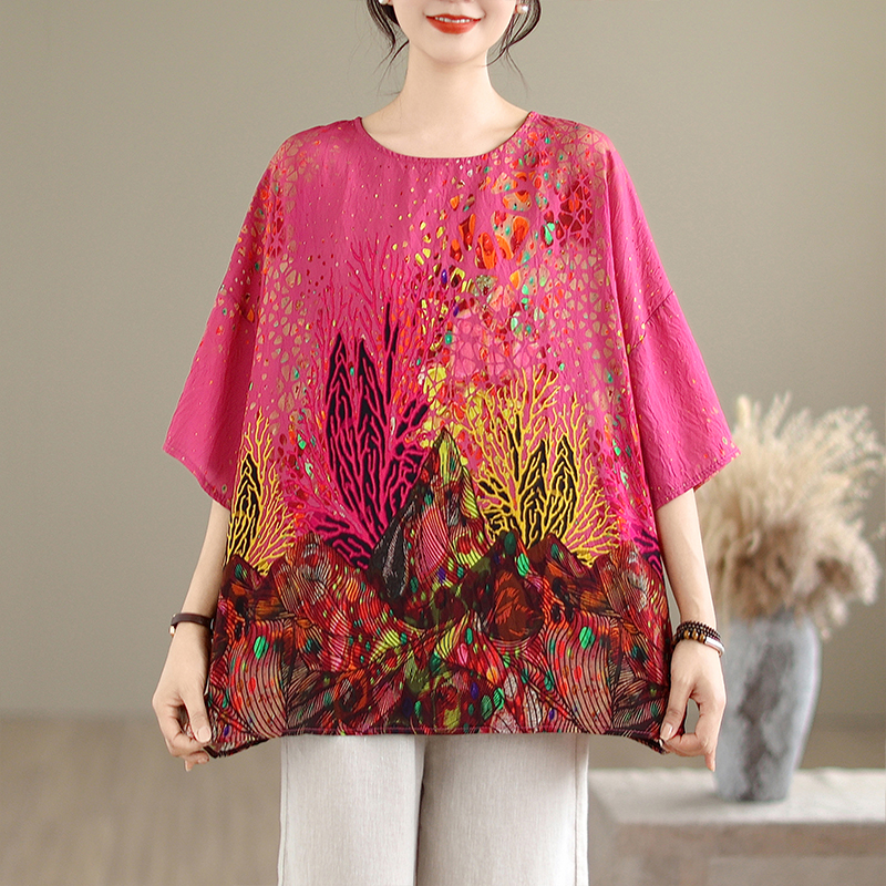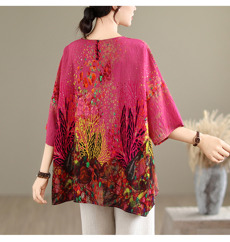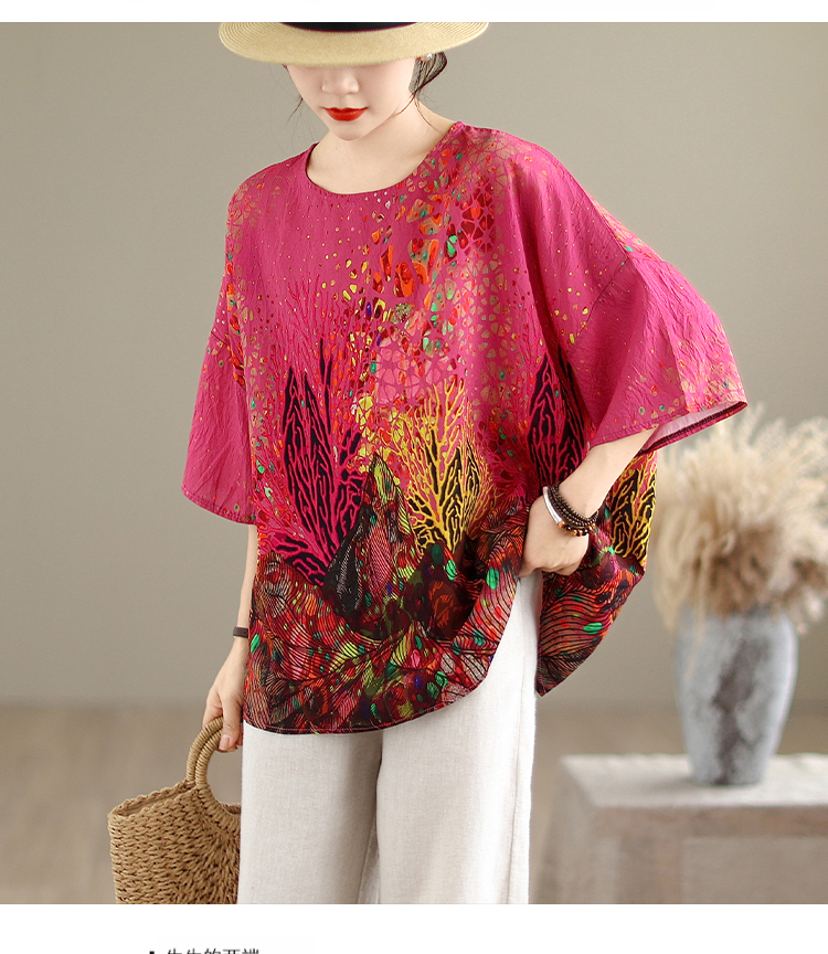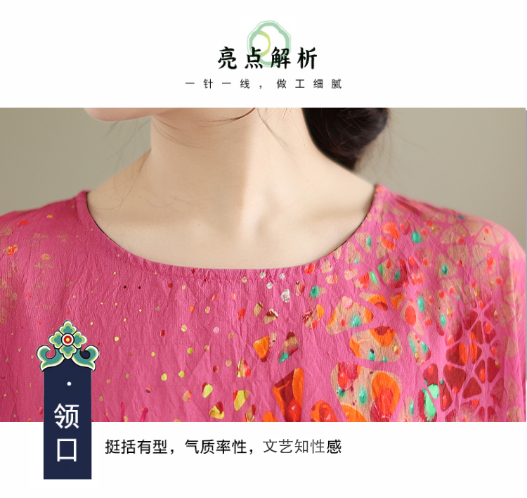 RY3727# 实拍2026夏季新品麻棉民族风蝙蝠袖宽松大码圆领T恤女