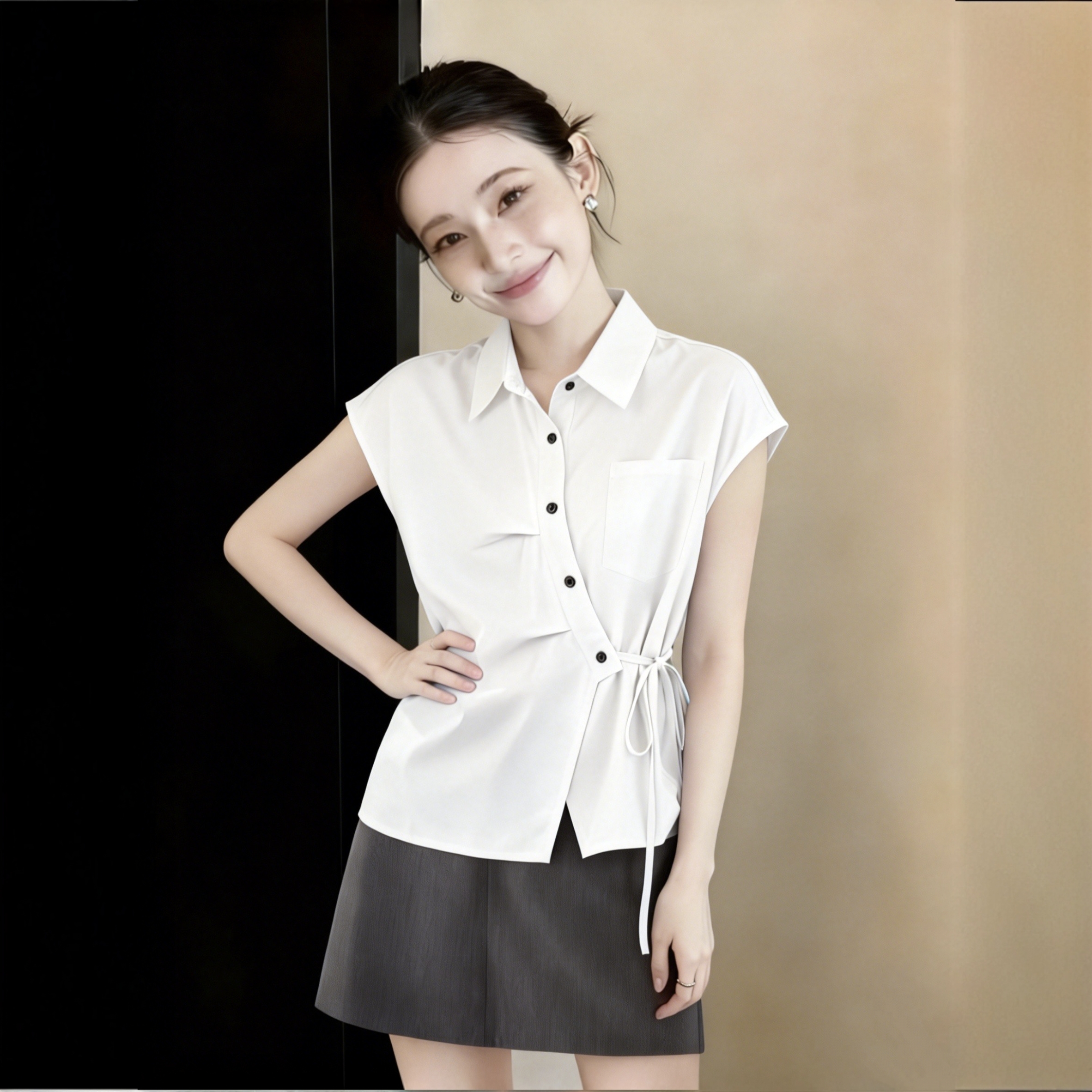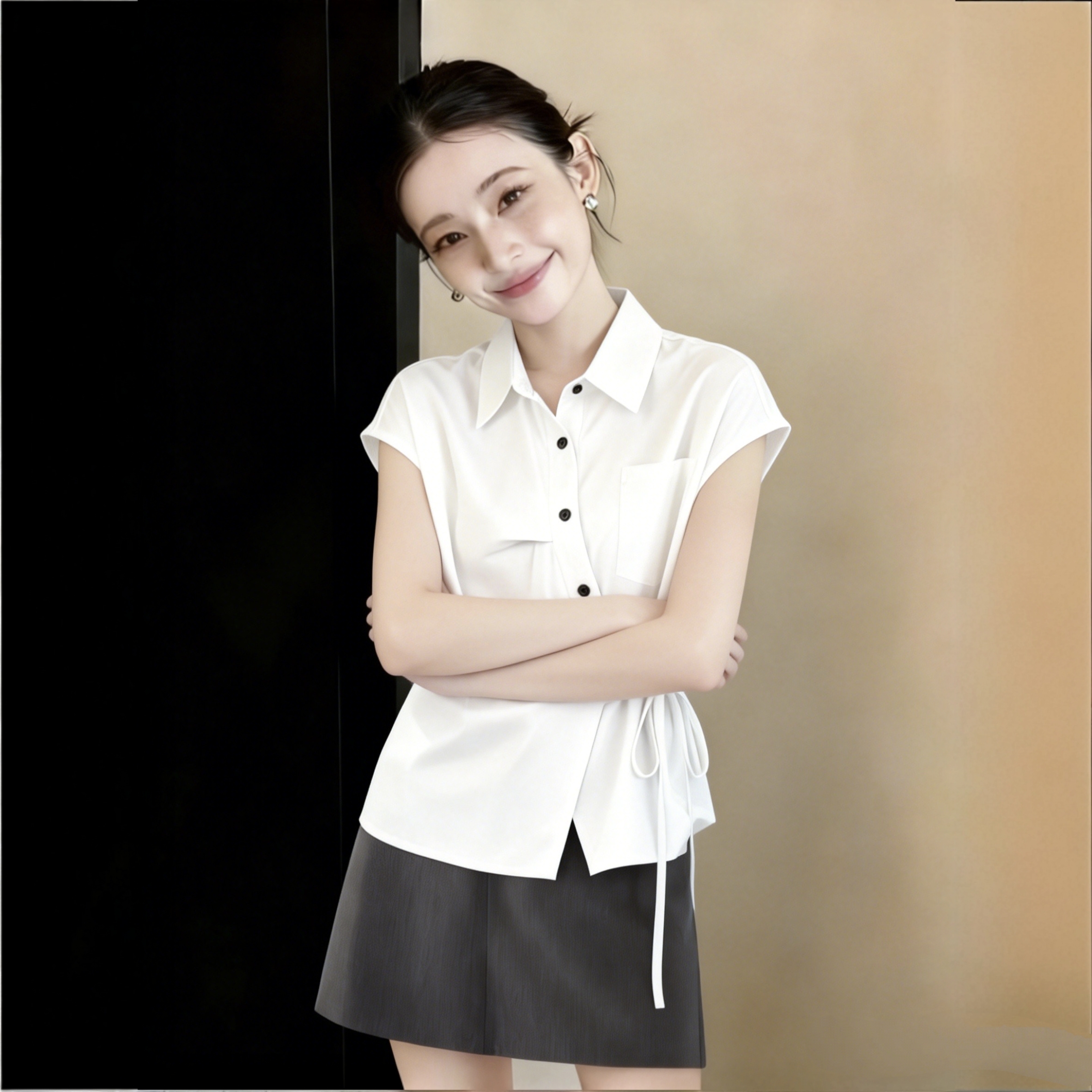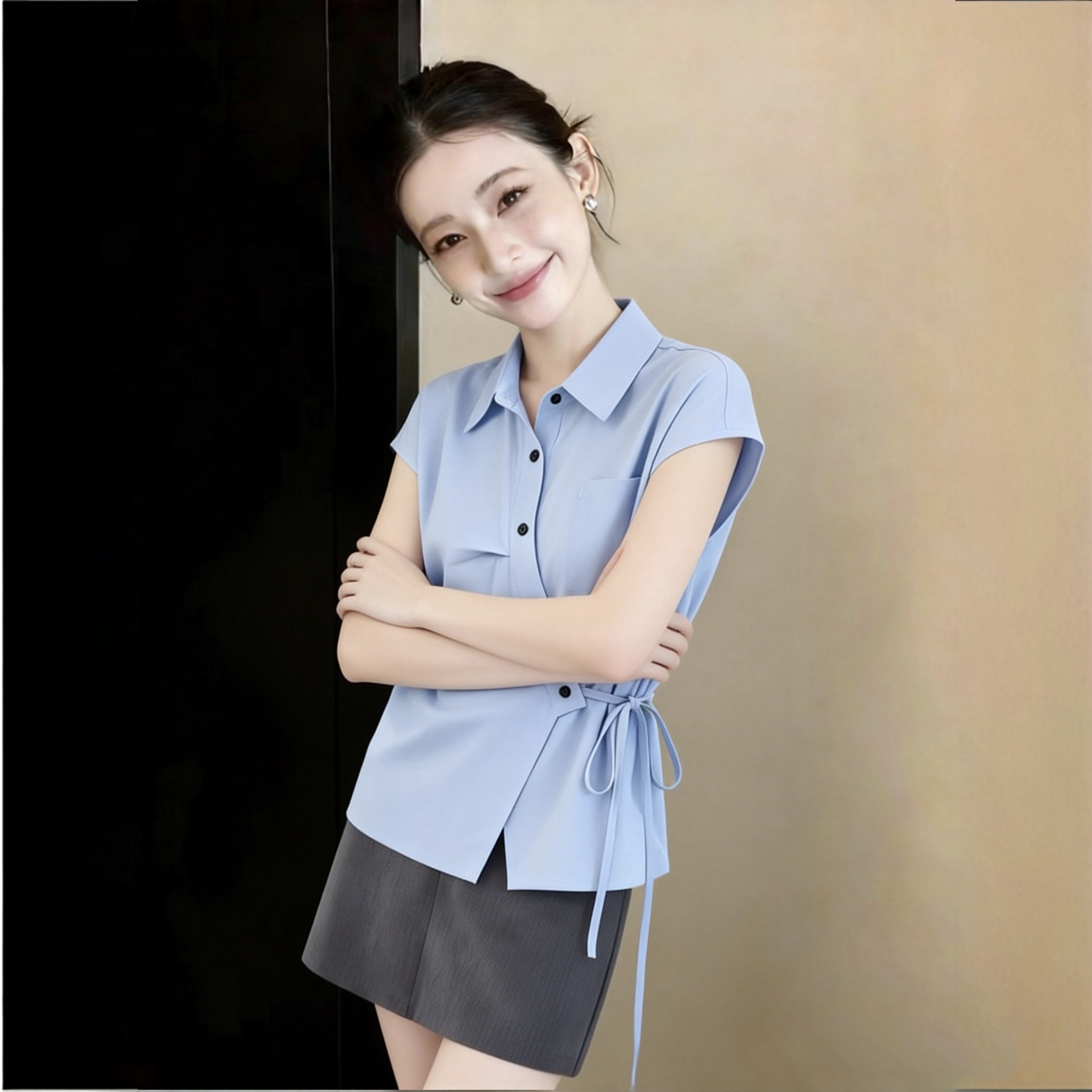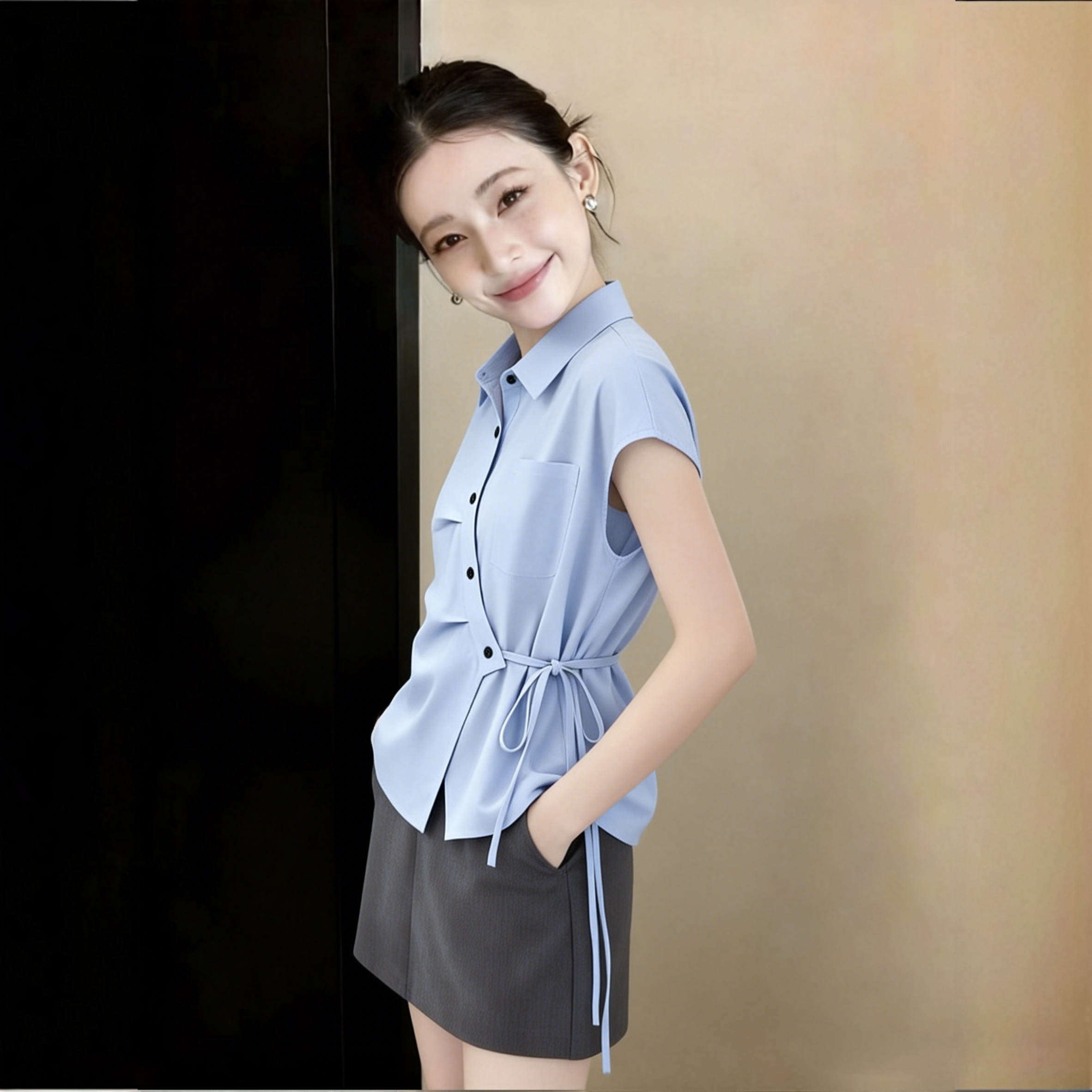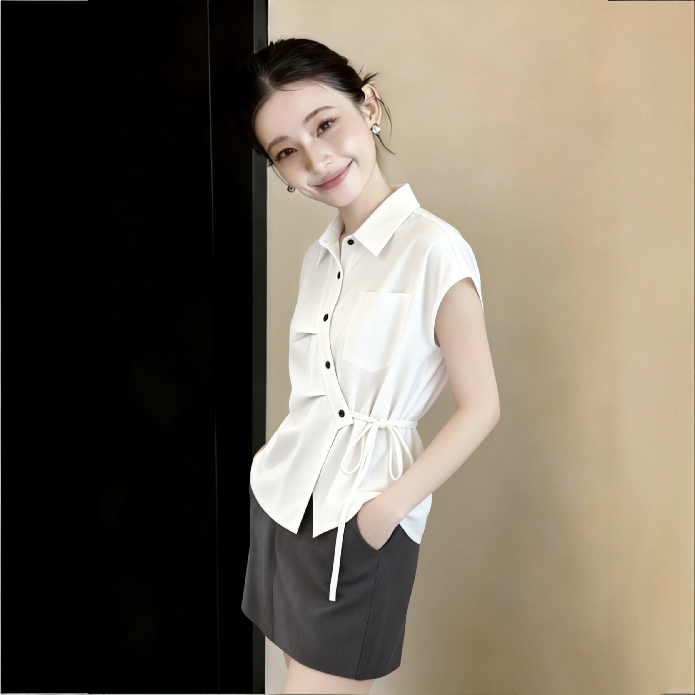 RY3737# 2026夏季新款收腰系带衬衫女短袖设计感小众气质通勤显瘦雪纺上衣