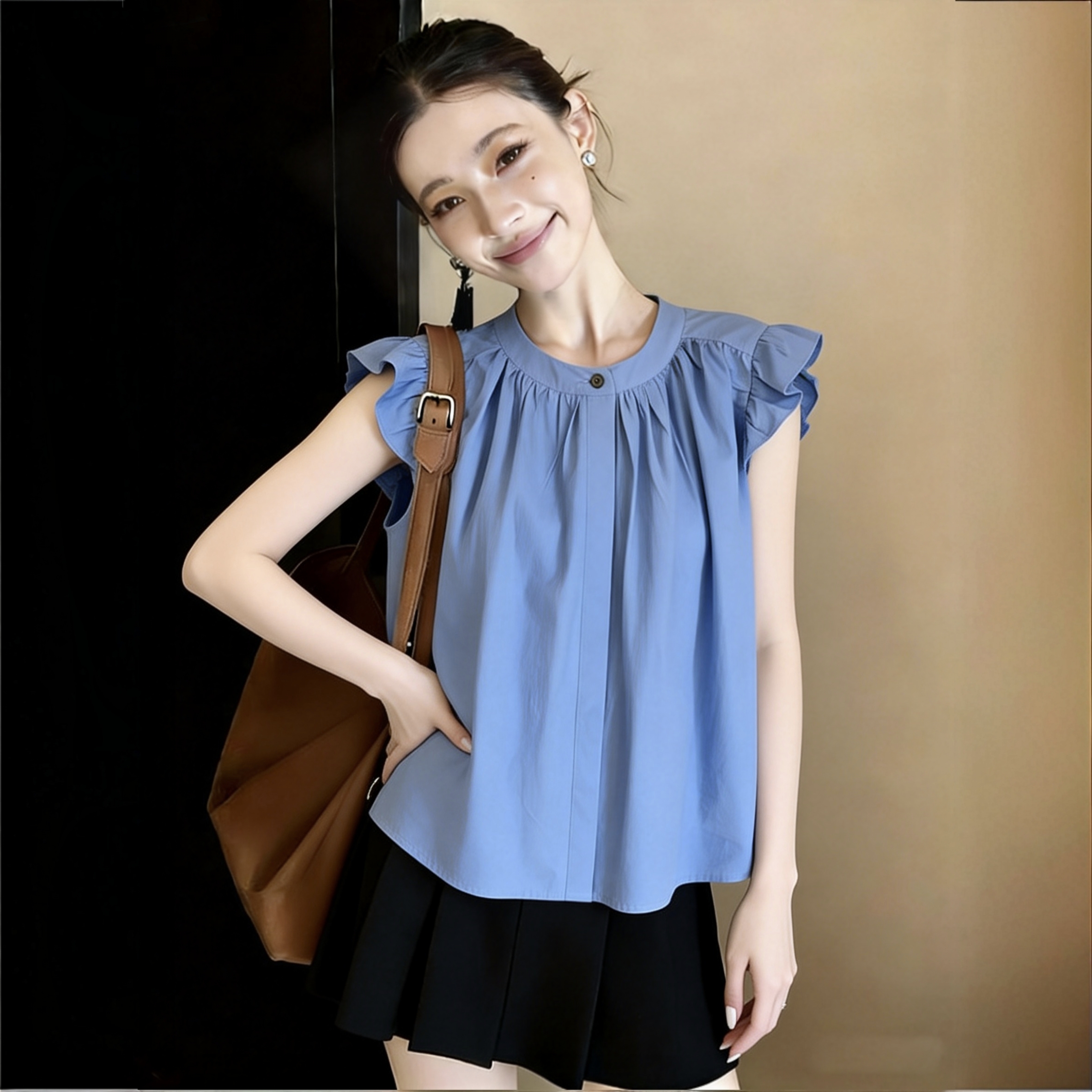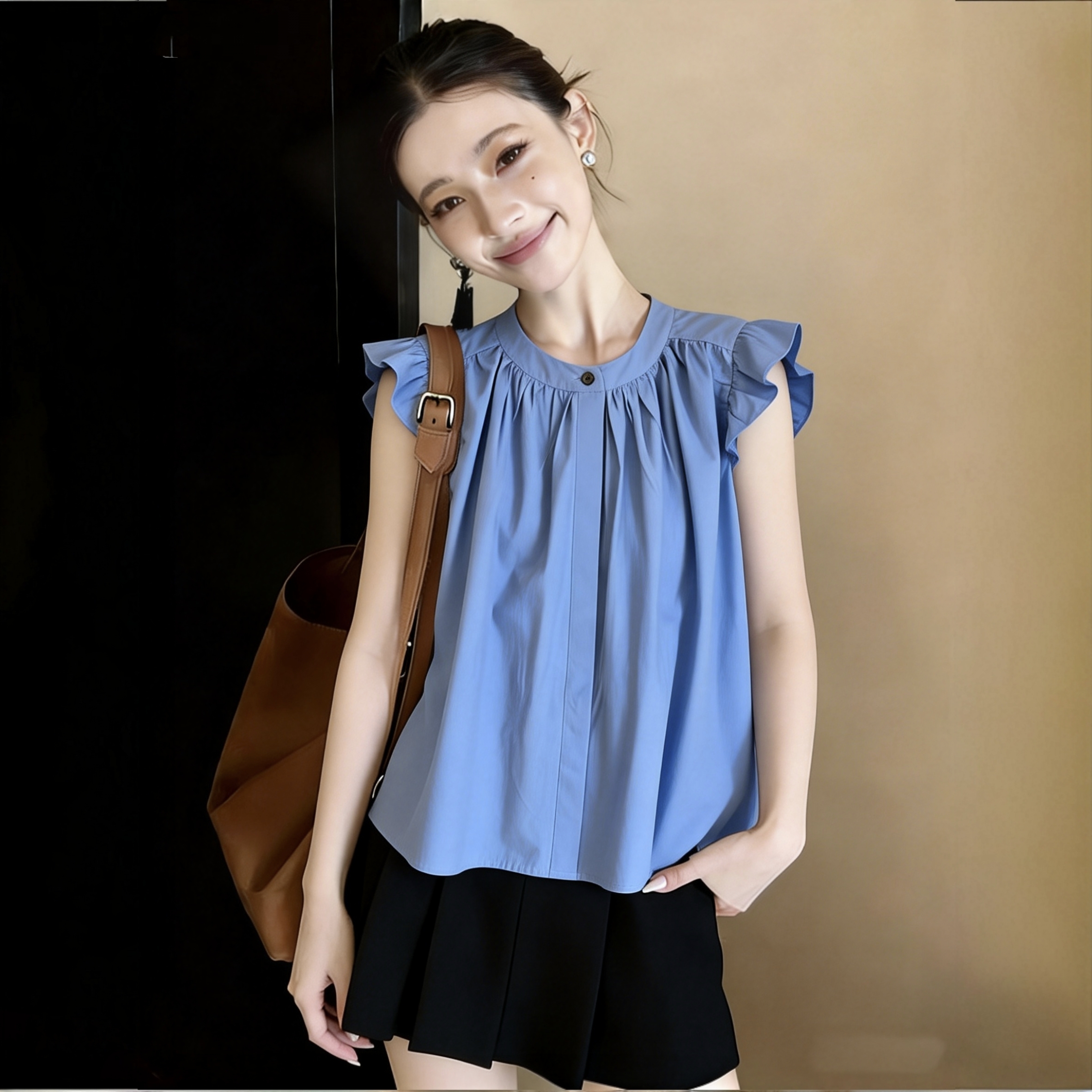 RY3740# 蓝色飞袖衬衫女夏季2026新款法式圆领宽松无袖娃娃衫通勤气质上衣