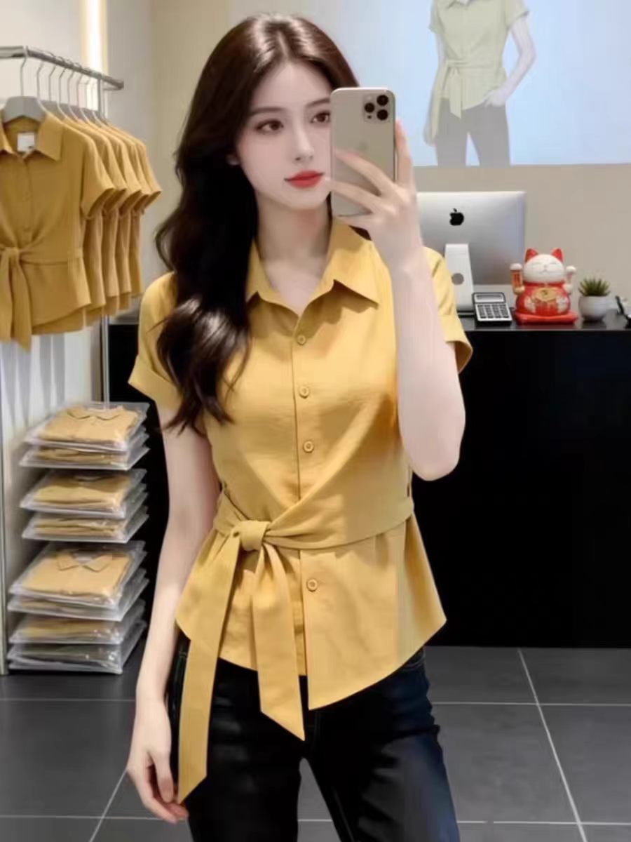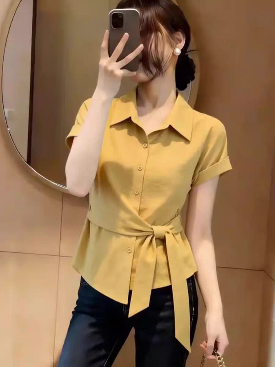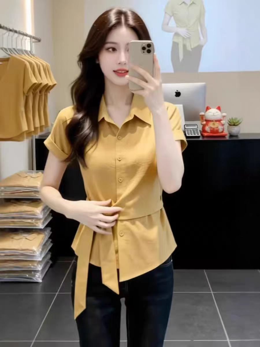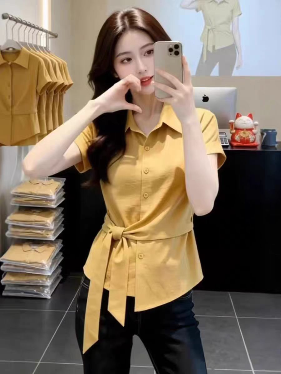 RY3743# 独特漂亮气质黄色收腰短袖衬衫2026夏季新款休闲百搭显瘦上衣女装