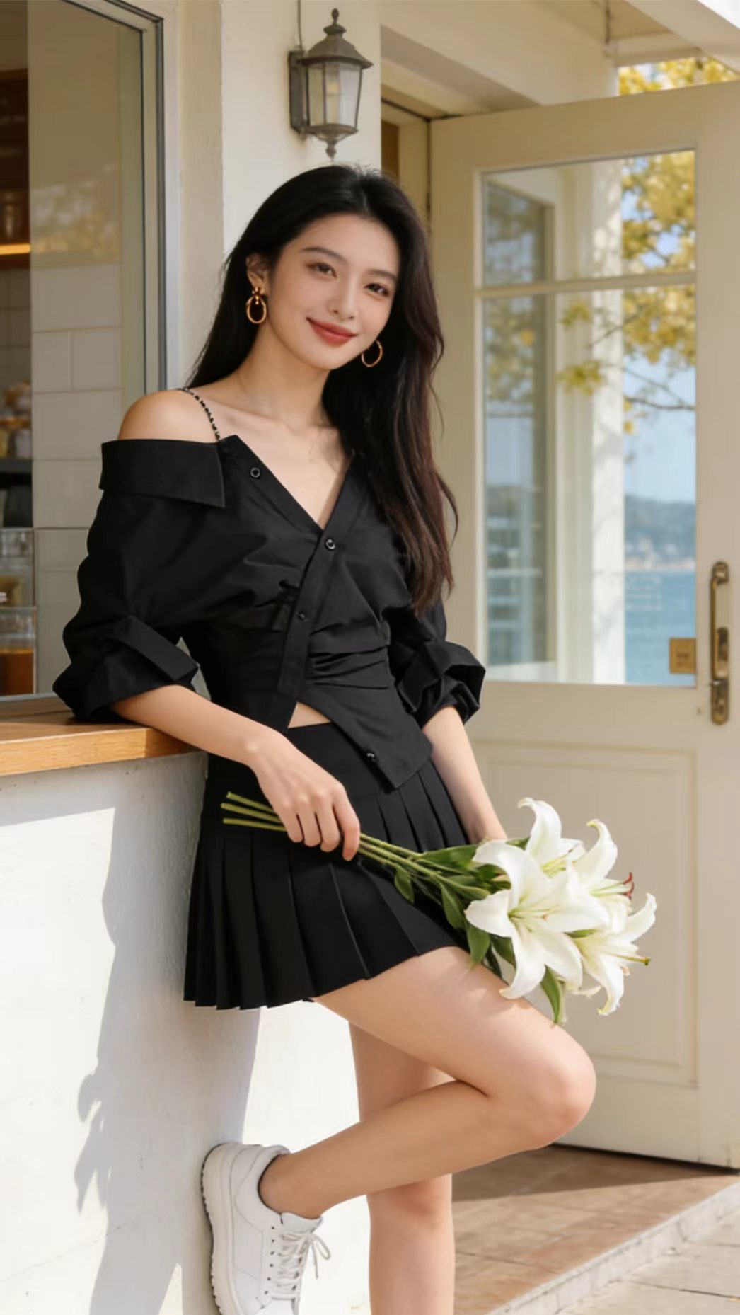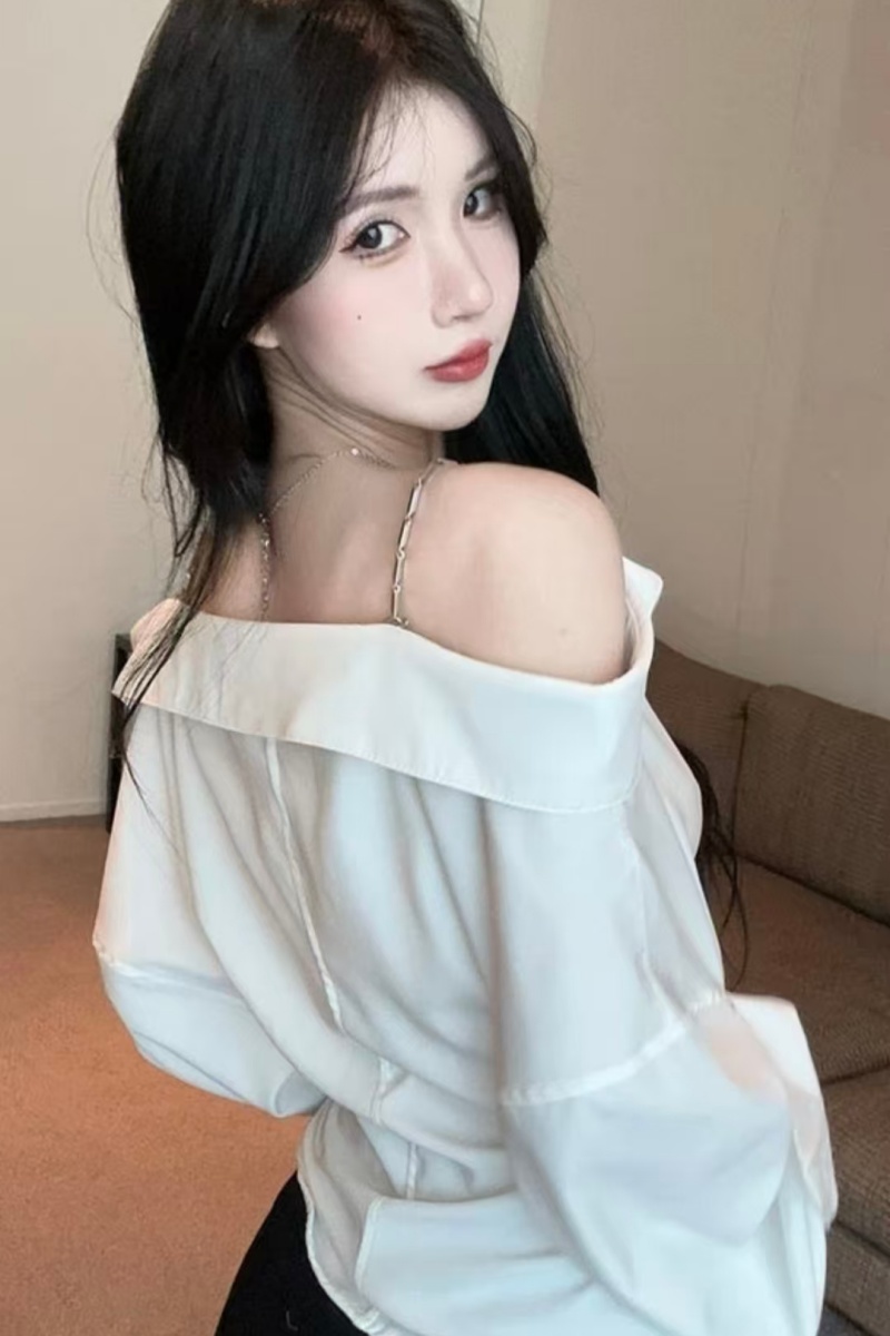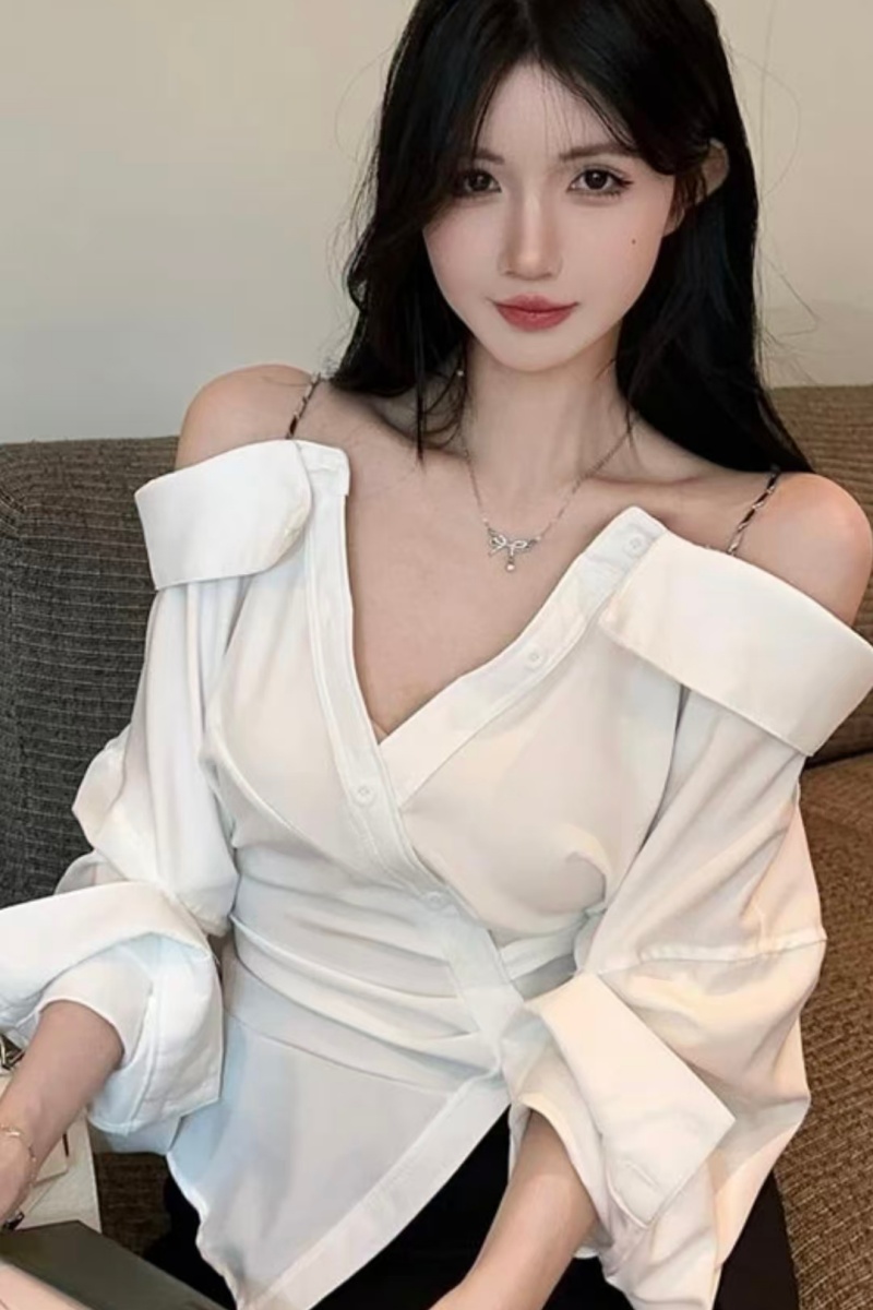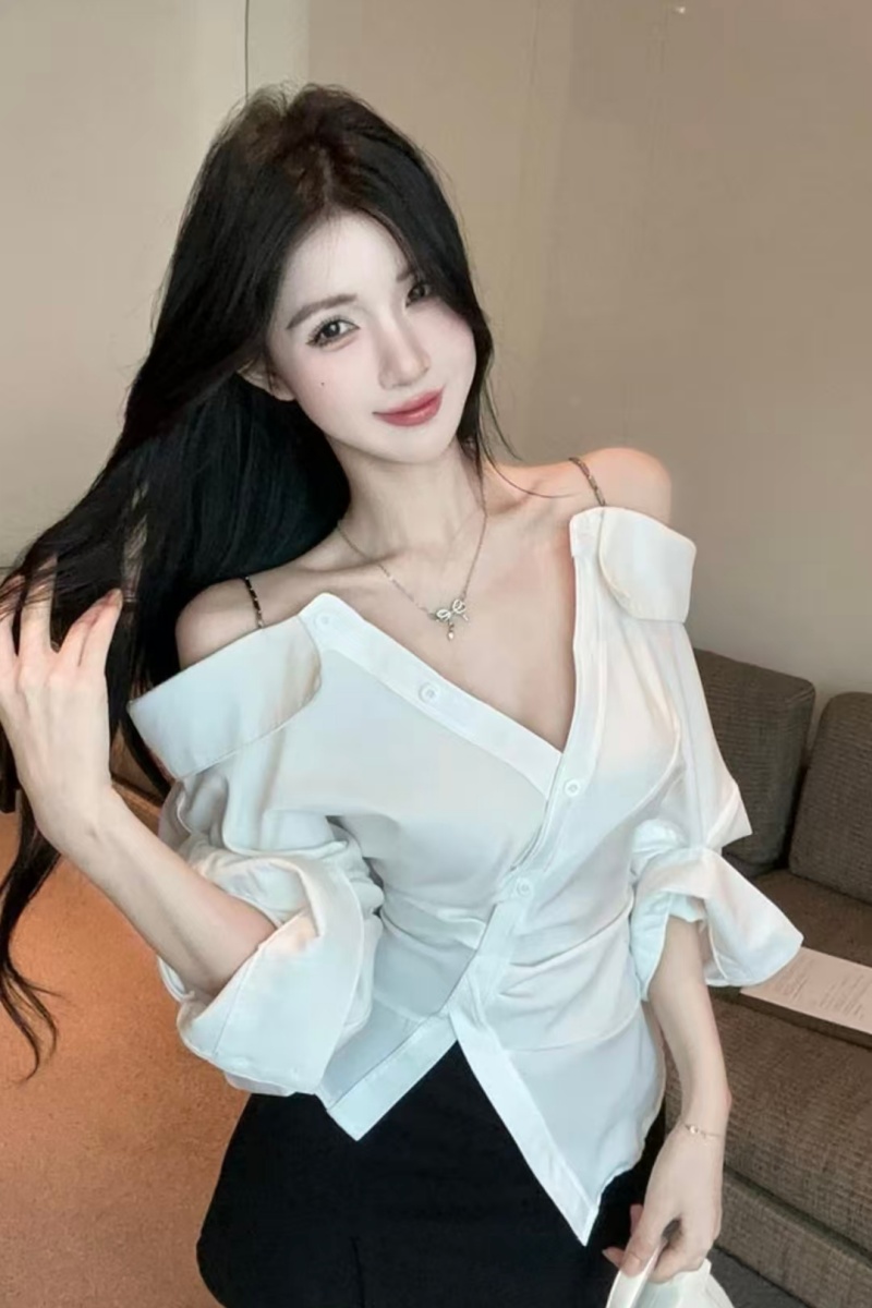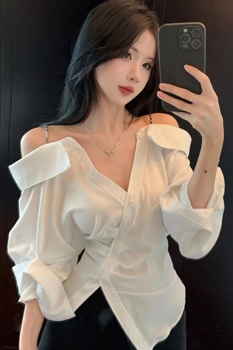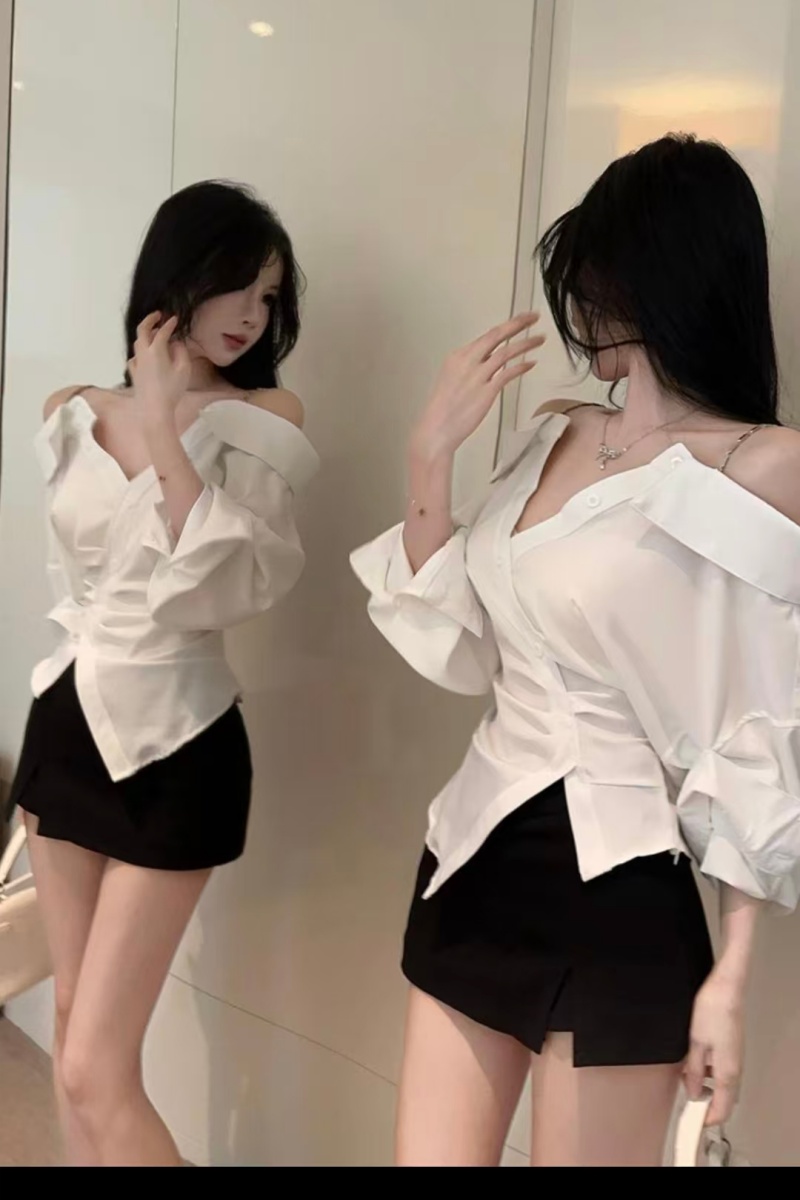 RY3745# 不规则v领白色衬衫女设计感小众秋季一字肩上衣高级感巨好看衬衣