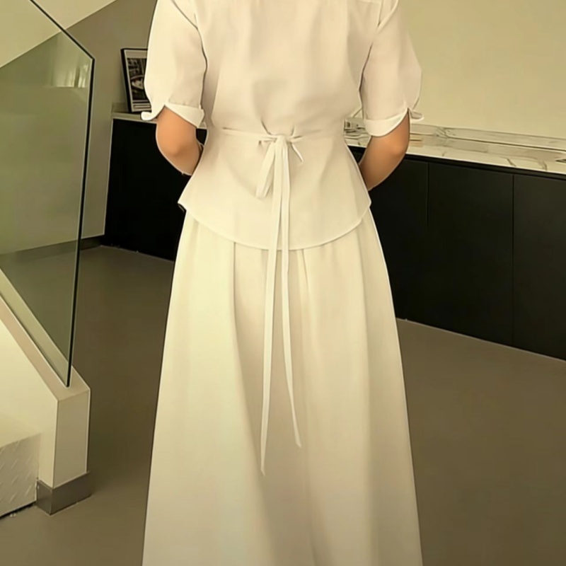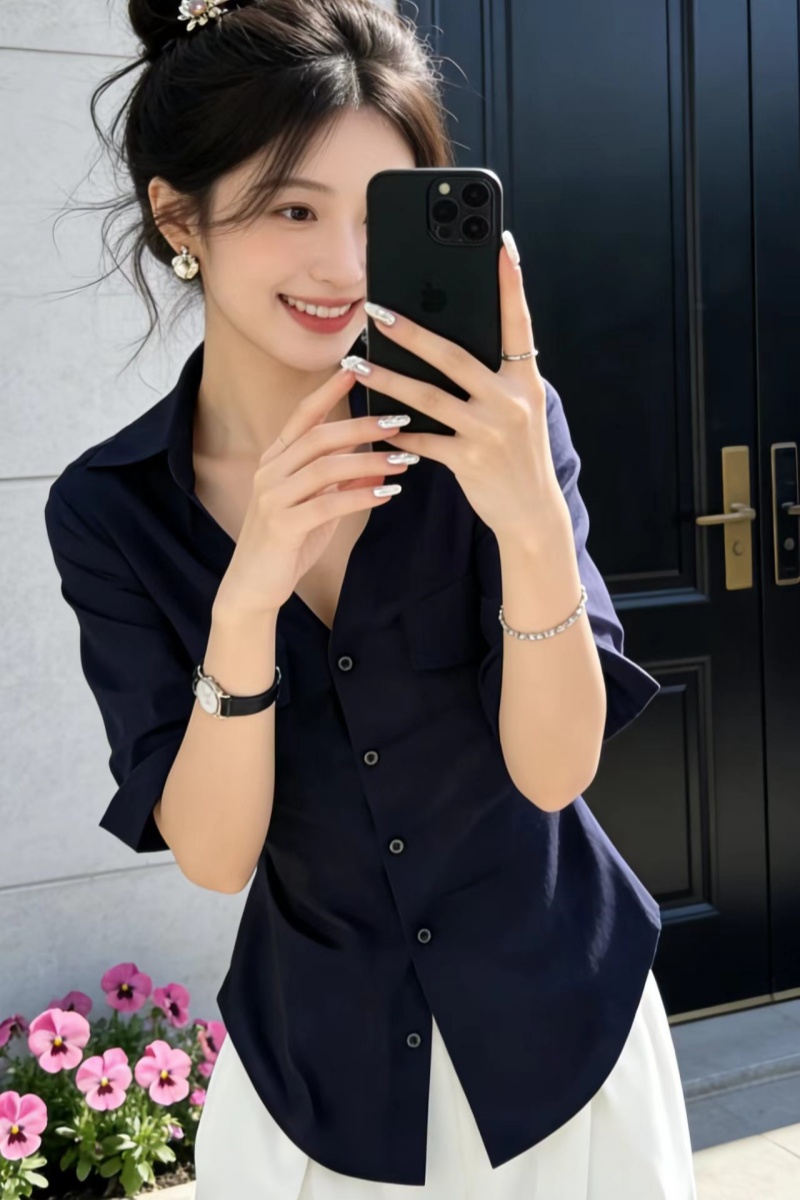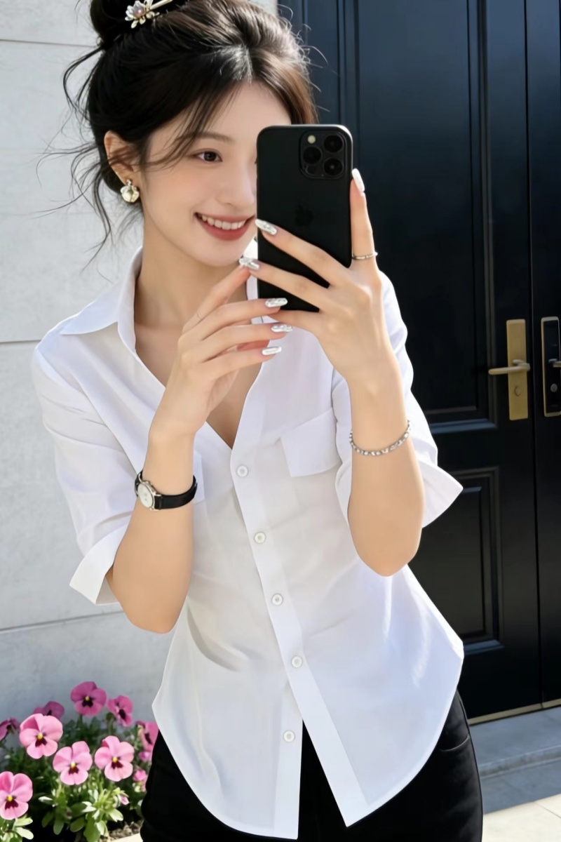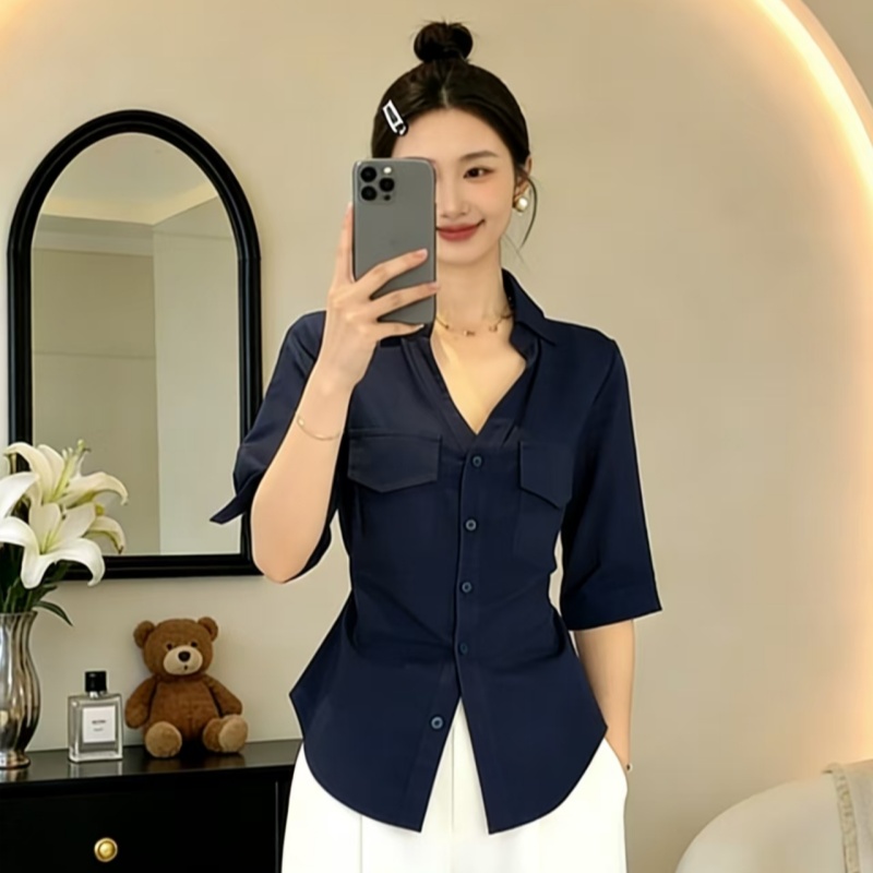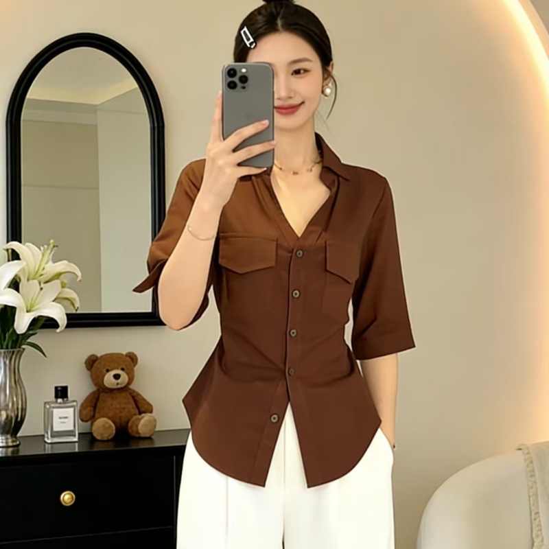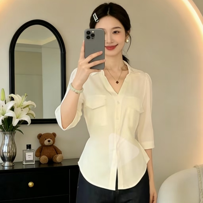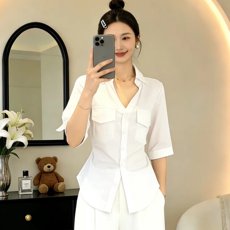 RY3748# 自创款 巨显瘦精细棉收腰v领短袖正肩衬衫上衣女夏