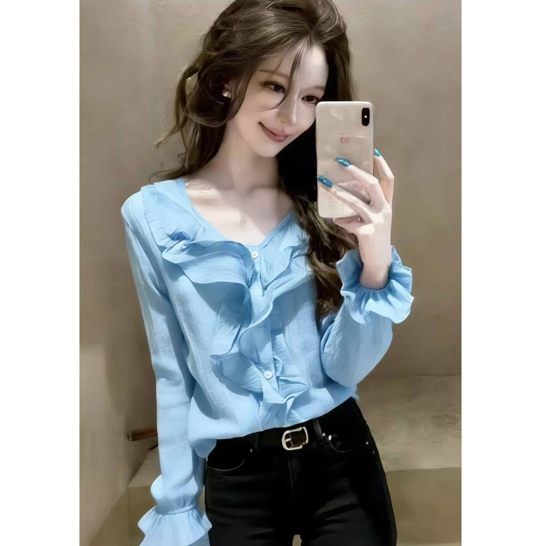 RY3750# 优雅天空蓝v领荷叶边长袖衬衫女春季新款百搭宽松显瘦上衣