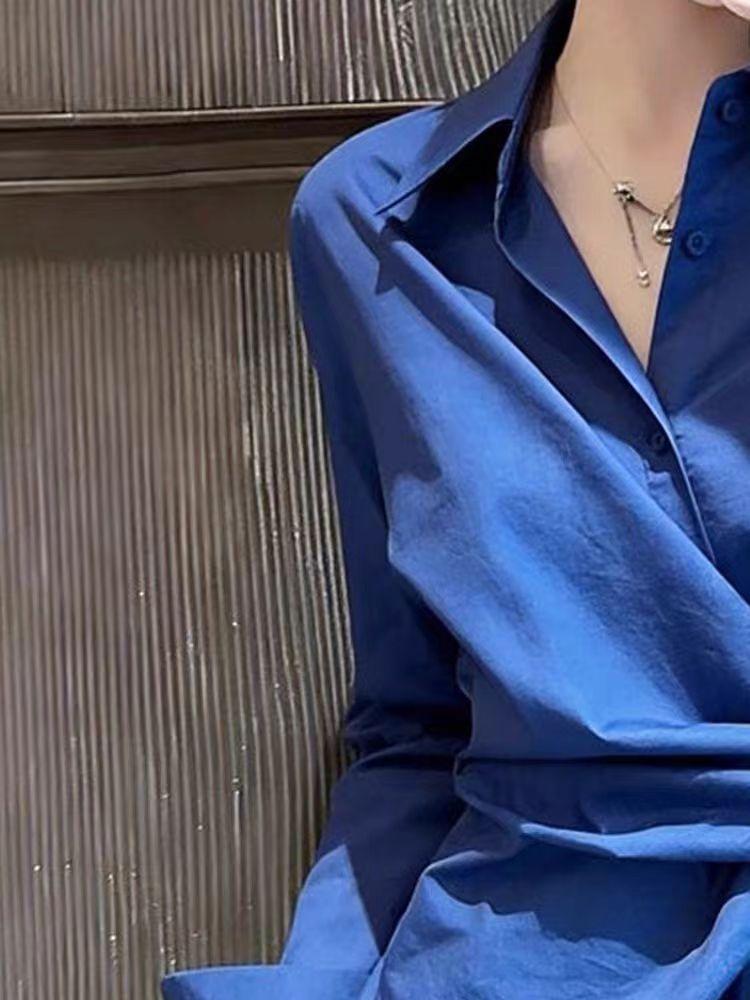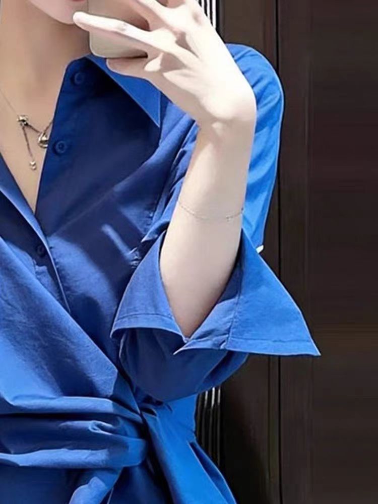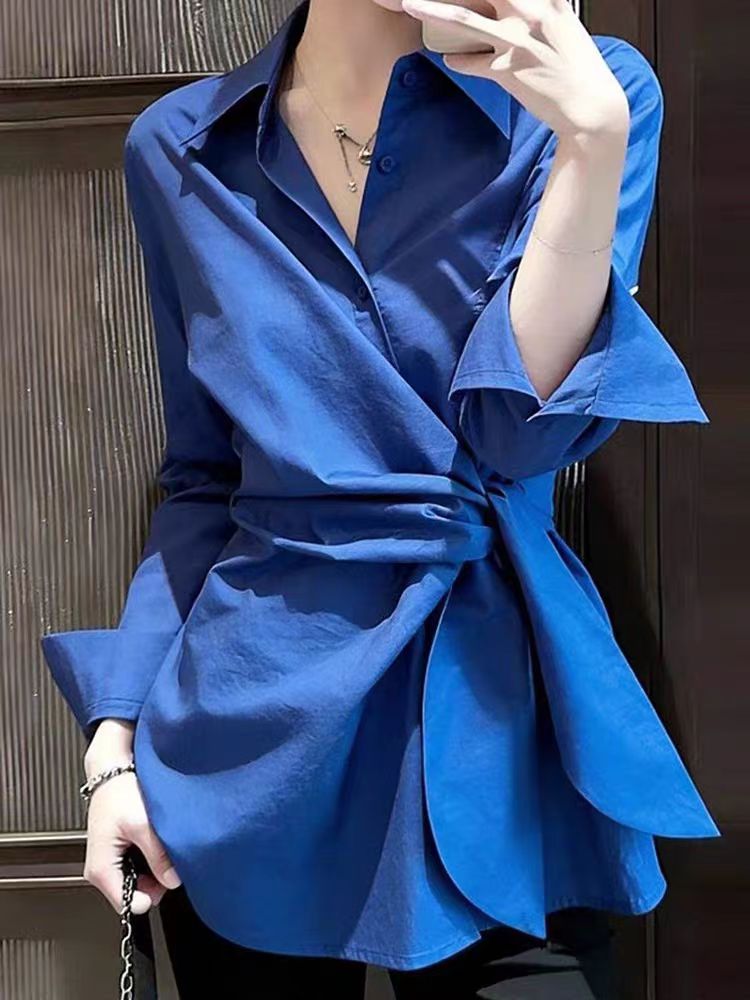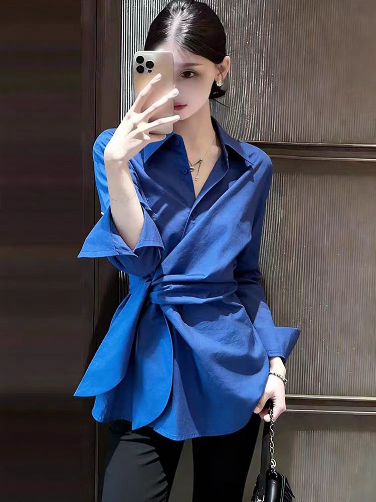 RY3751# 蓝色翻领绑带长袖衬衫女春季2026年新款显白减龄收腰上衣