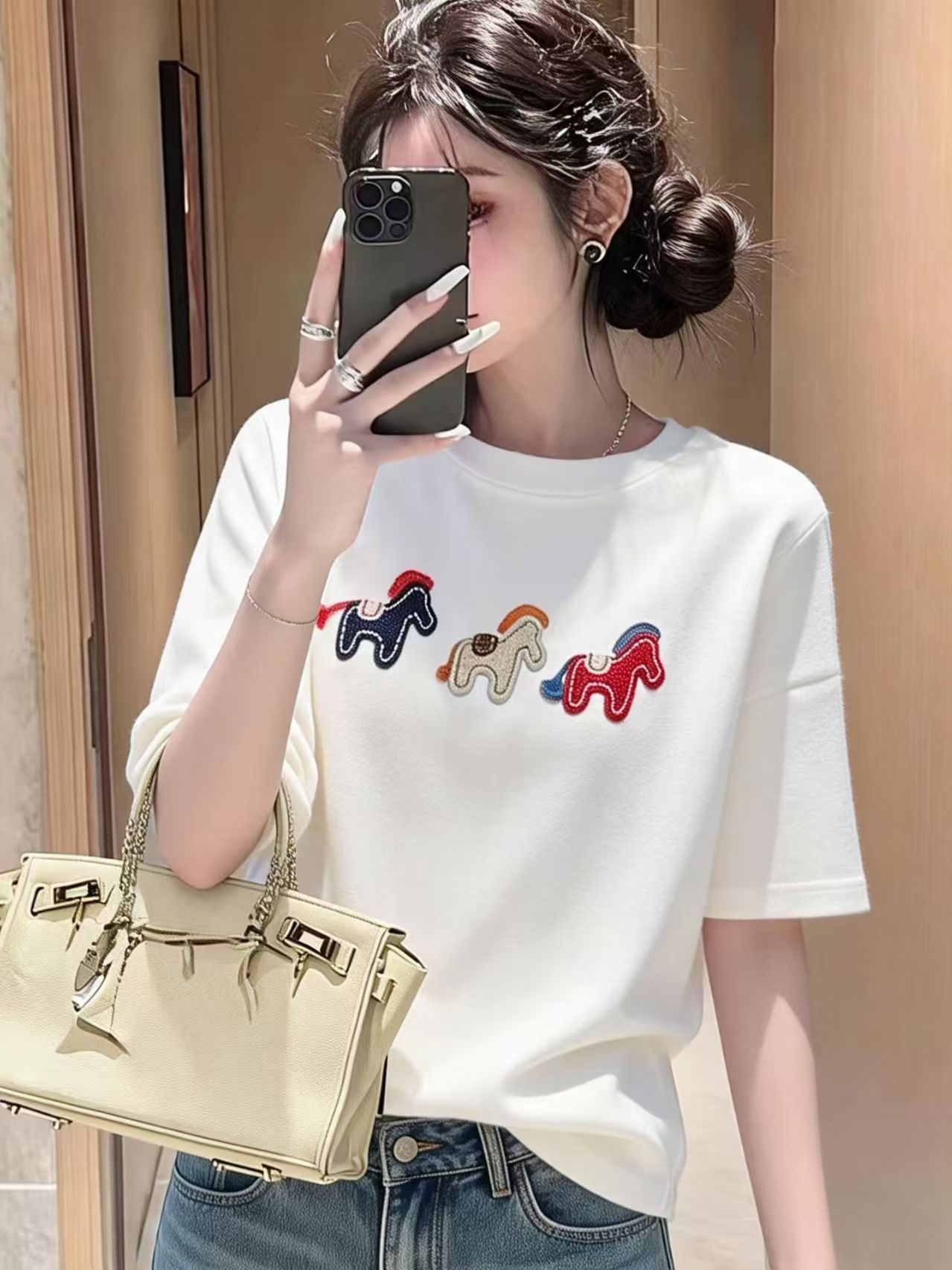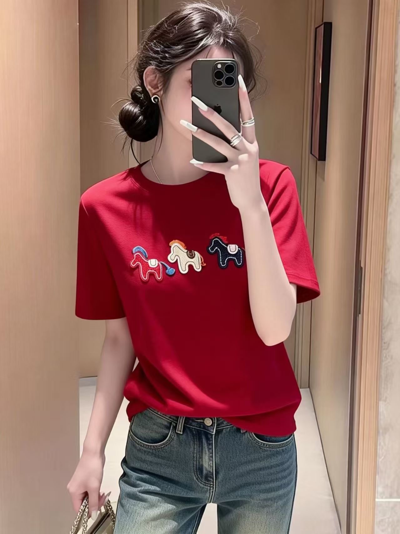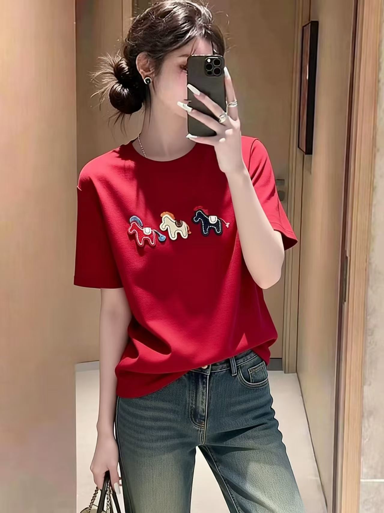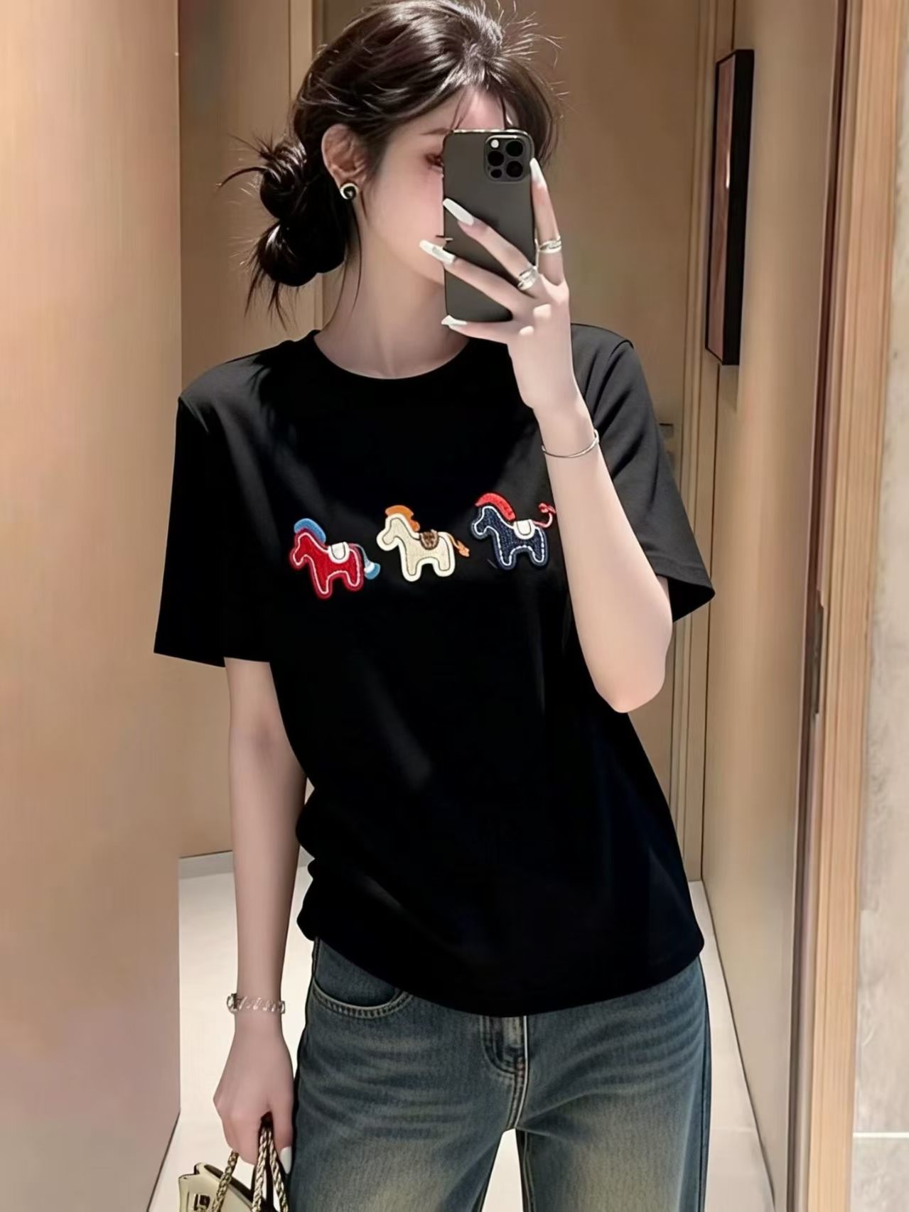 RY3752# 2026年新年早春小马刺绣短袖T恤女宽松休闲时尚小众打底衫上衣
