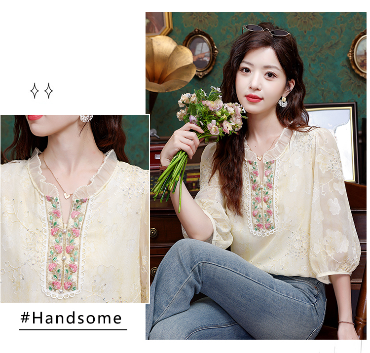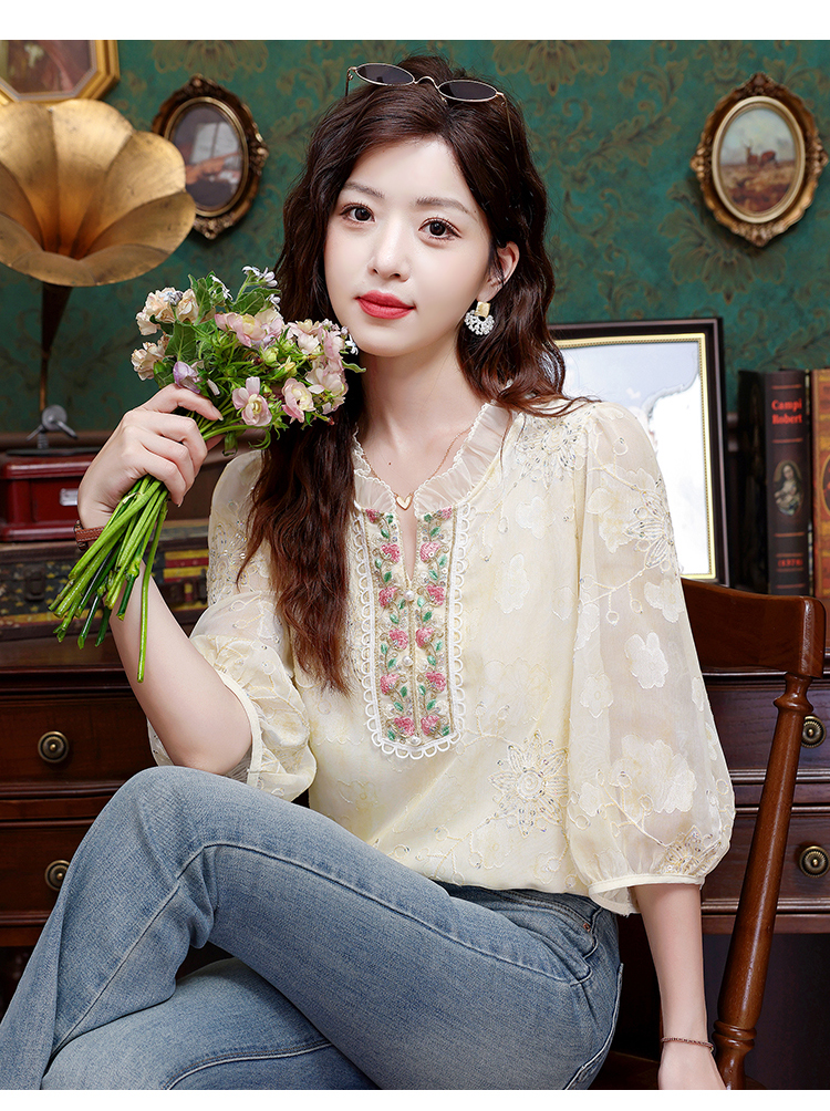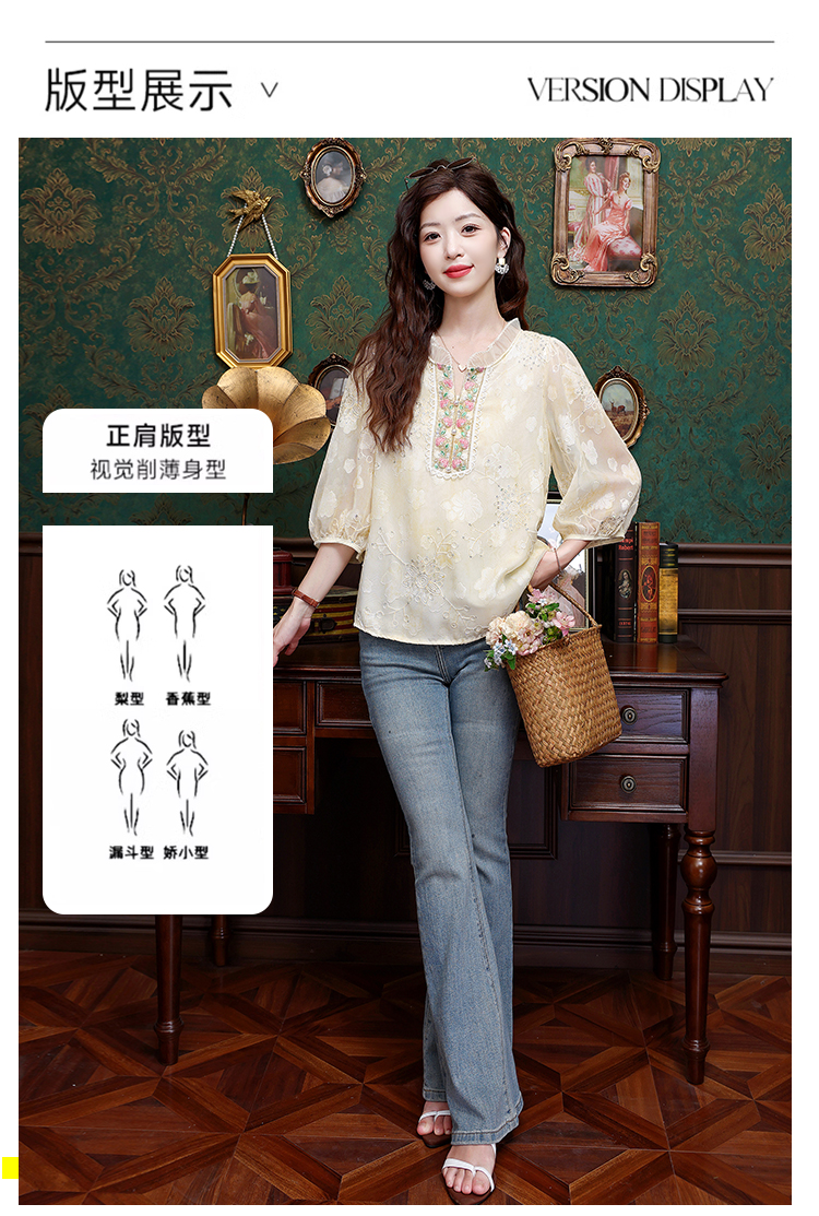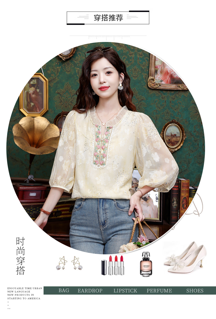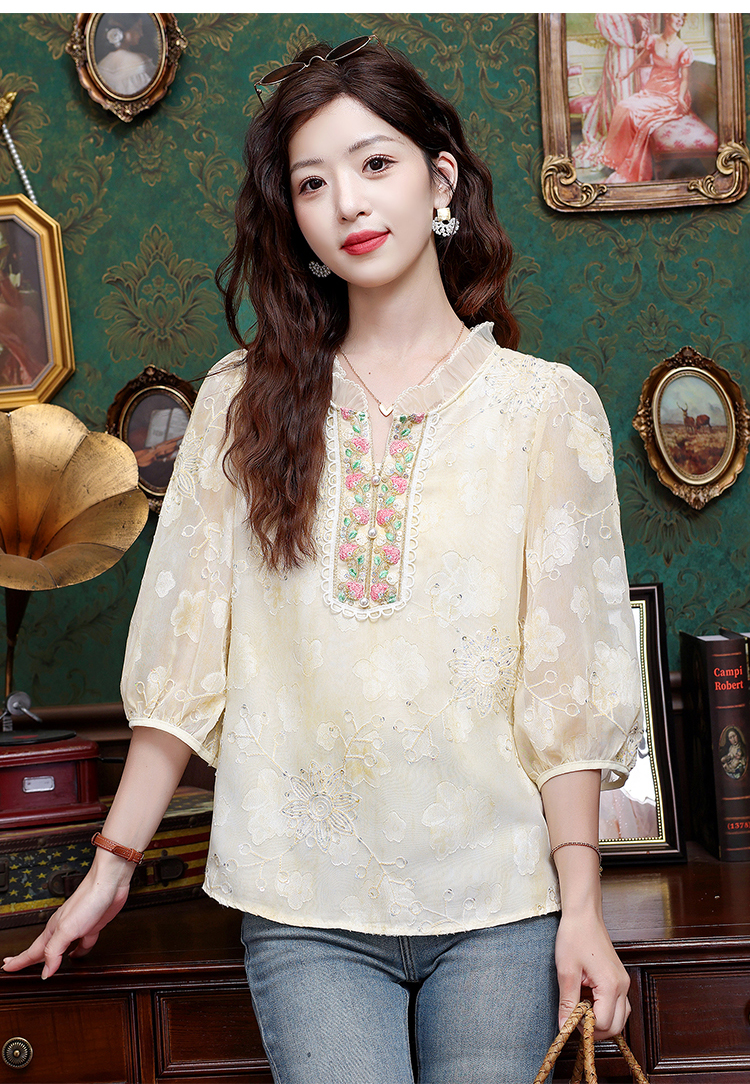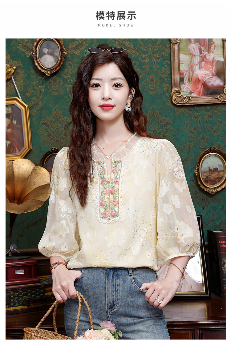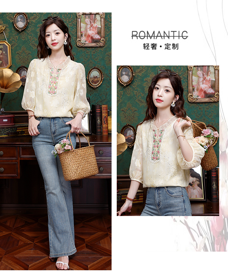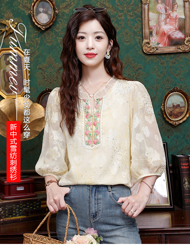 RY3761# 实拍2026年春夏新款重工立体刺绣泡泡七分袖时尚衬衫空调衫