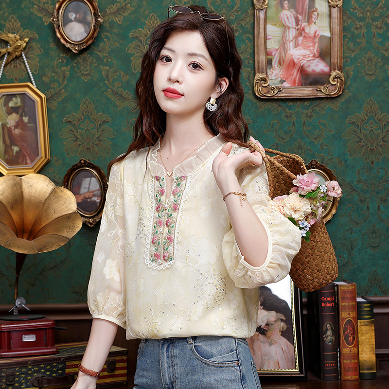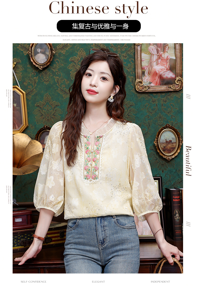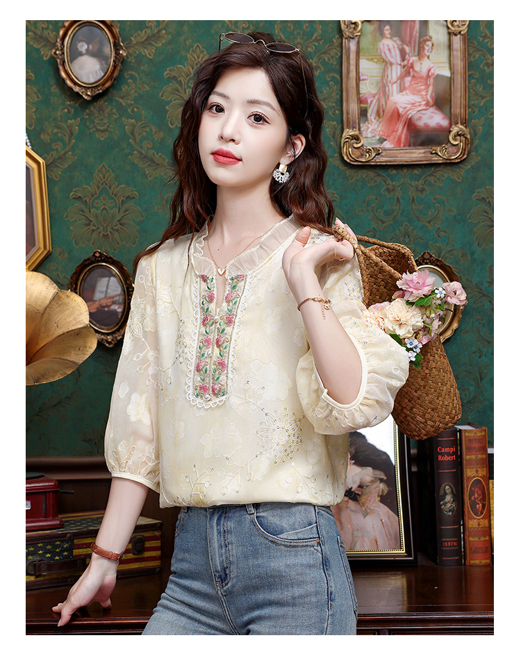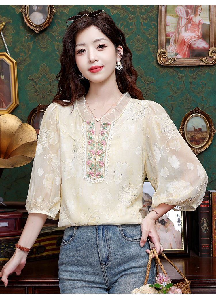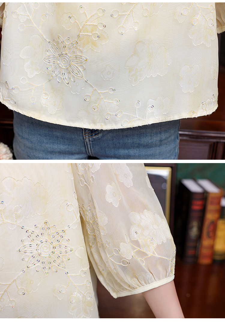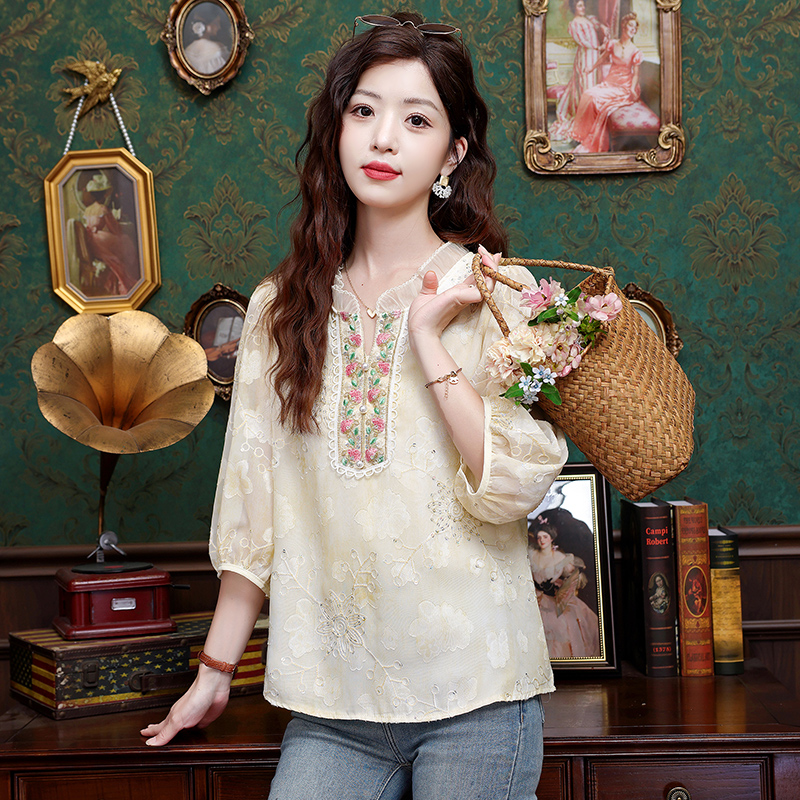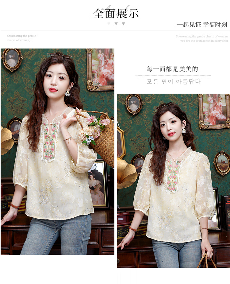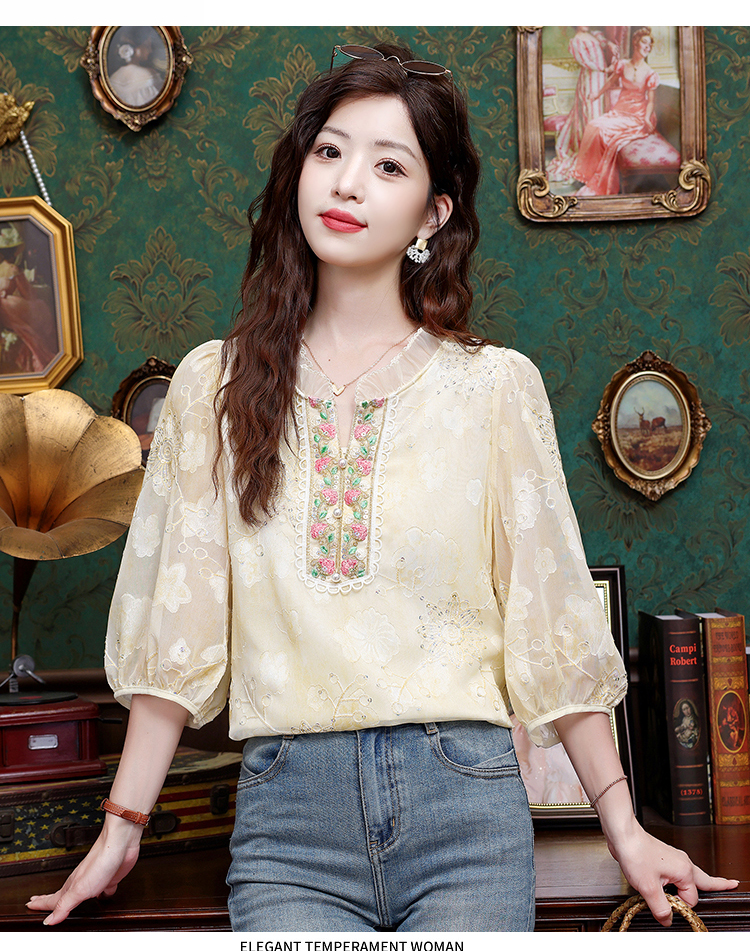 RY3761# 实拍2026年春夏新款重工立体刺绣泡泡七分袖时尚衬衫空调衫