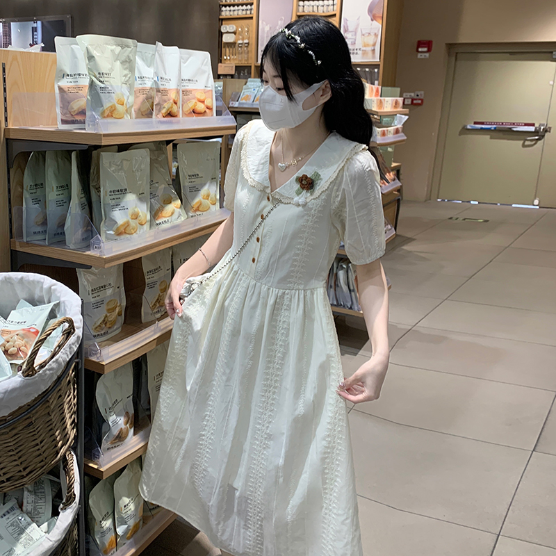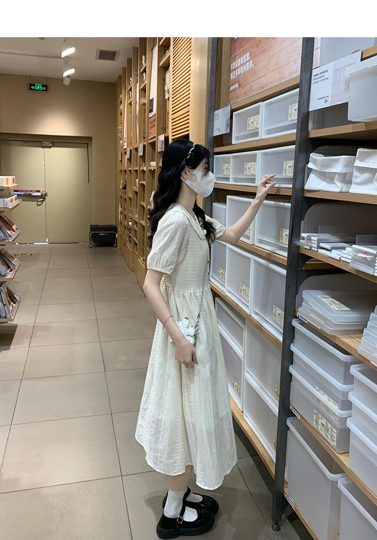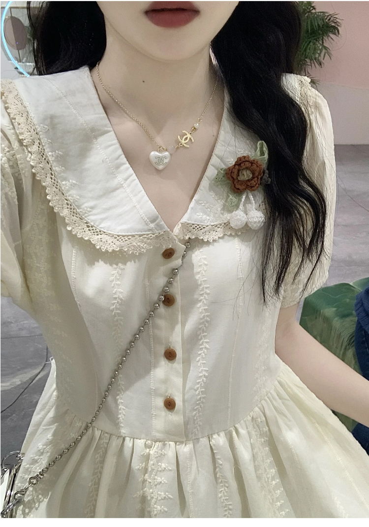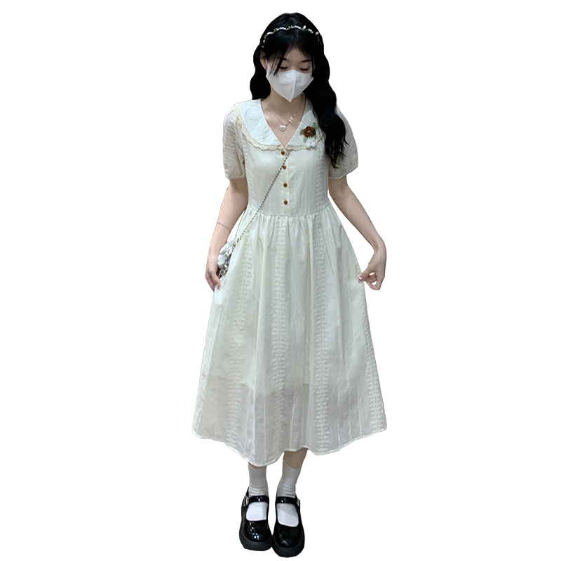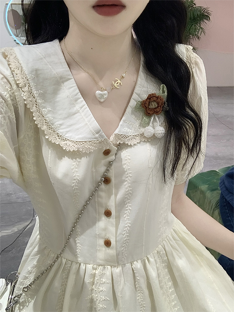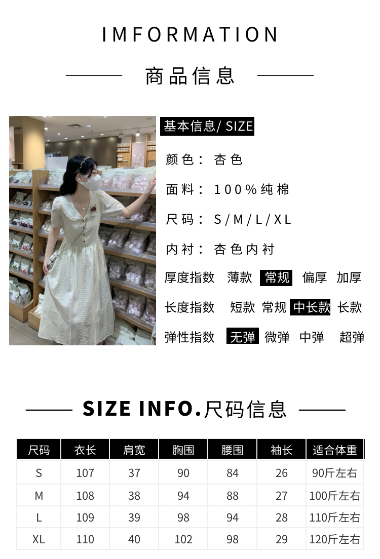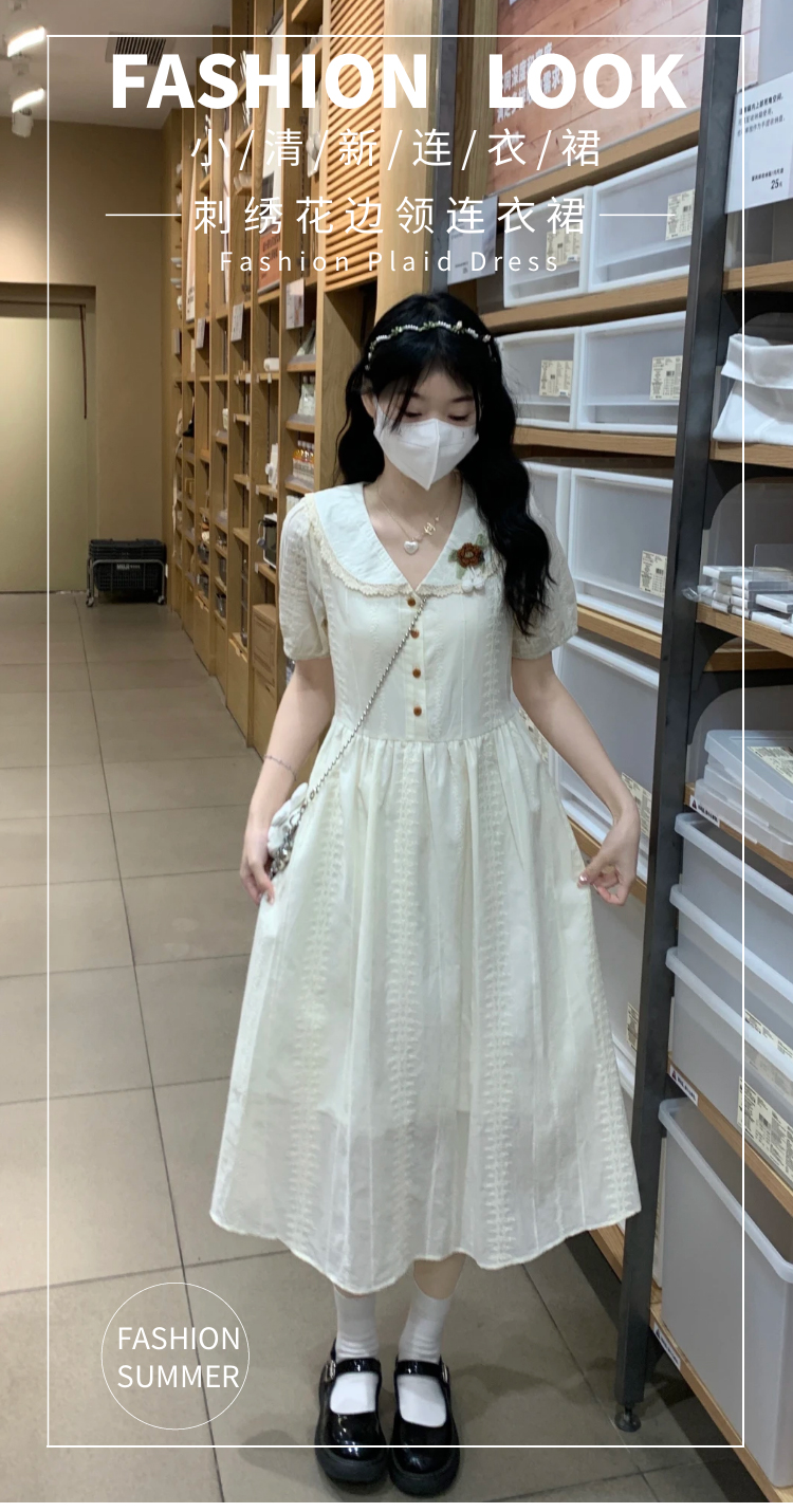 RY3768# 实拍2026 夏季新款杏色娃娃领连衣裙女装 纯棉收腰显瘦刺绣中长裙