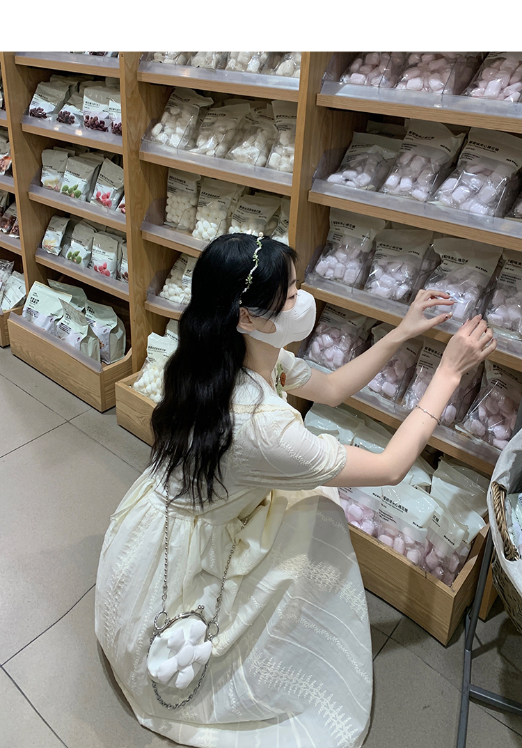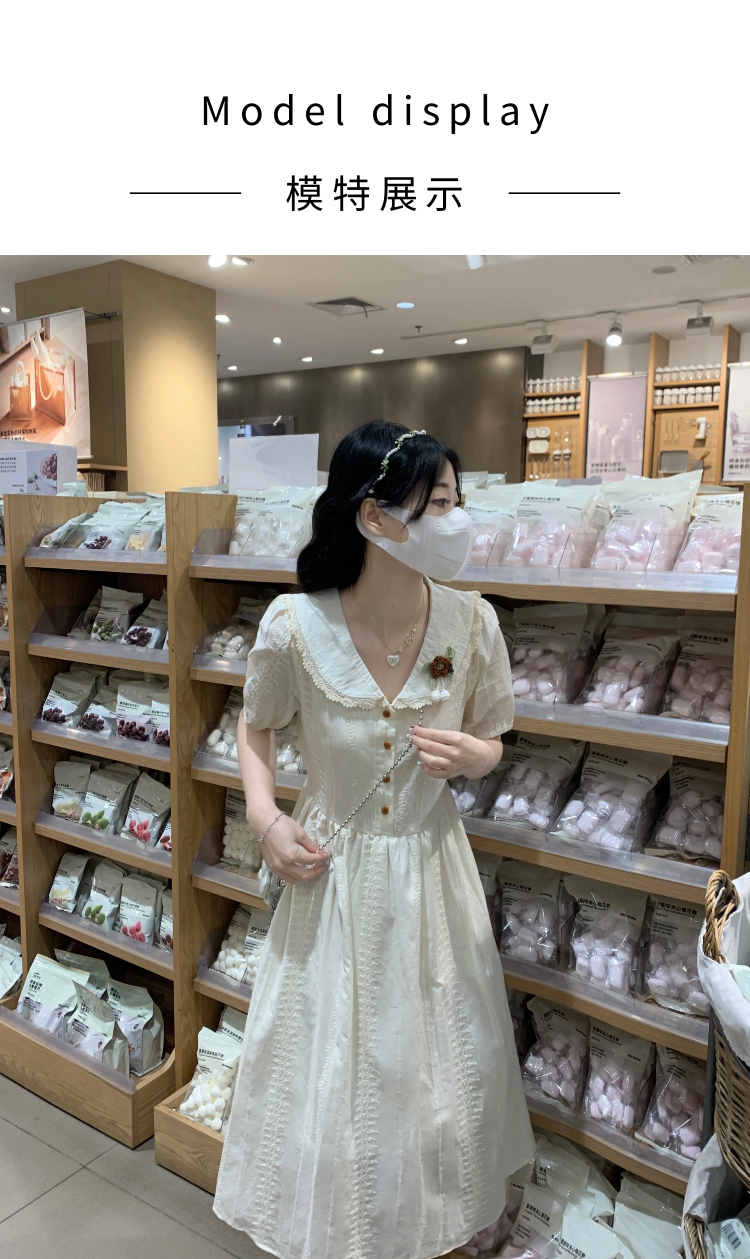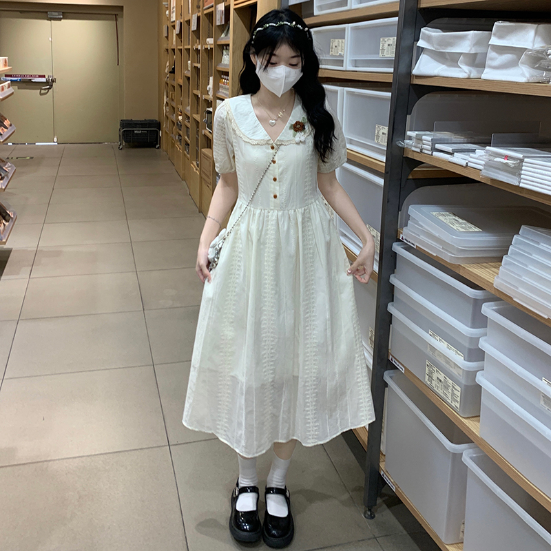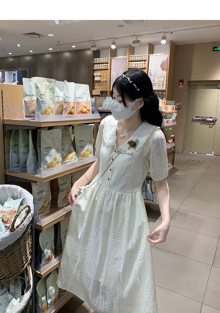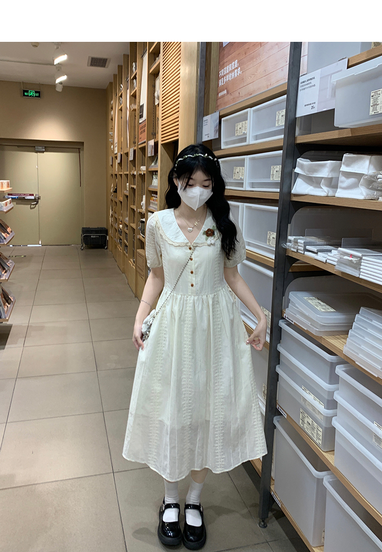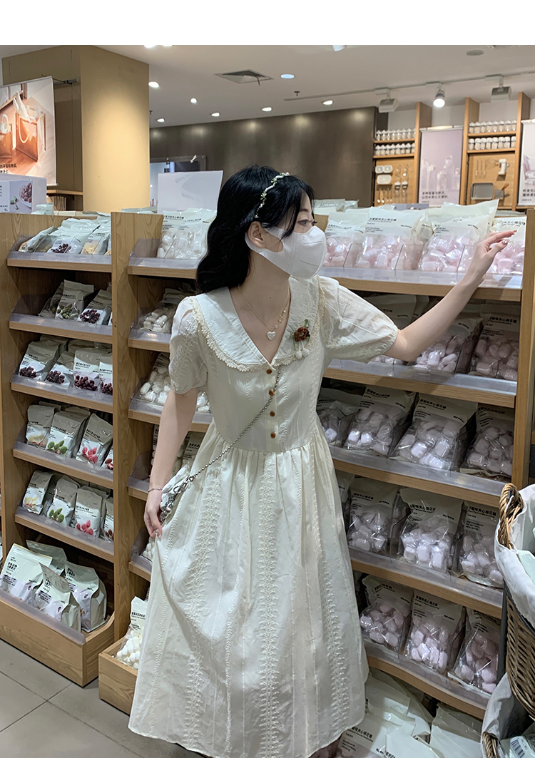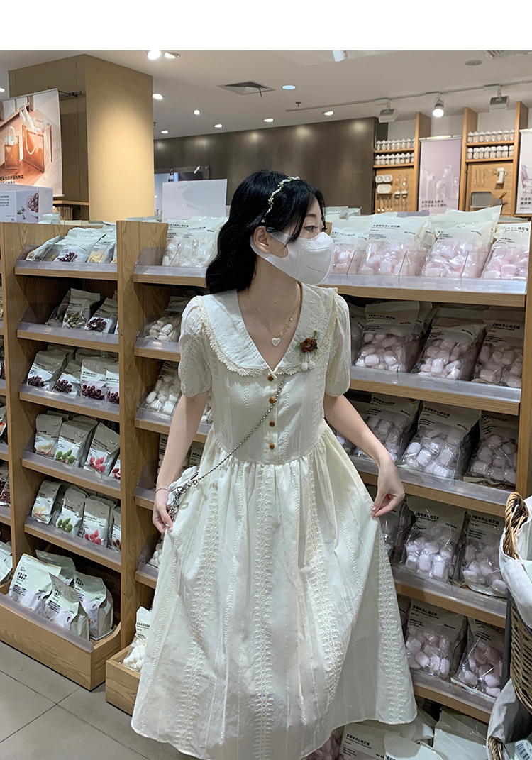 RY3768# 实拍2026 夏季新款杏色娃娃领连衣裙女装 纯棉收腰显瘦刺绣中长裙