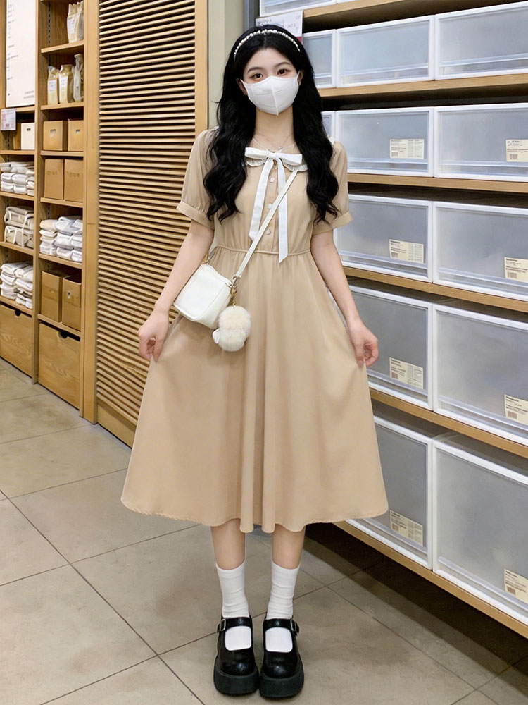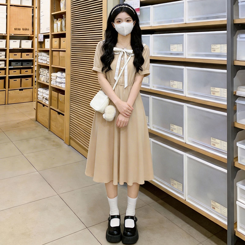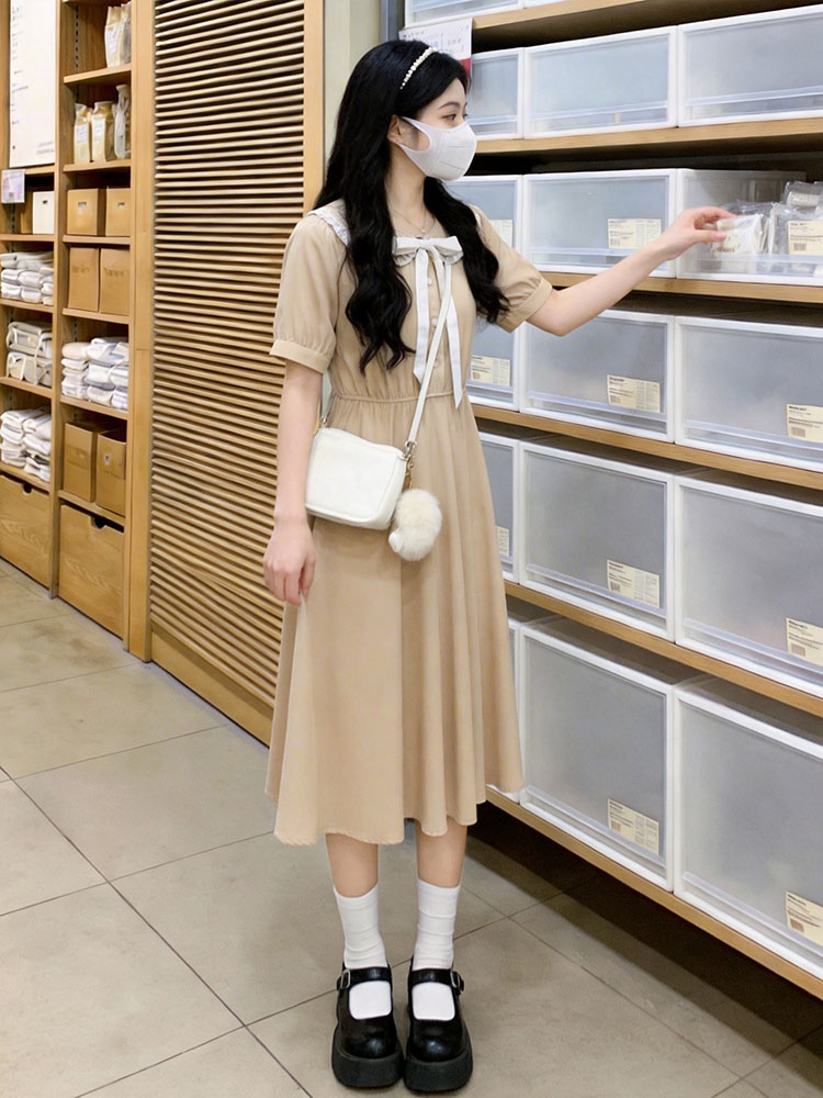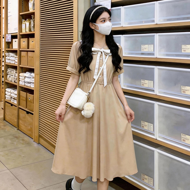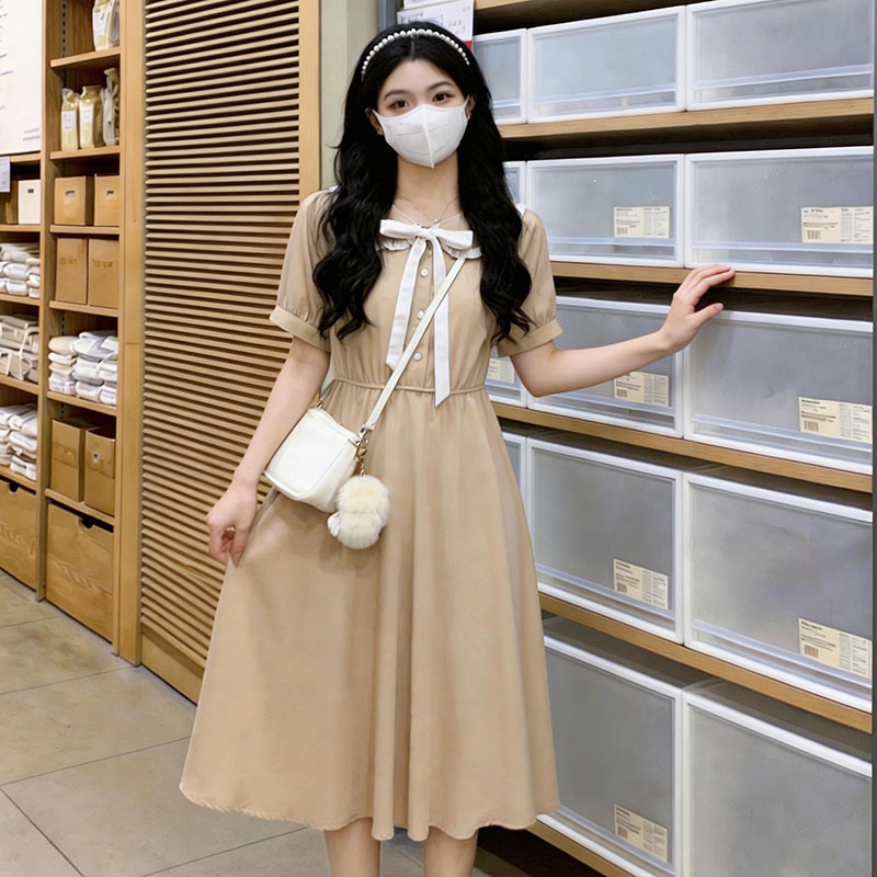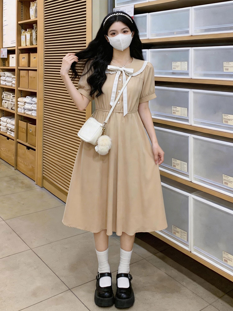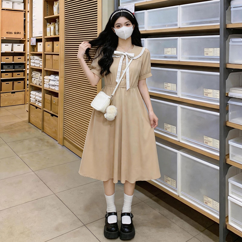 RY3769# 实拍2026日系甜妹娃娃领连衣裙夏季卡其色收腰显瘦木耳边中长裙