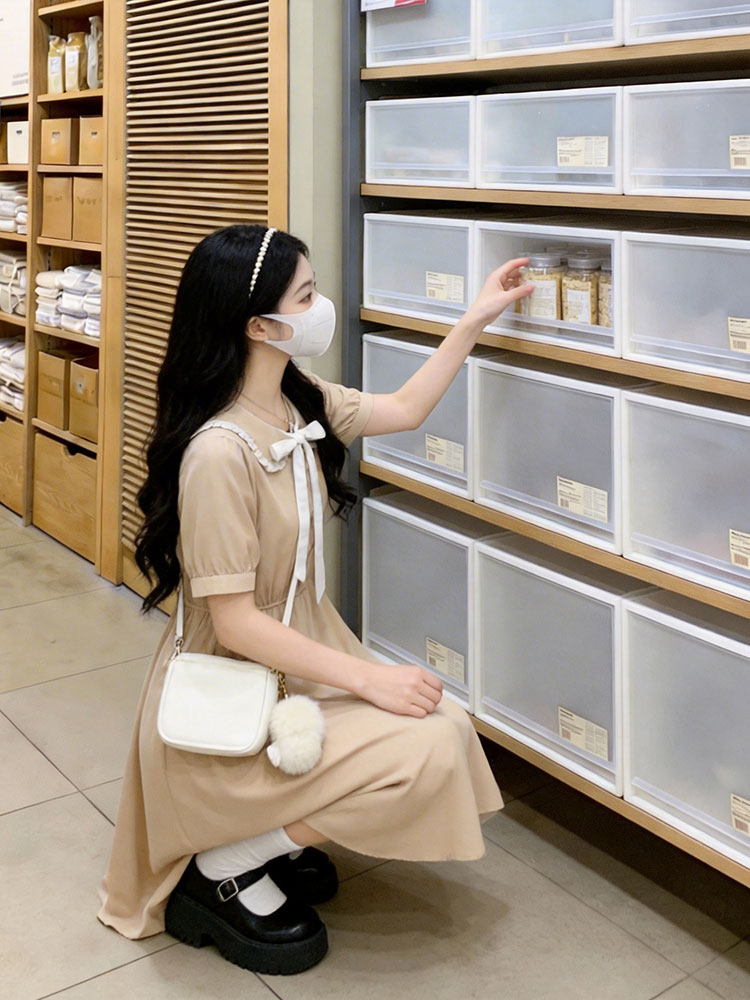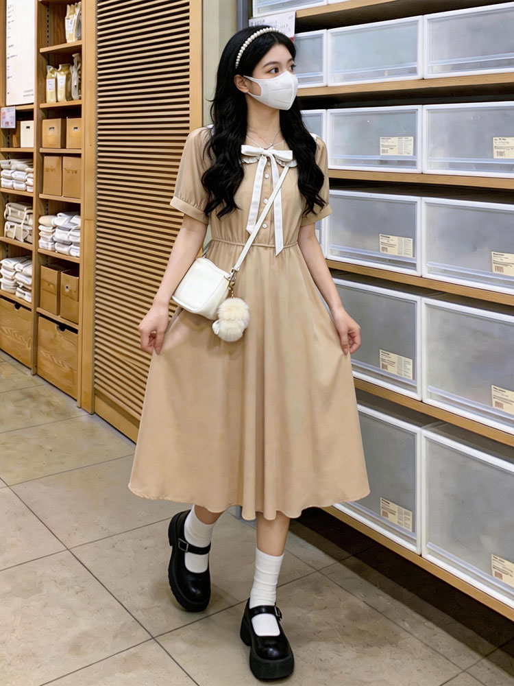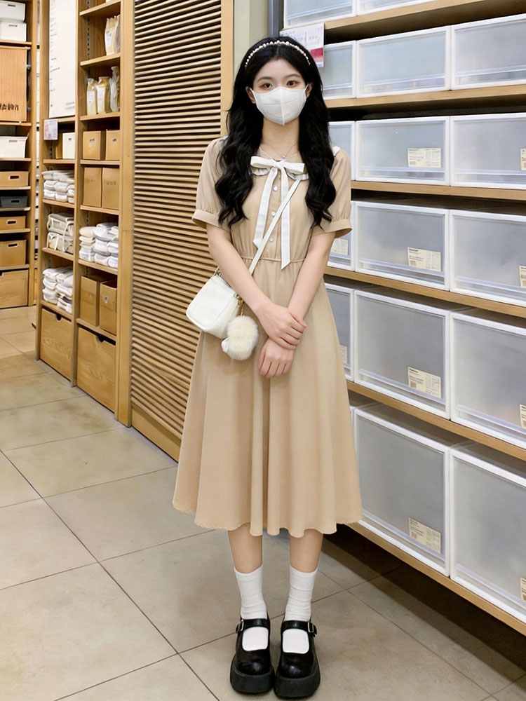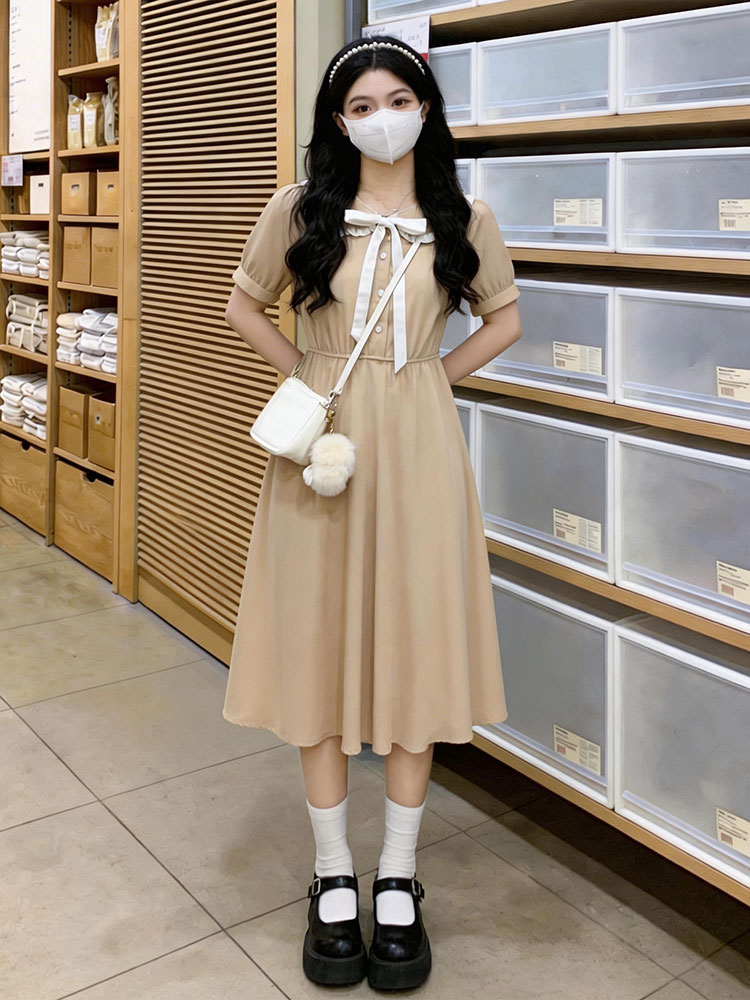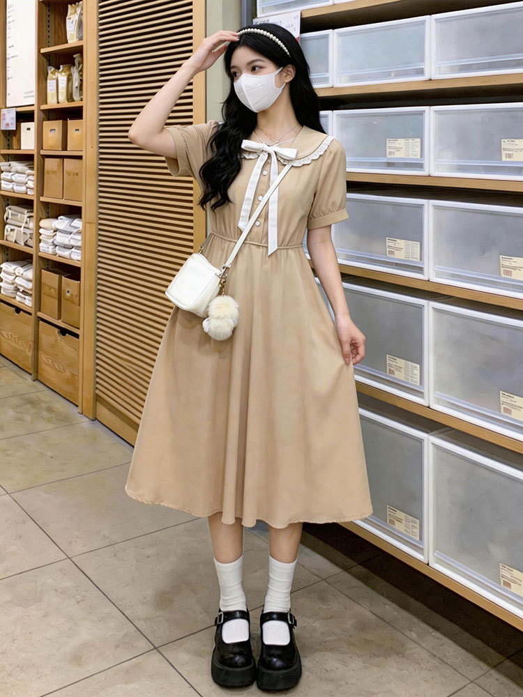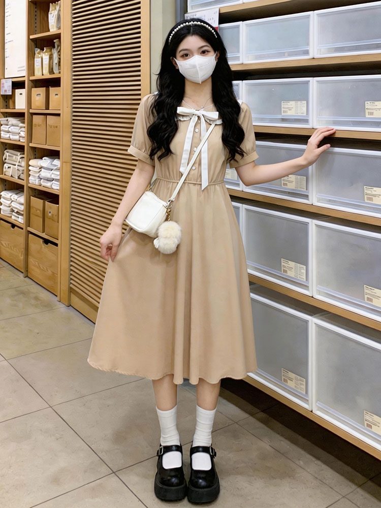RY3769# 实拍2026日系甜妹娃娃领连衣裙夏季卡其色收腰显瘦木耳边中长裙