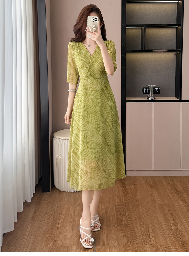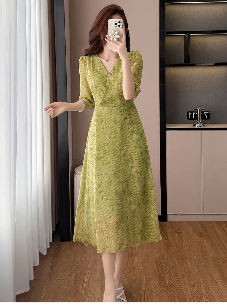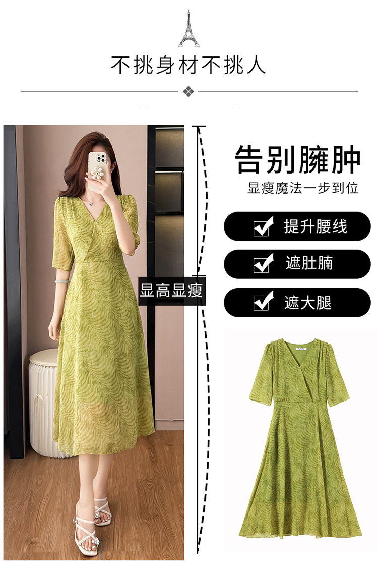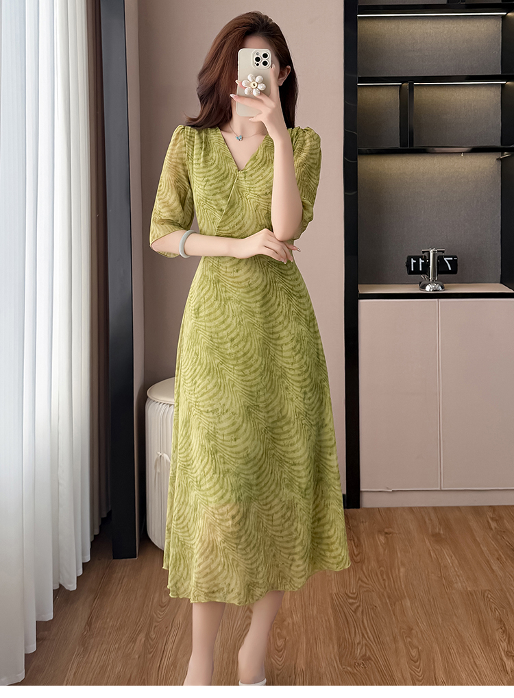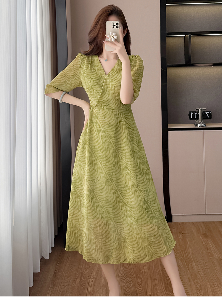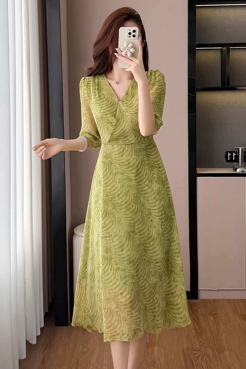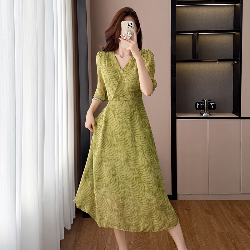 RY3771# 时尚洋气夏季轻薄透气雪纺连衣裙修身显瘦中长款阔太太女装妈妈装