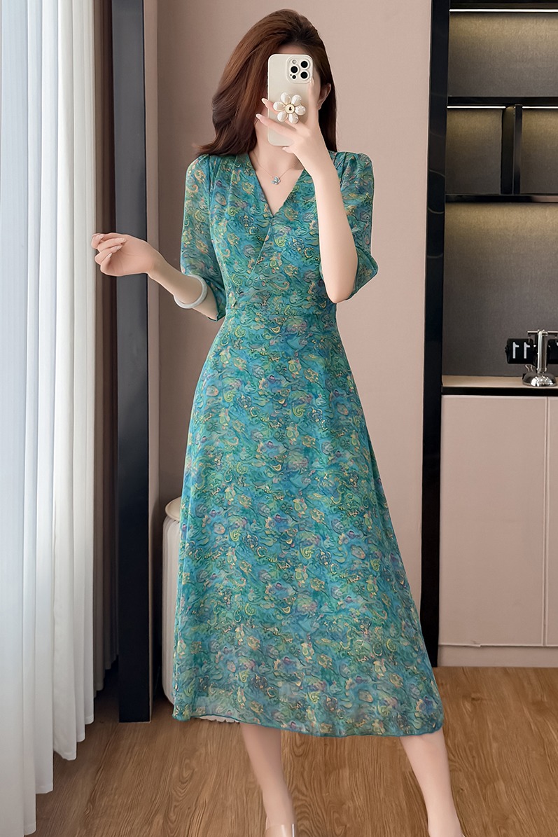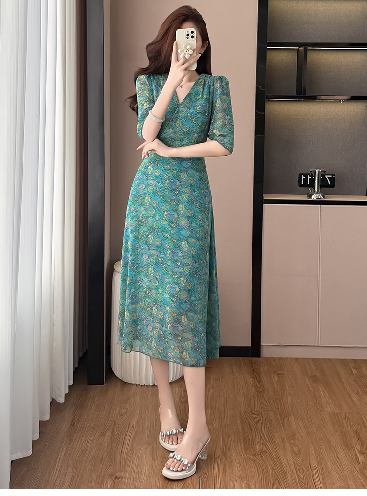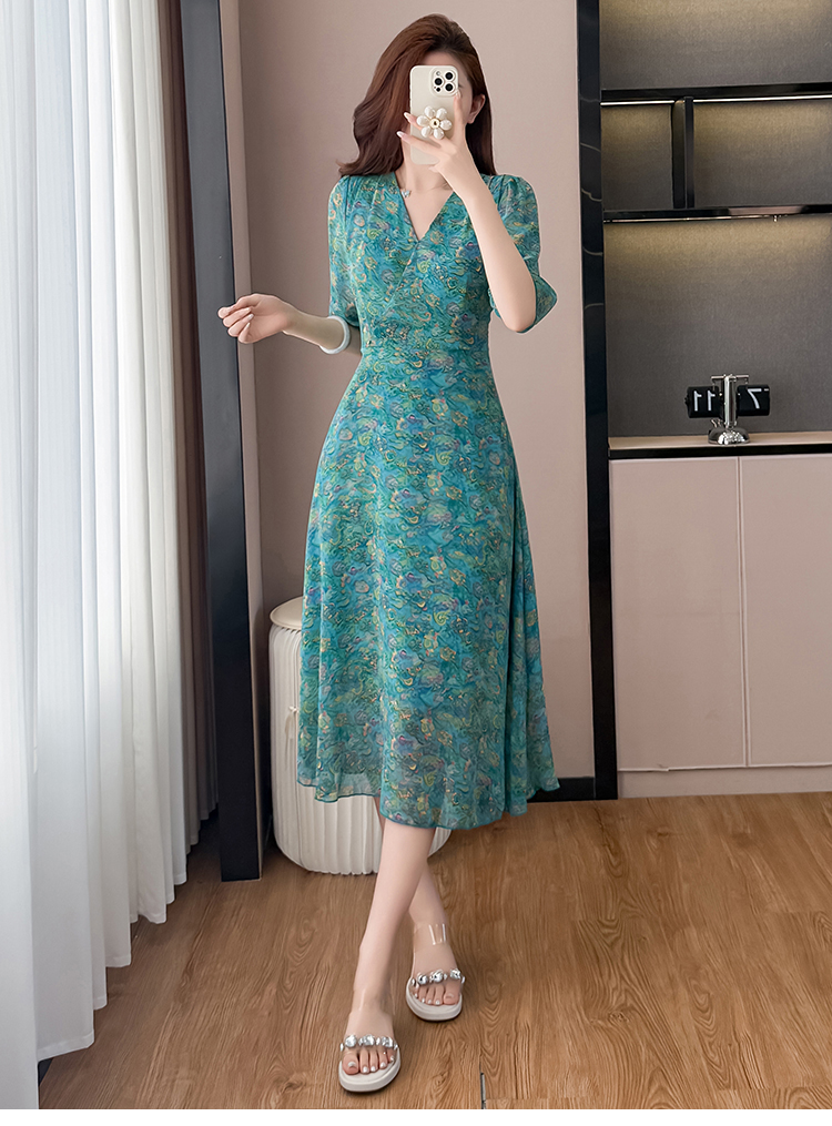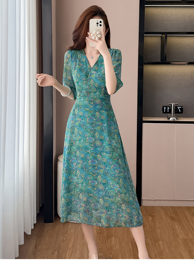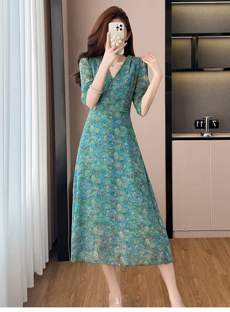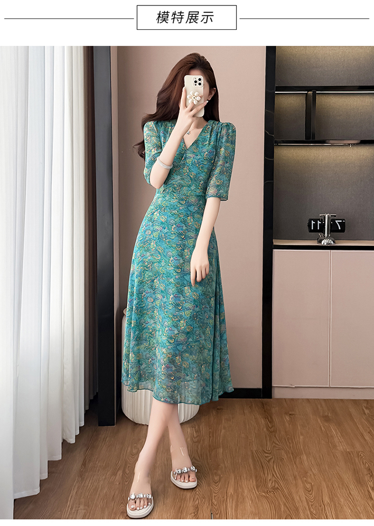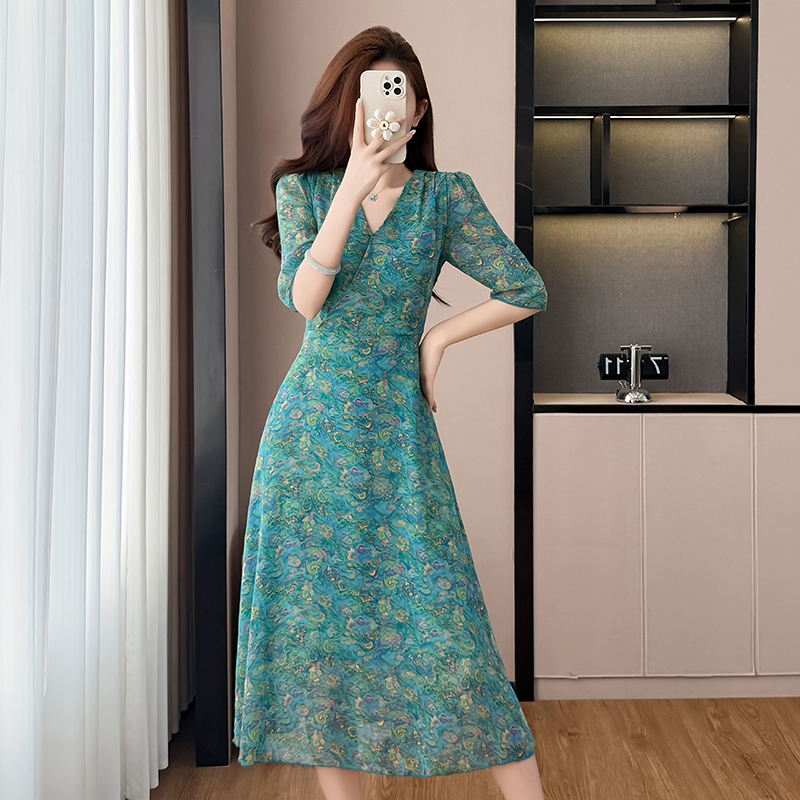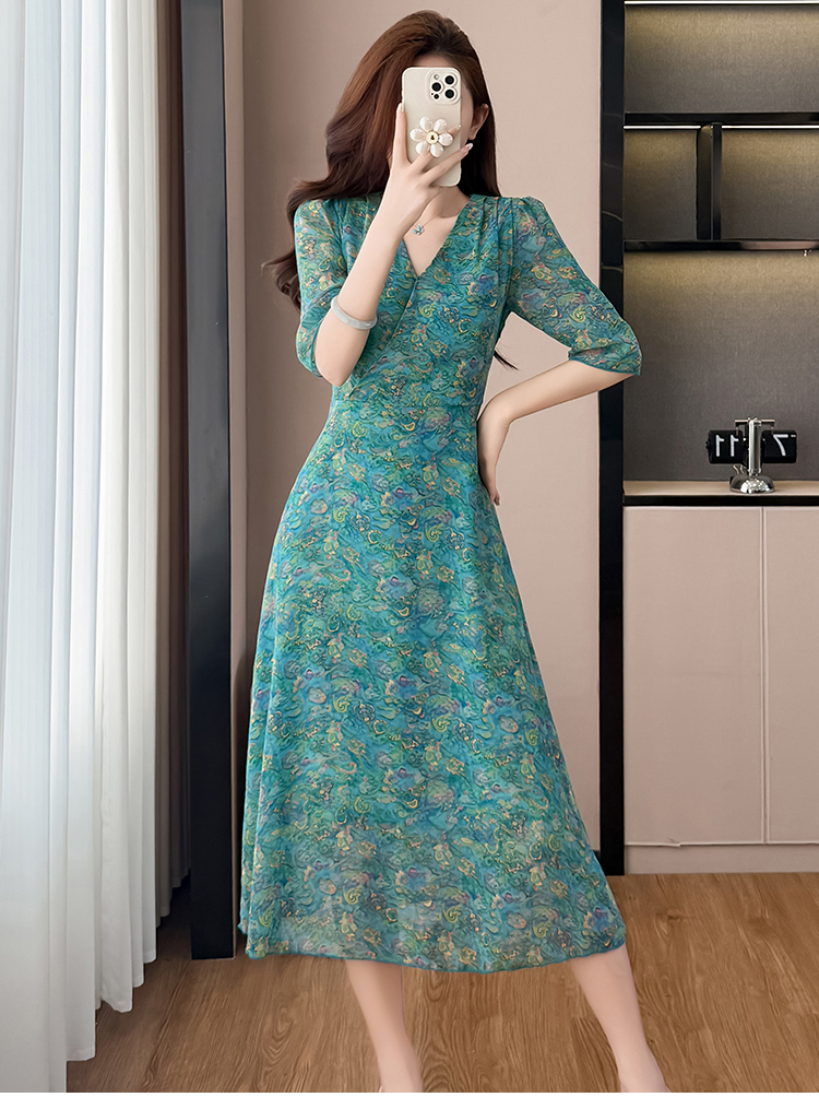 RY3772# 雪纺碎花时尚洋气修身显瘦中长款阔太太妈妈装短袖连衣裙夏季新款