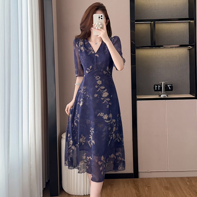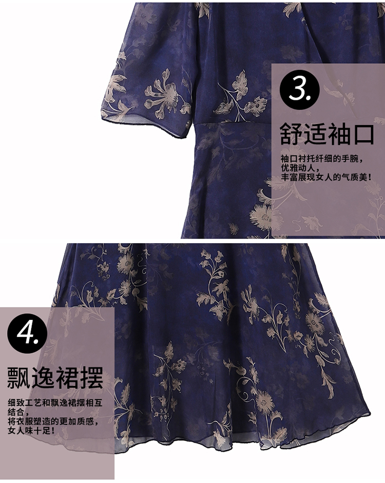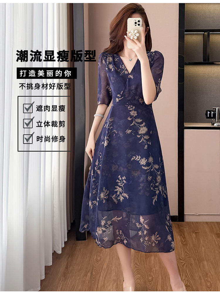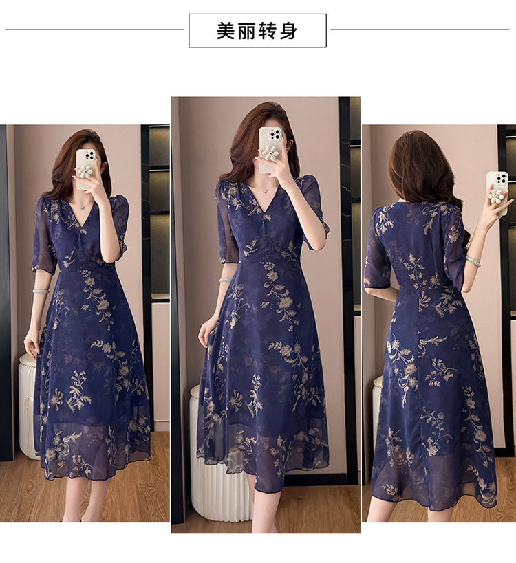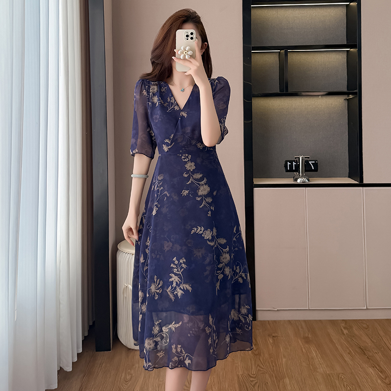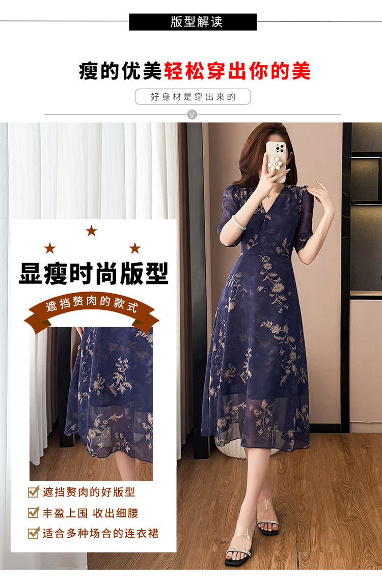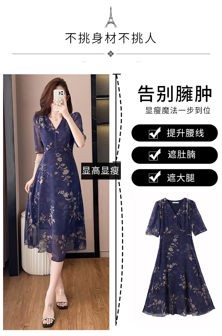 RY3773# 藏蓝色雪纺修身显瘦中长款夏季新款阔太太妈妈装时尚洋气A字裙子