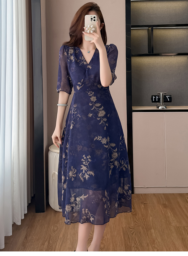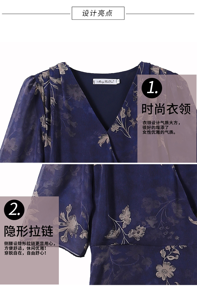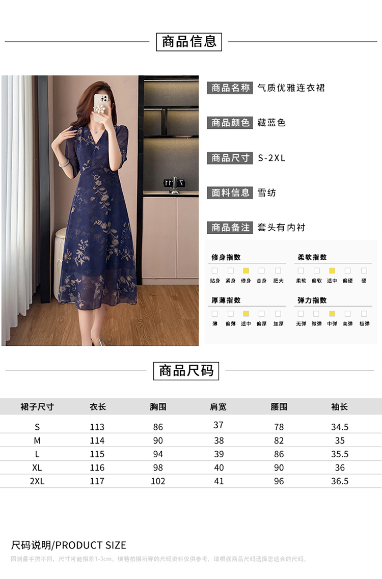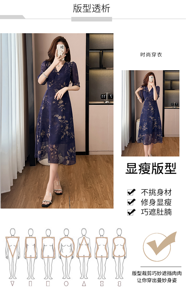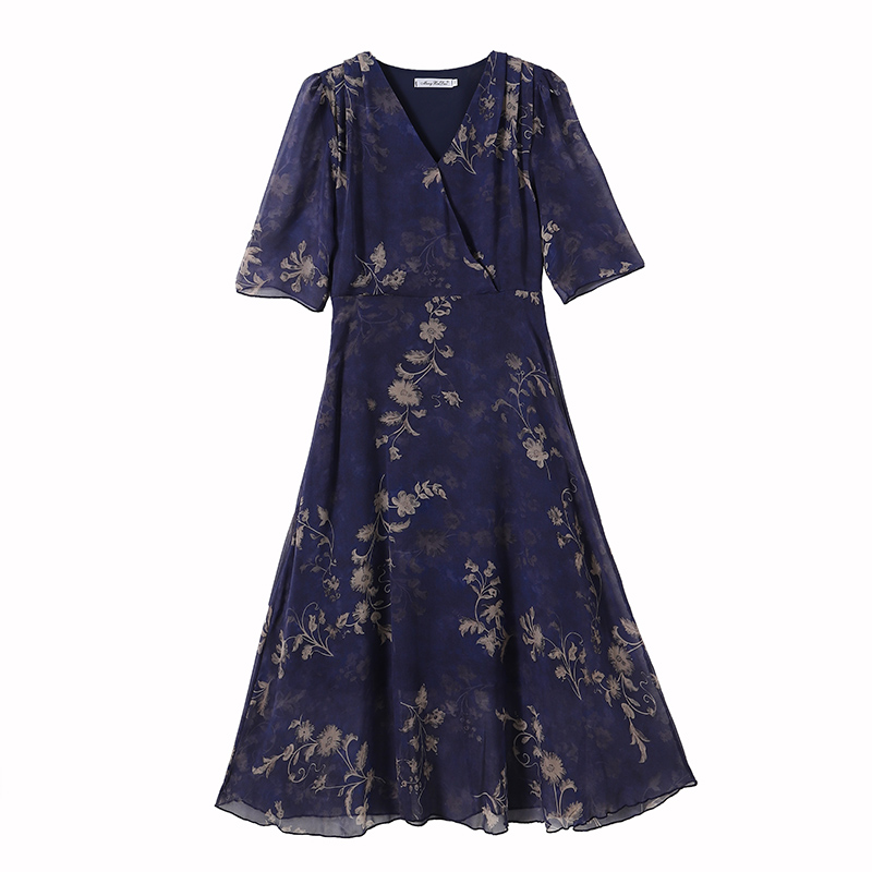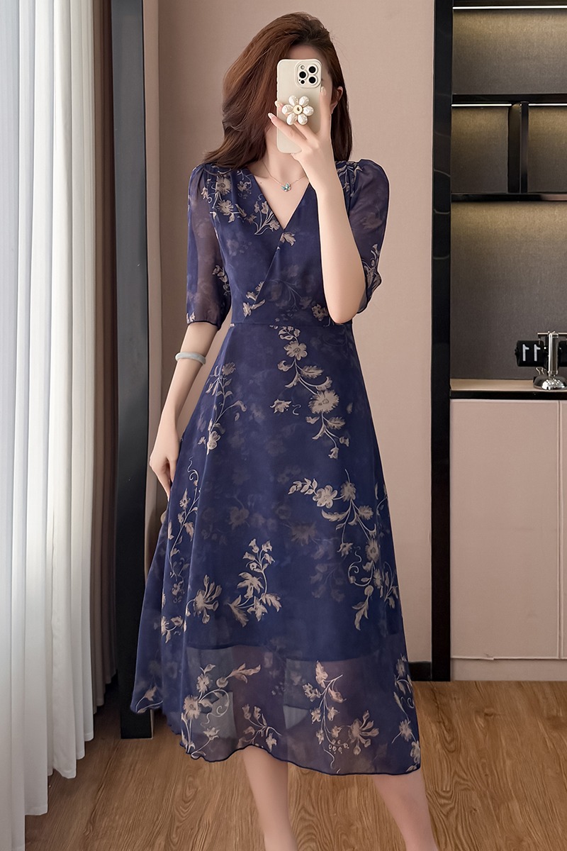RY3773# 藏蓝色雪纺修身显瘦中长款夏季新款阔太太妈妈装时尚洋气A字裙子
