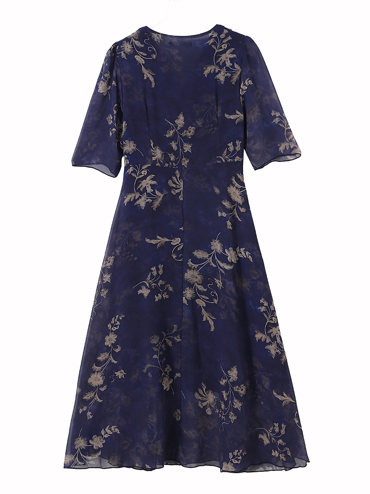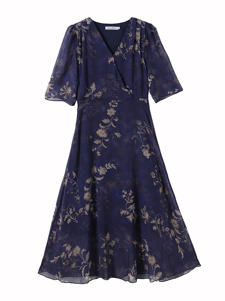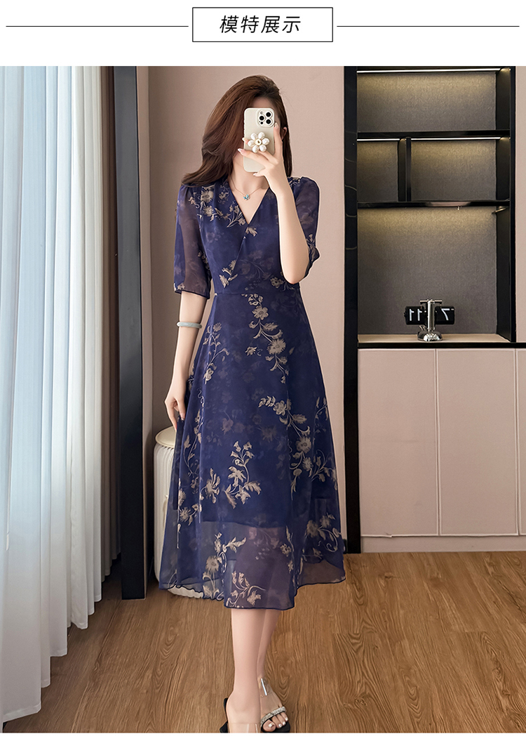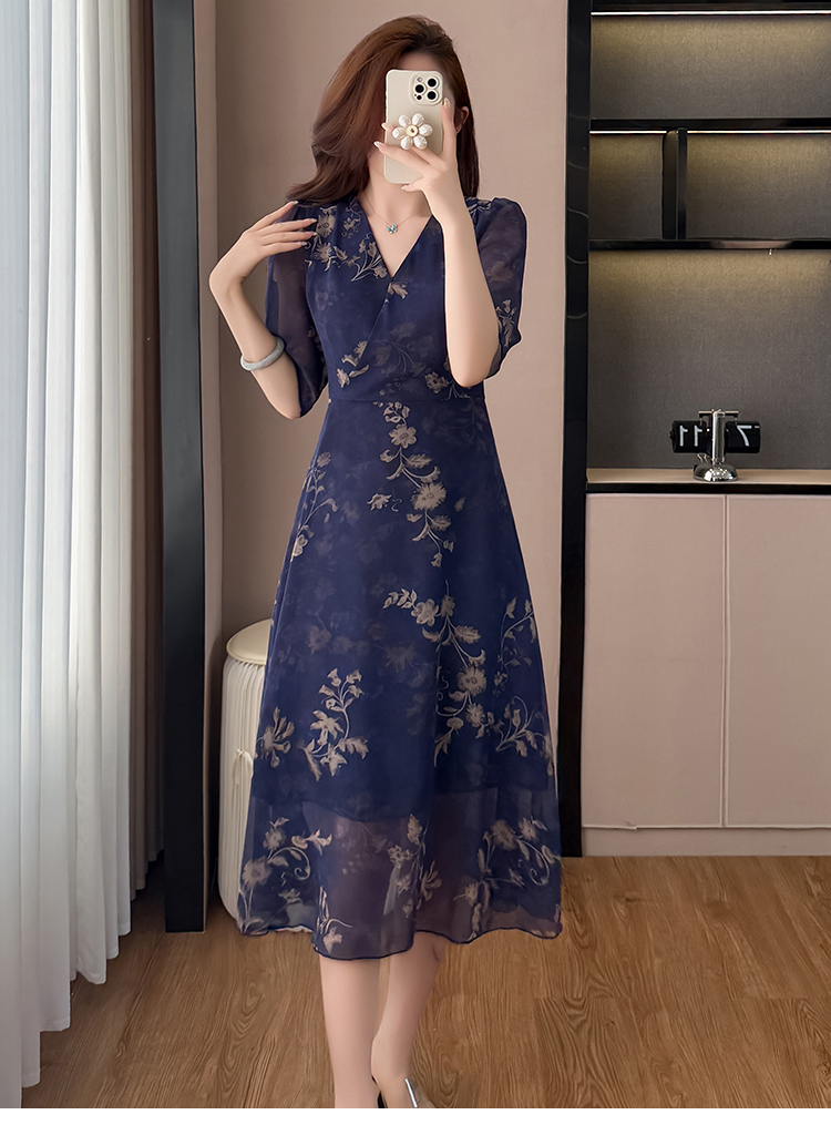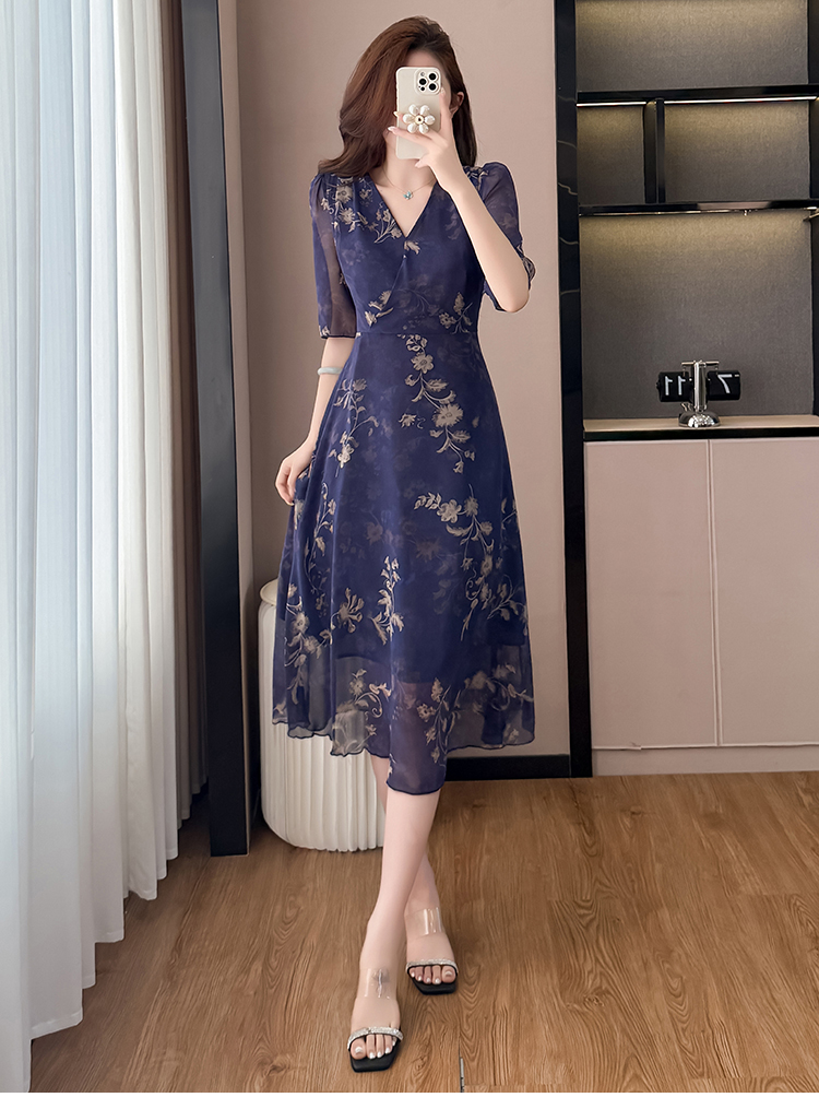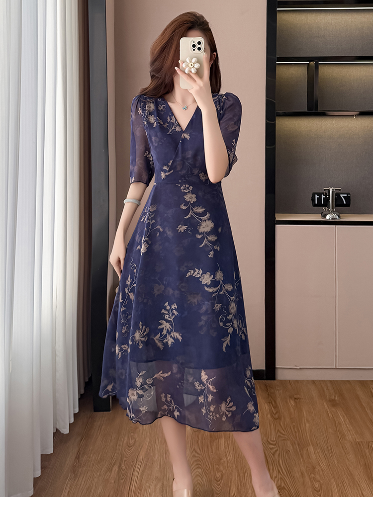 RY3773# 藏蓝色雪纺修身显瘦中长款夏季新款阔太太妈妈装时尚洋气A字裙子