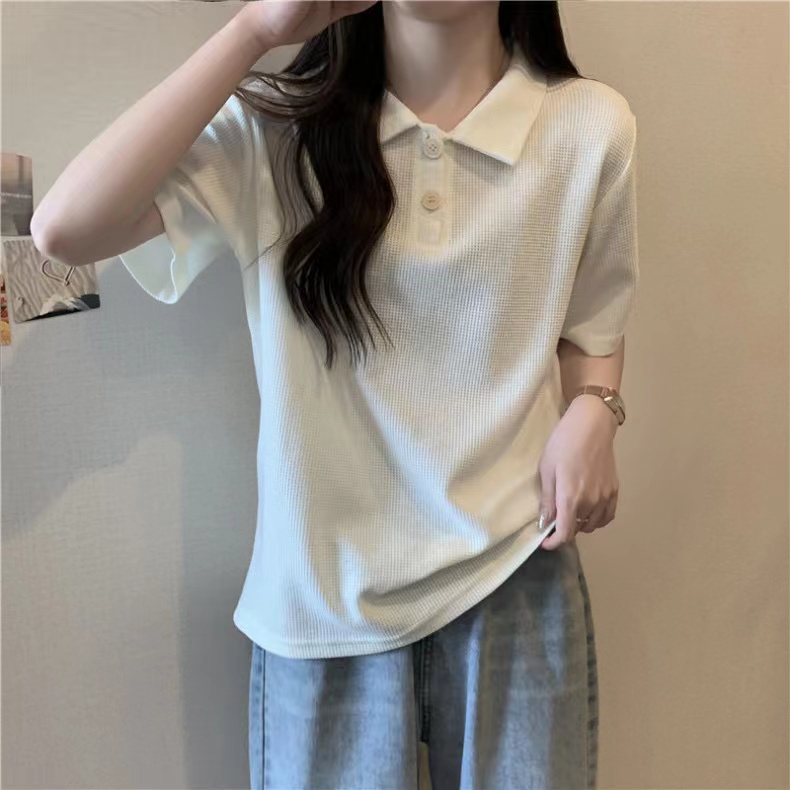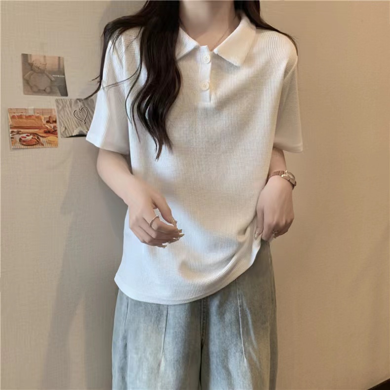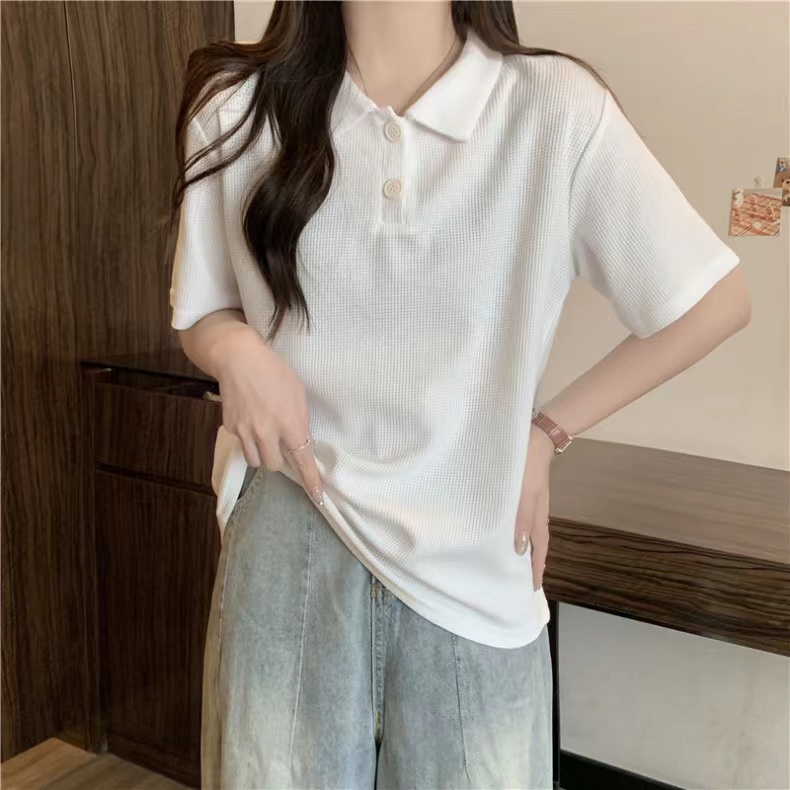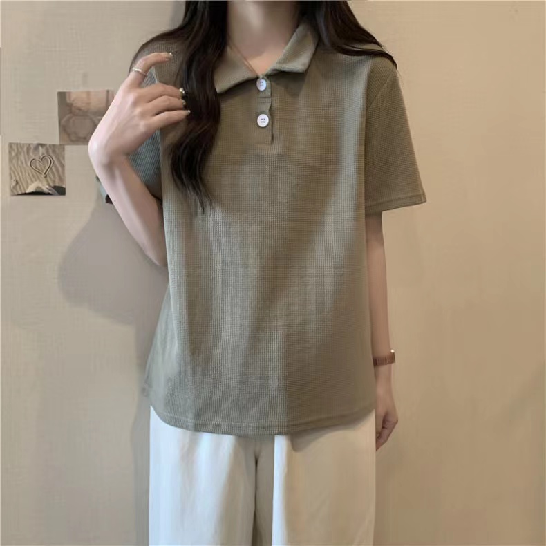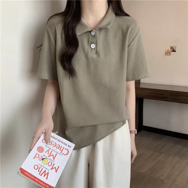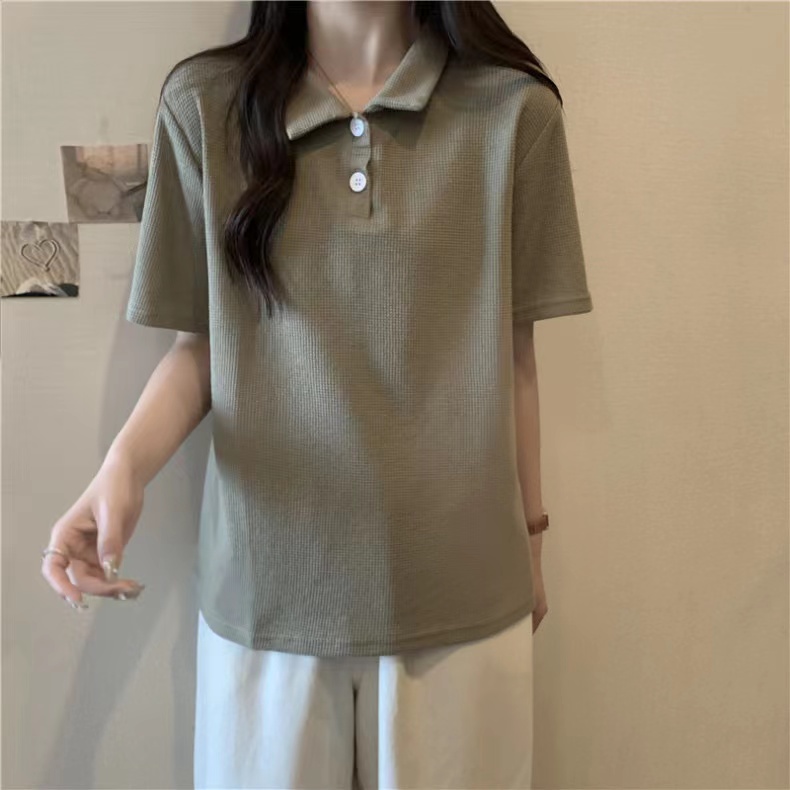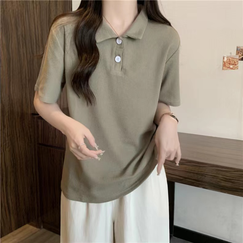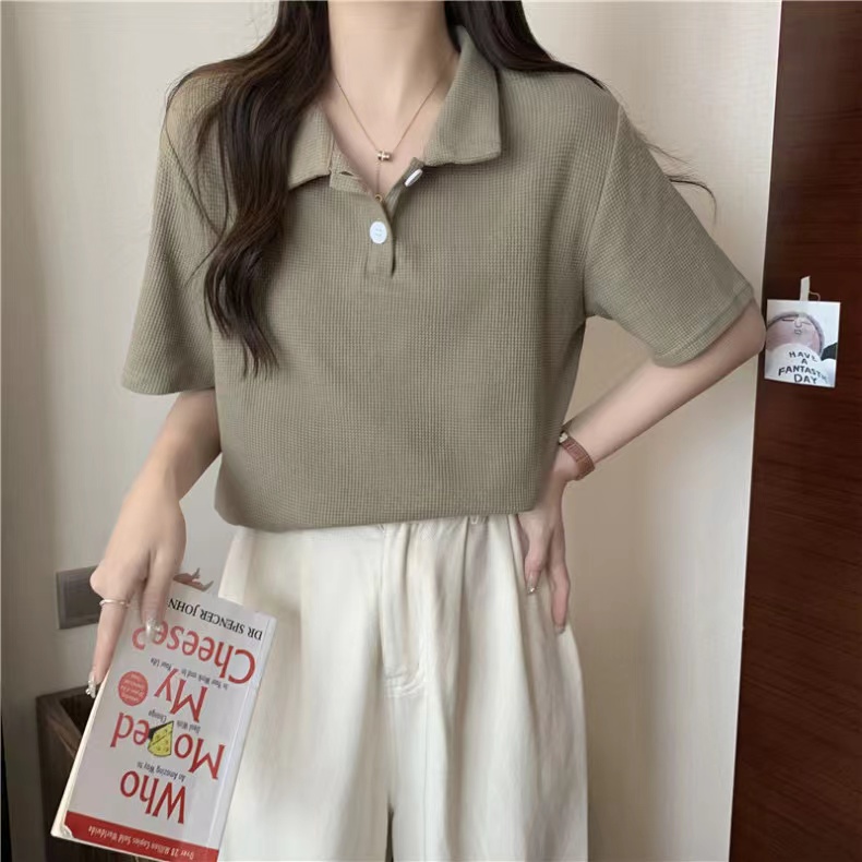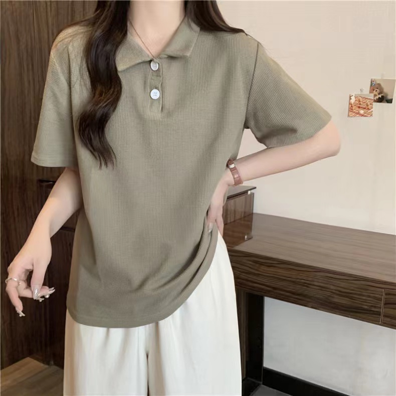 RY3780# 实拍6535棉华夫格POLO领短袖T恤女