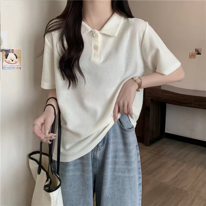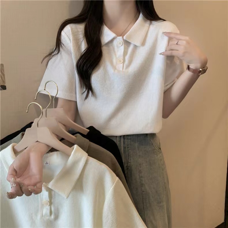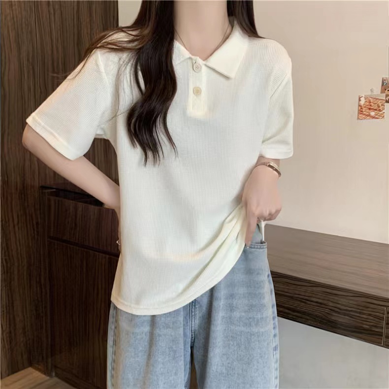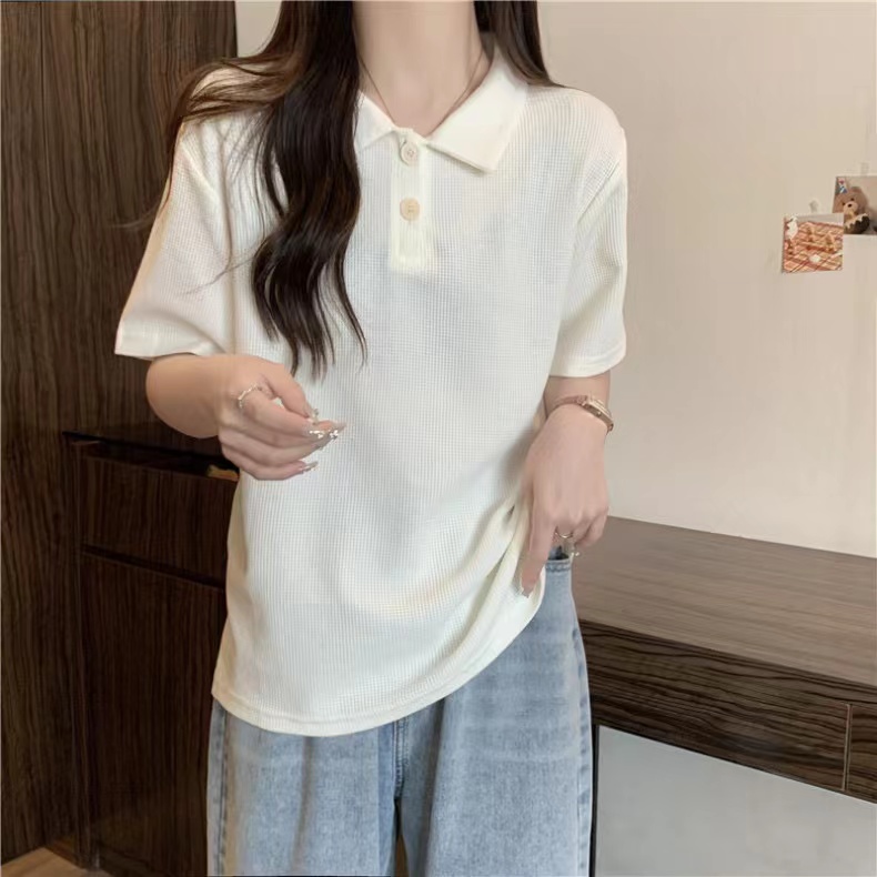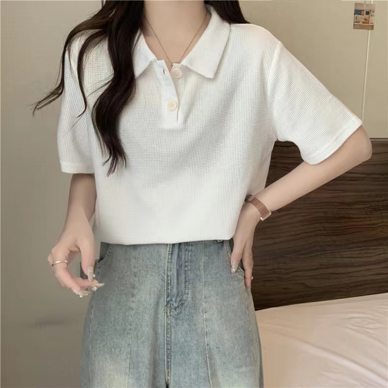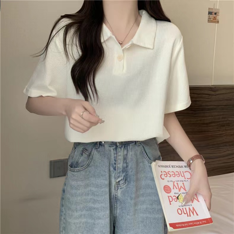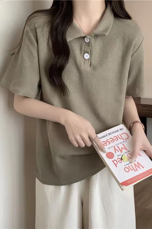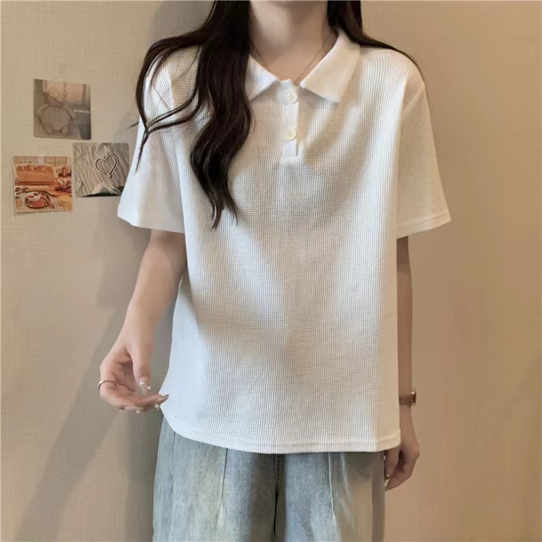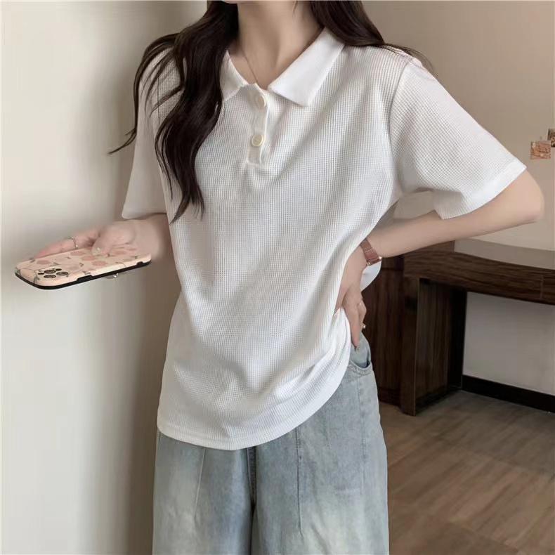 RY3780# 实拍6535棉华夫格POLO领短袖T恤女