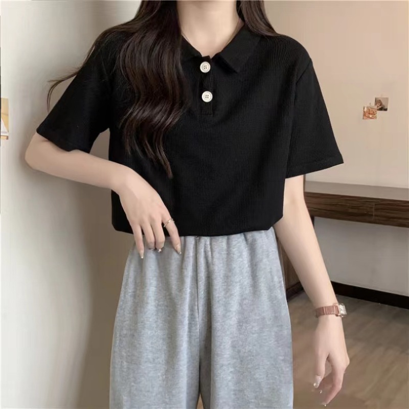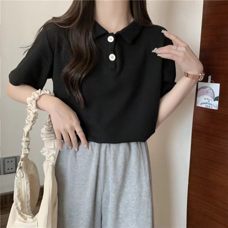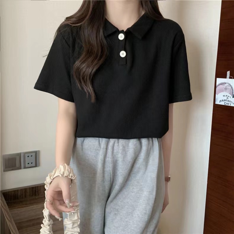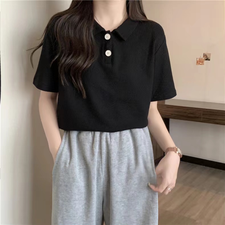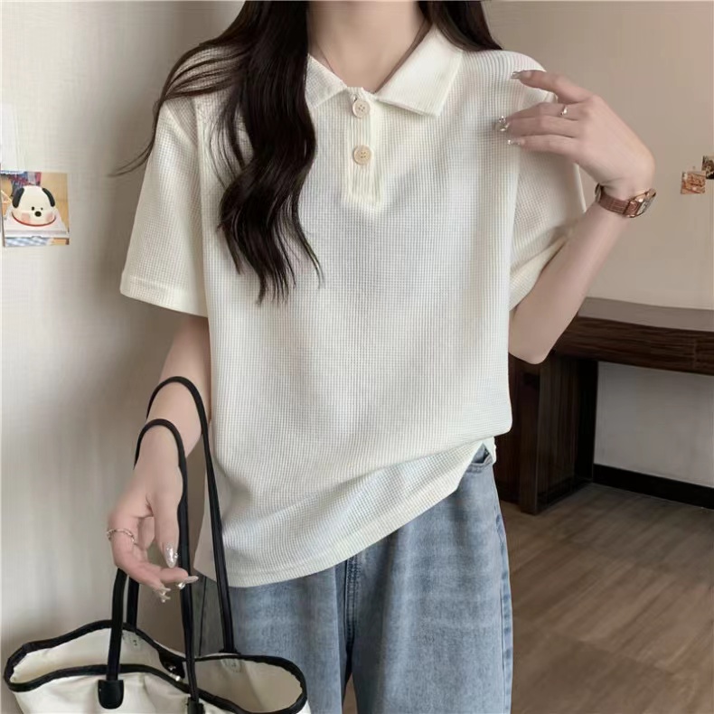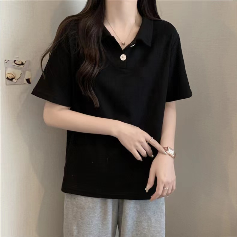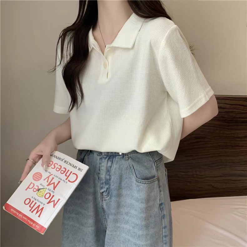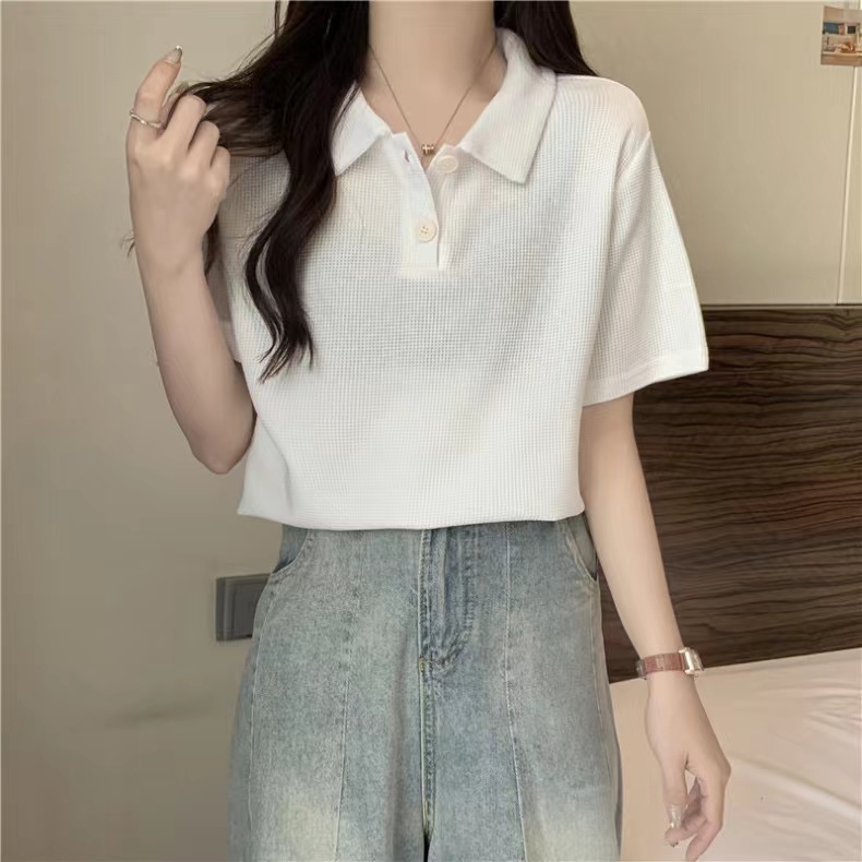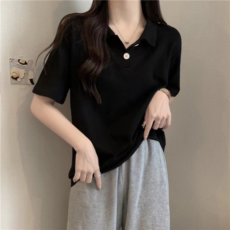 RY3780# 实拍6535棉华夫格POLO领短袖T恤女