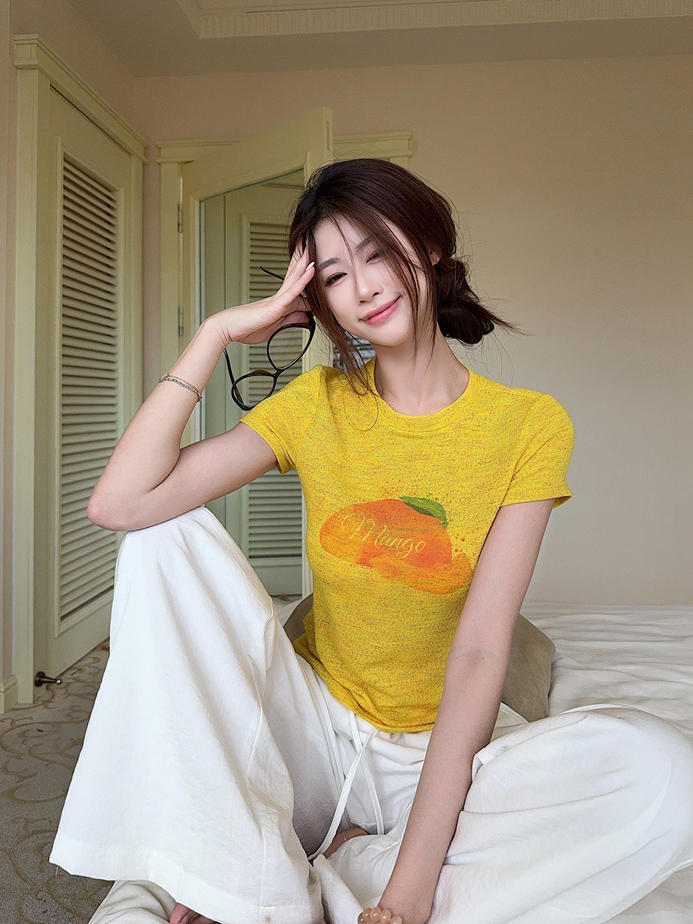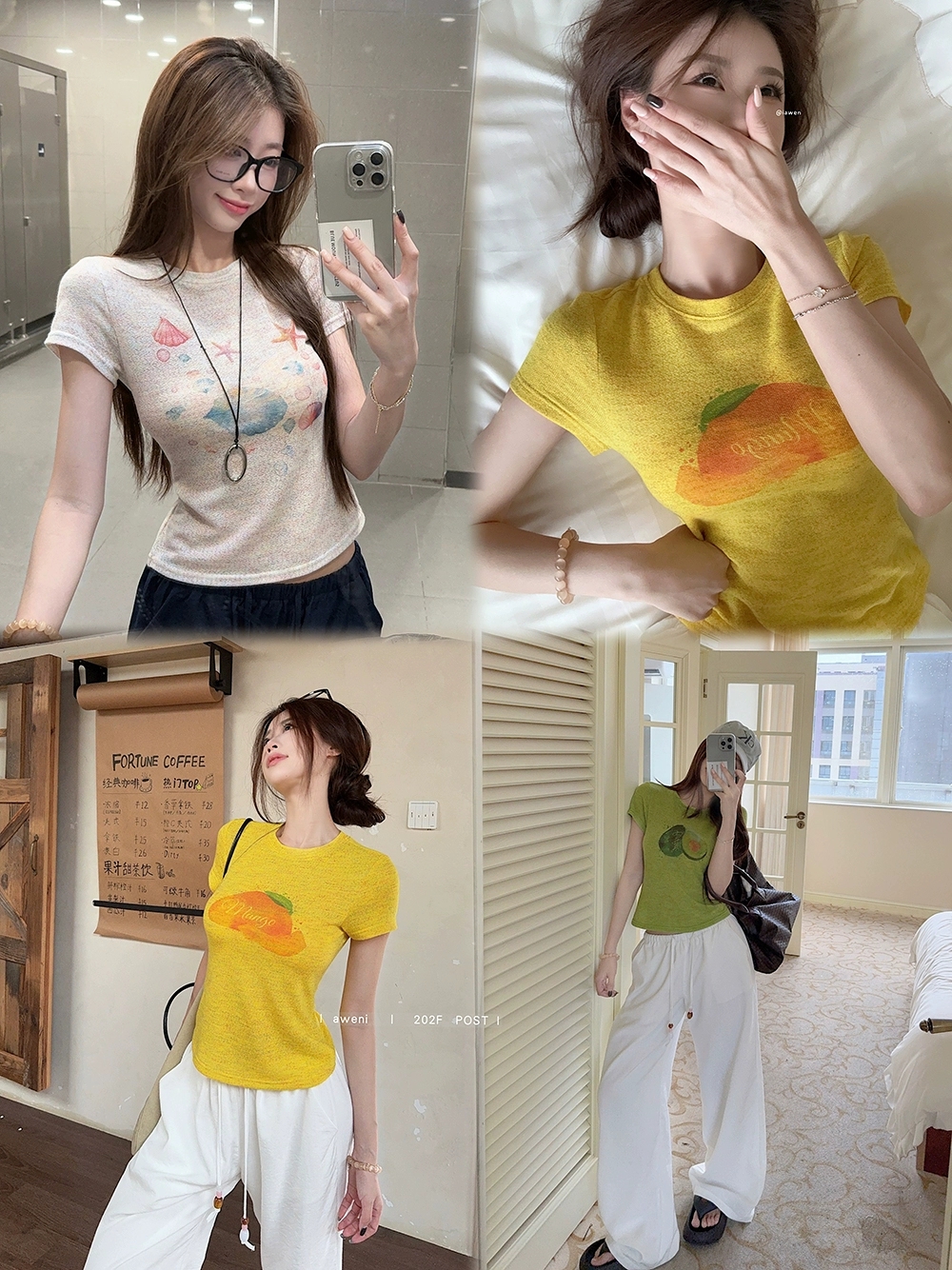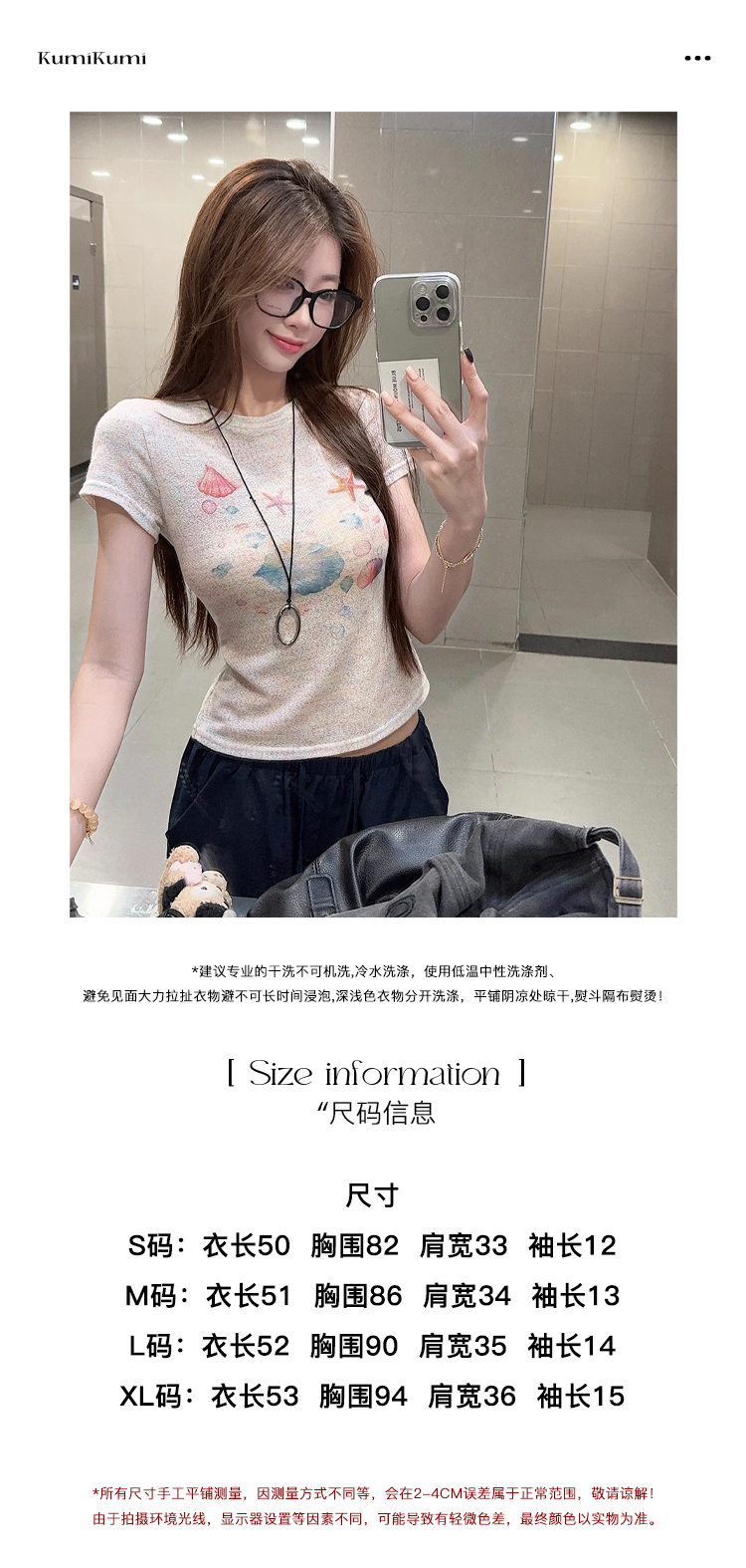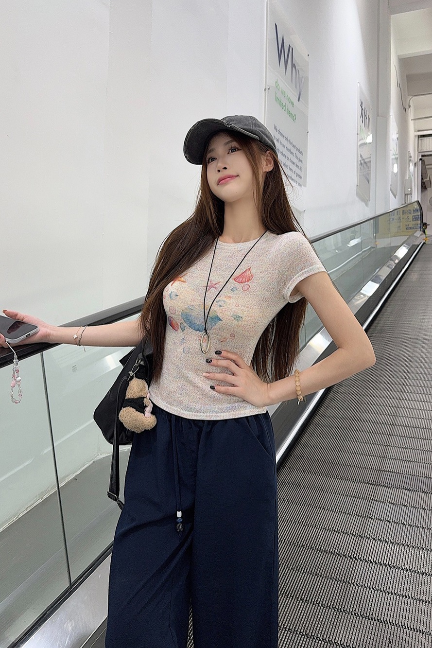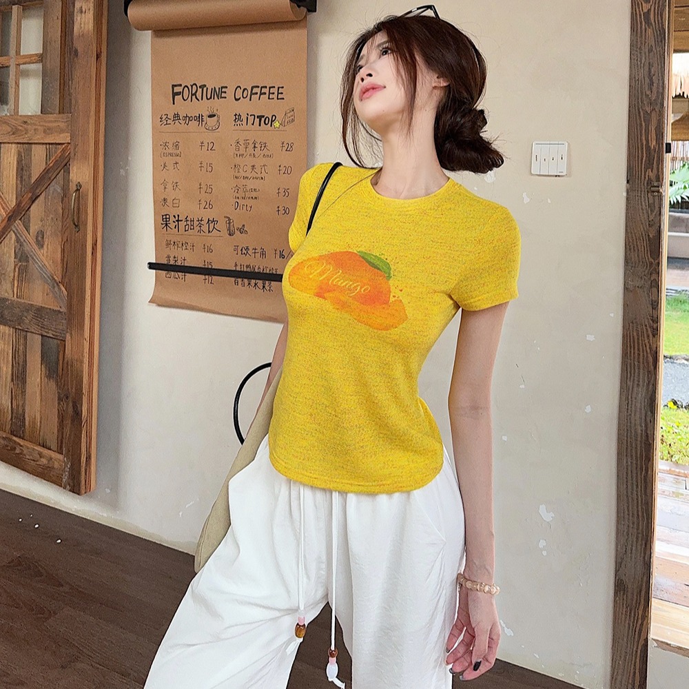 RY3784# 官图甜美风趣味印花圆领短袖T恤女夏季百搭减龄修身正肩短款上衣