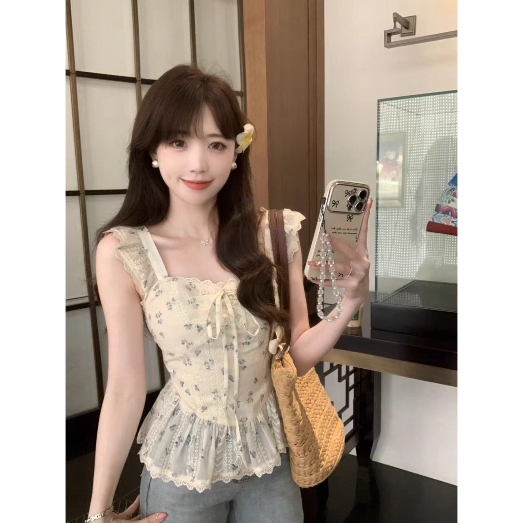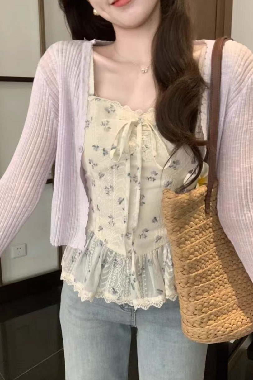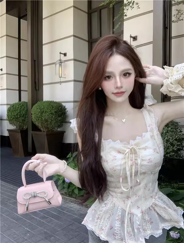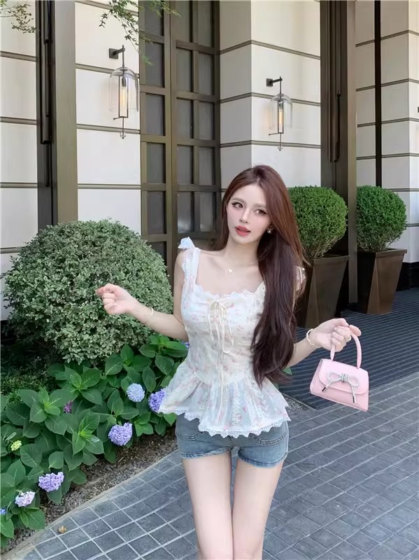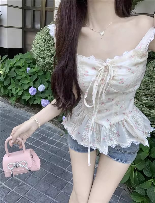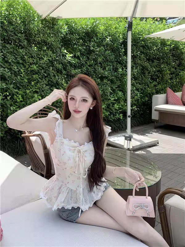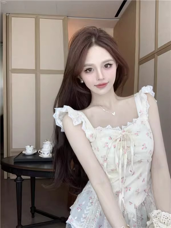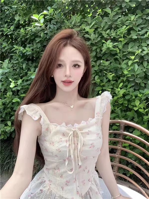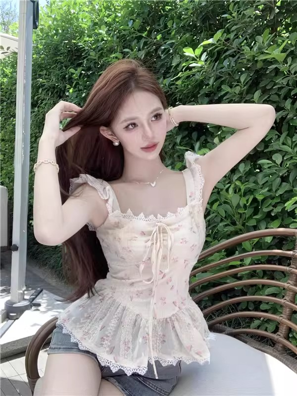 RY3804# 温柔风桔梗洋气吊带背心女外穿高级感纯欲甜美碎花收腰小飞袖上衣