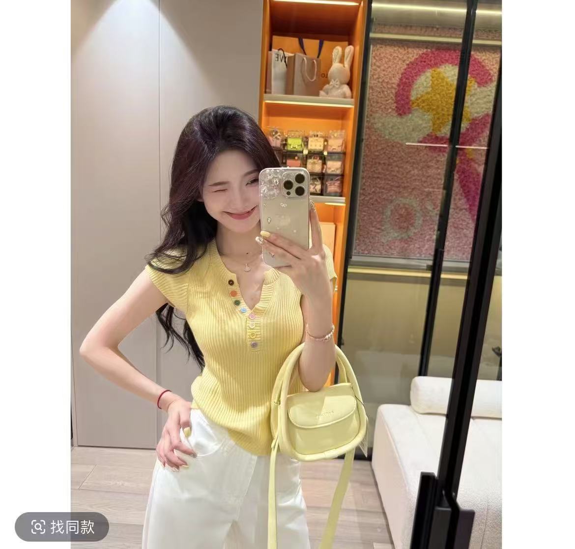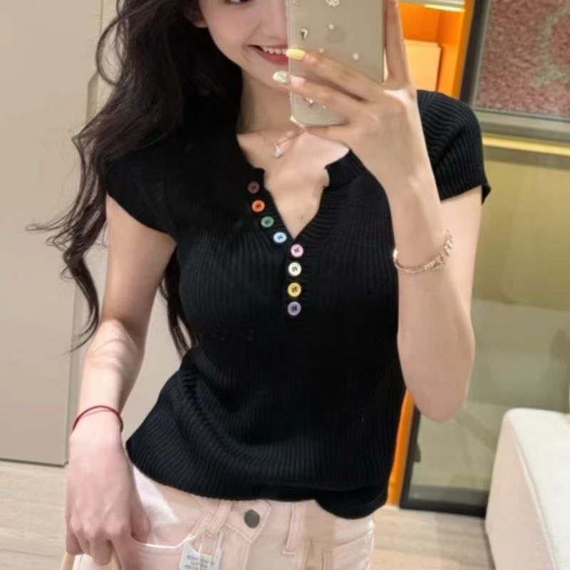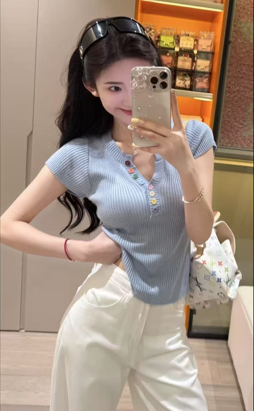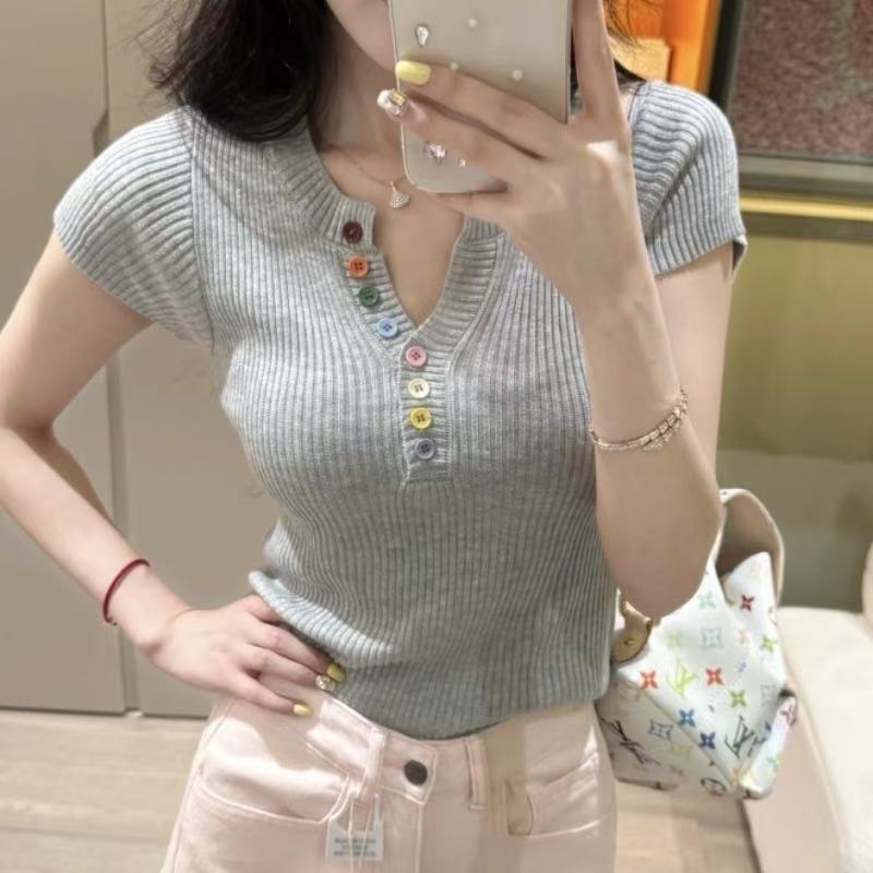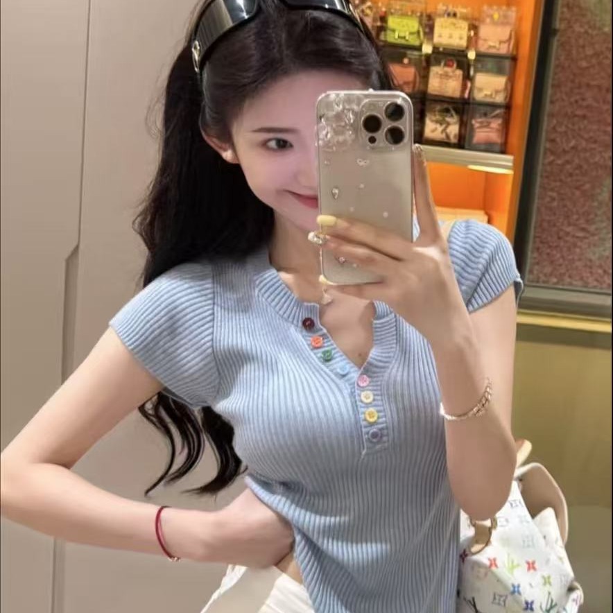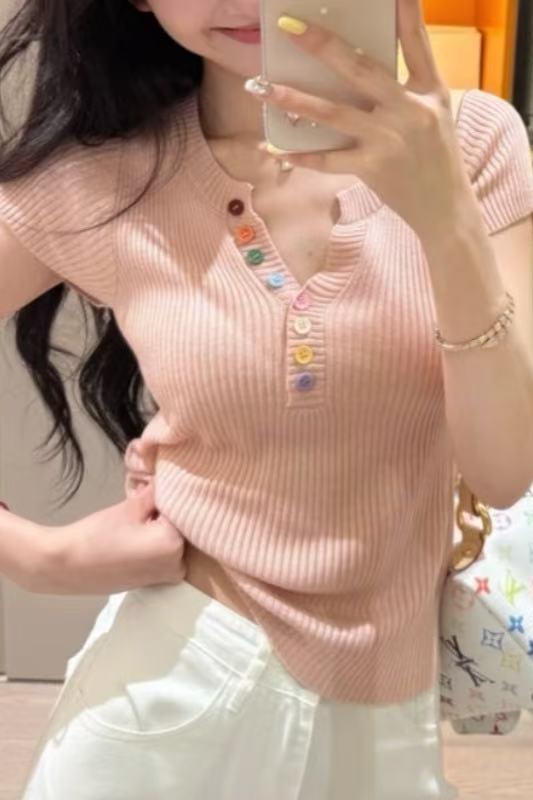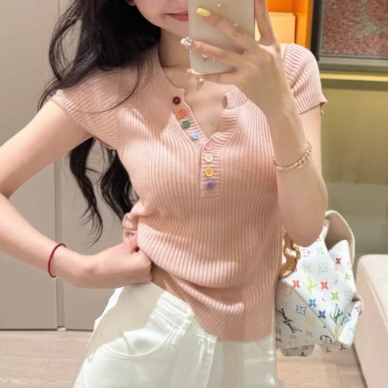 RY3829#韩版夏色纽扣V领小香风针织衫女夏新款减龄时尚别致显瘦上衣