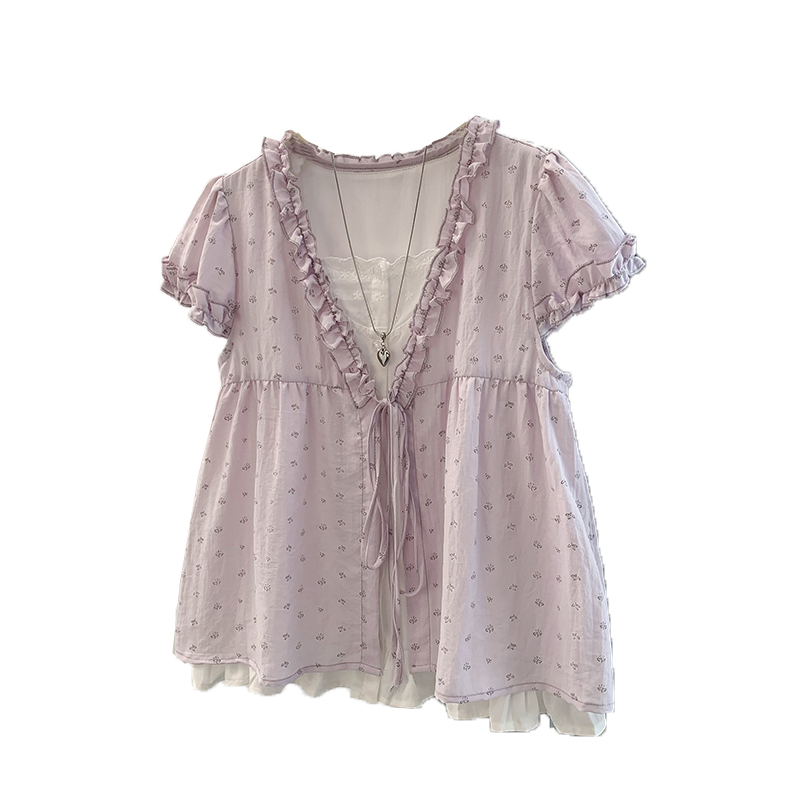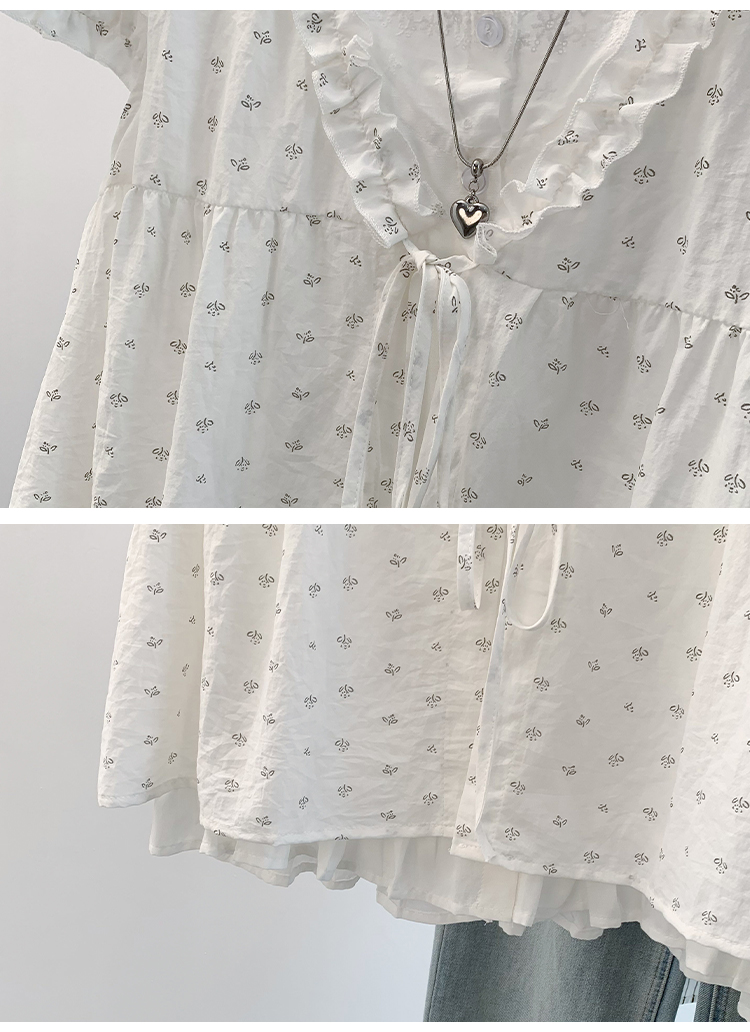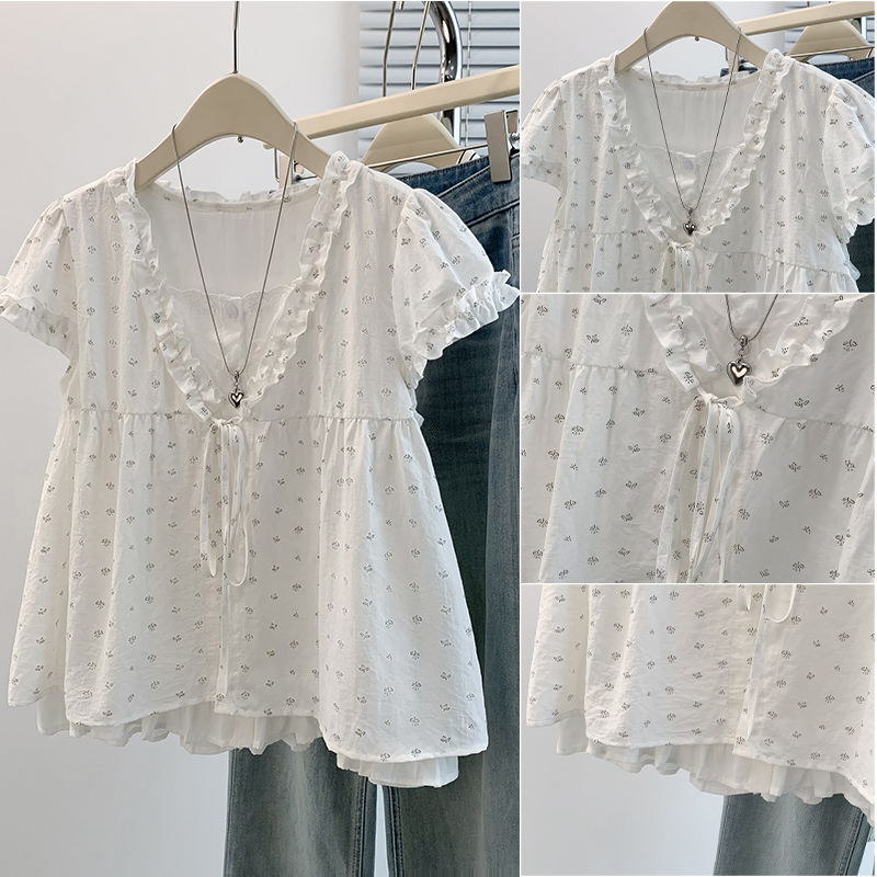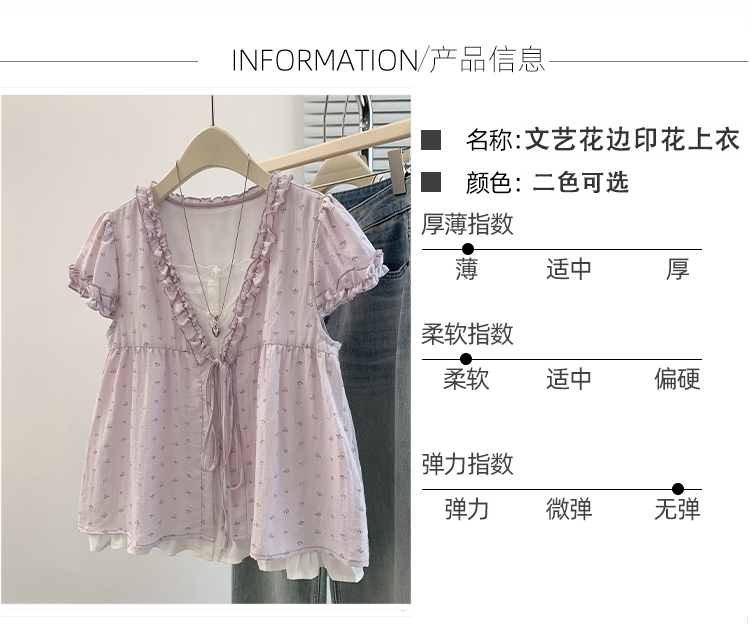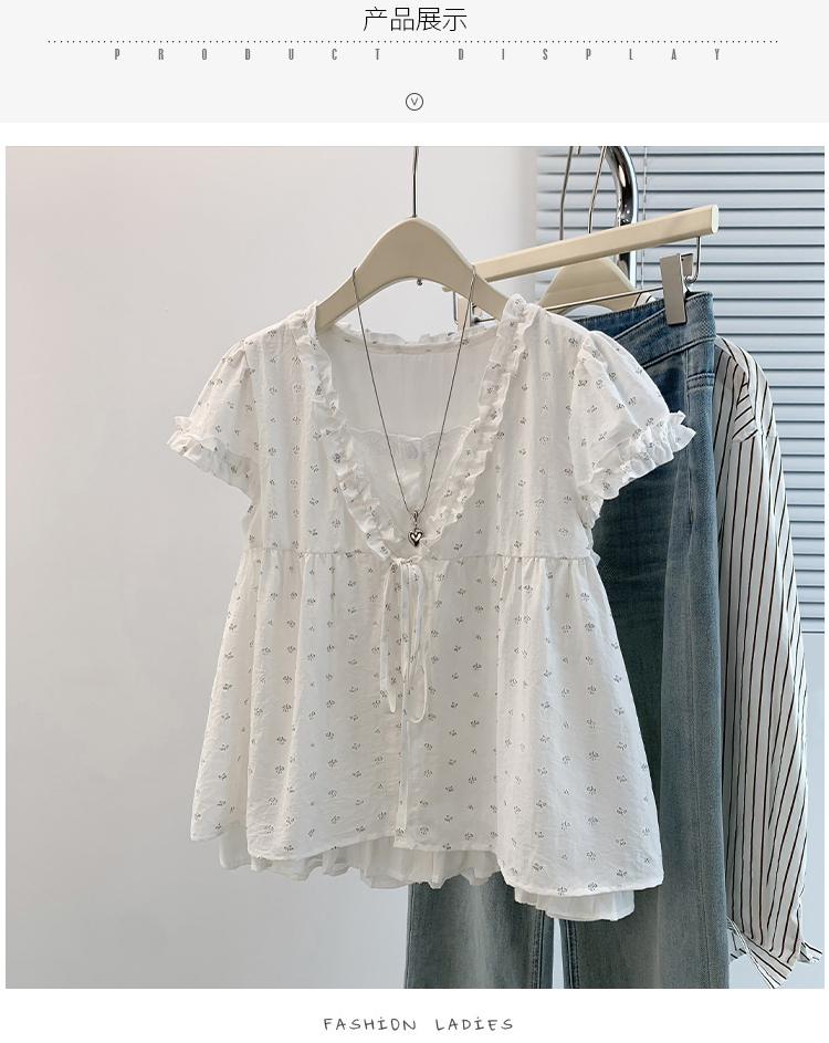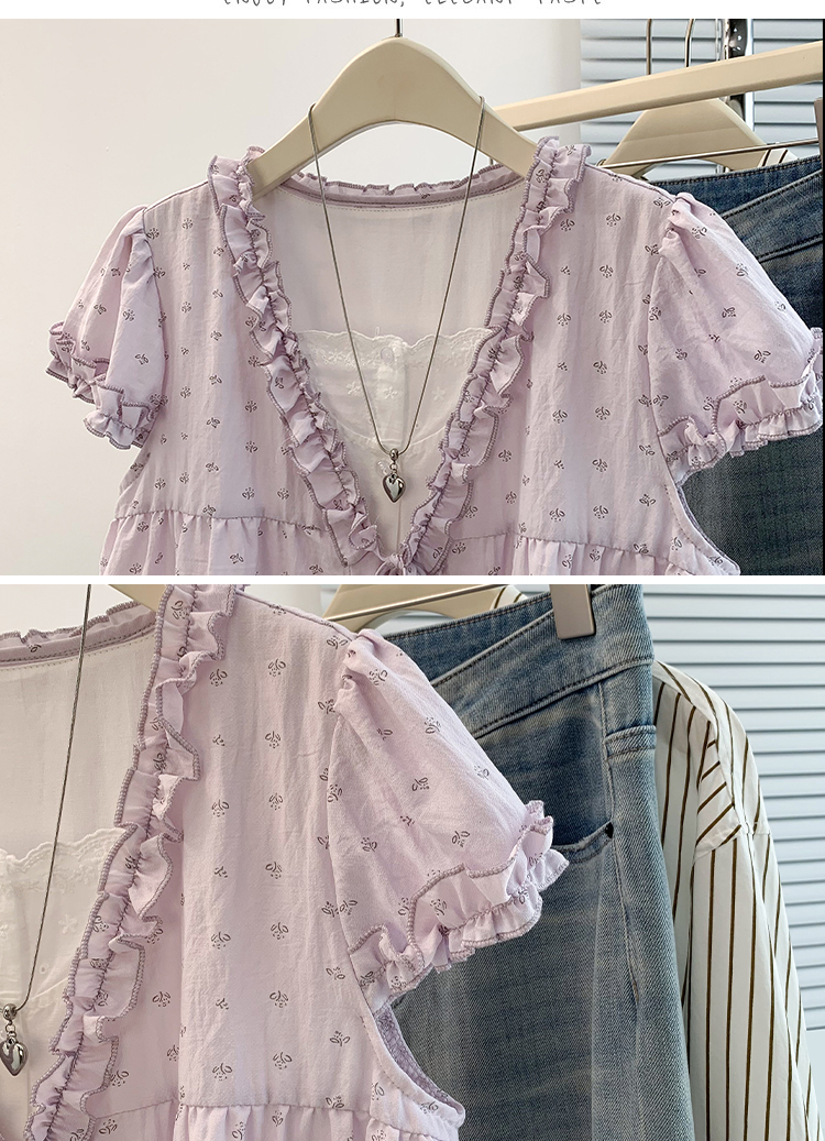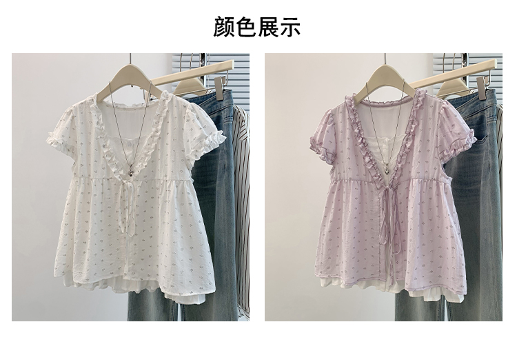 RY4059# 实拍 大码女装 假两件木耳边短袖上衣 宽松显瘦减龄v领甜系娃娃衫