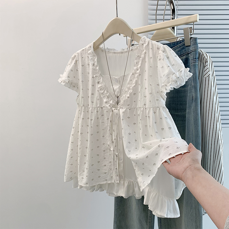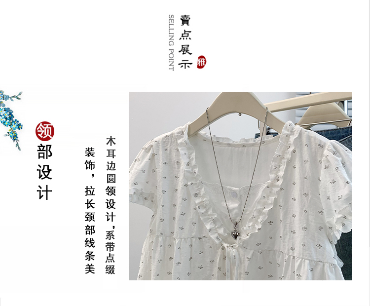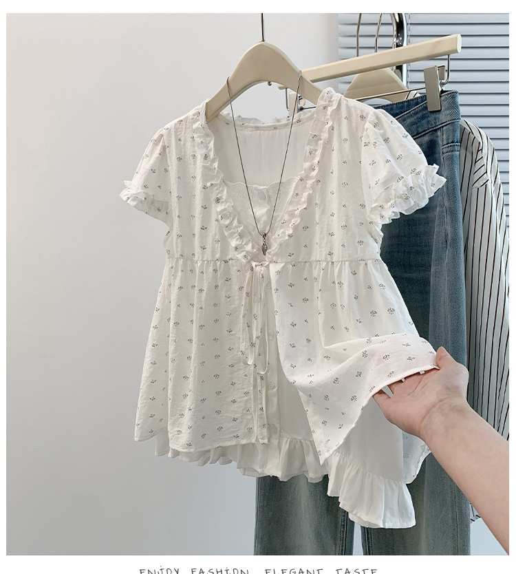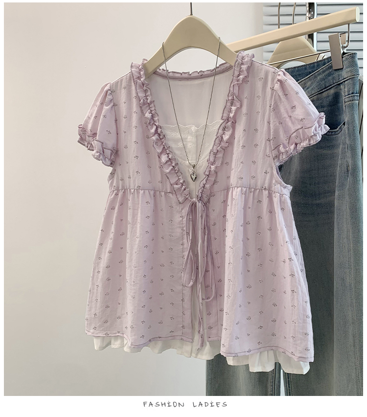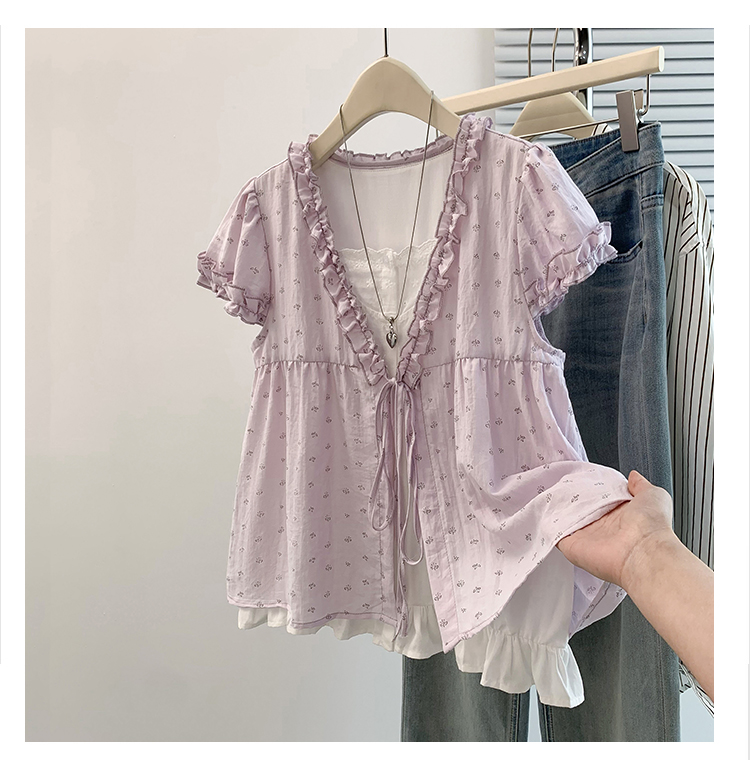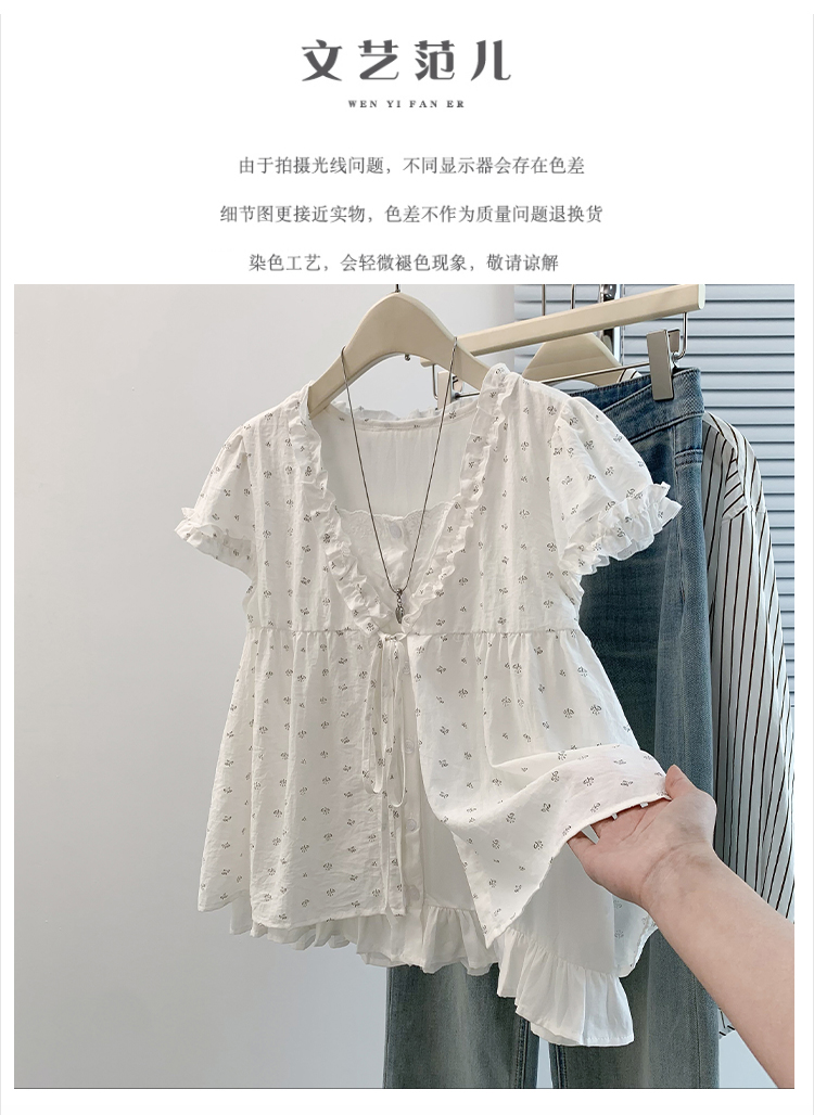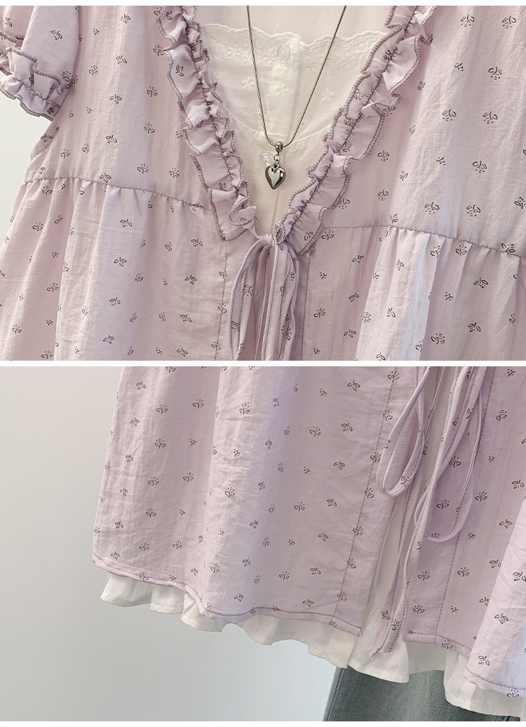 RY4059# 实拍 大码女装 假两件木耳边短袖上衣 宽松显瘦减龄v领甜系娃娃衫