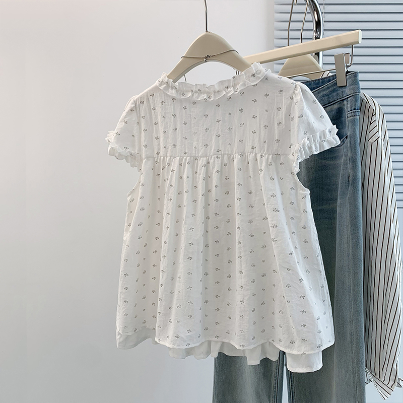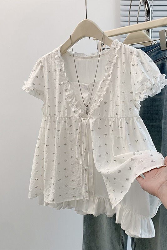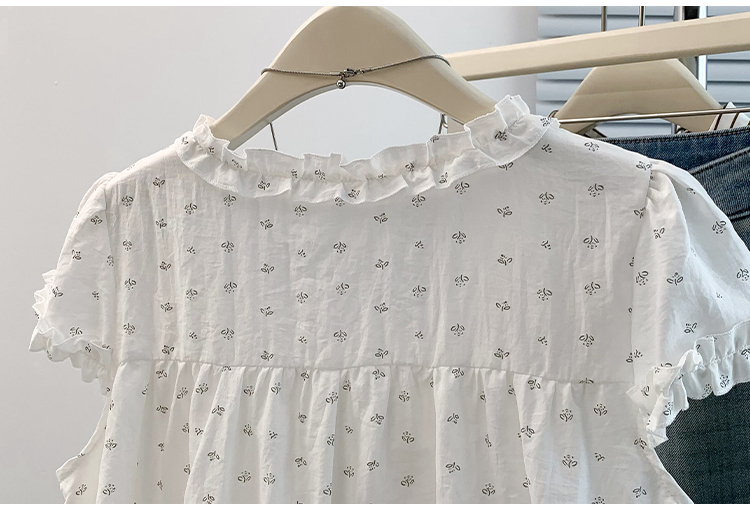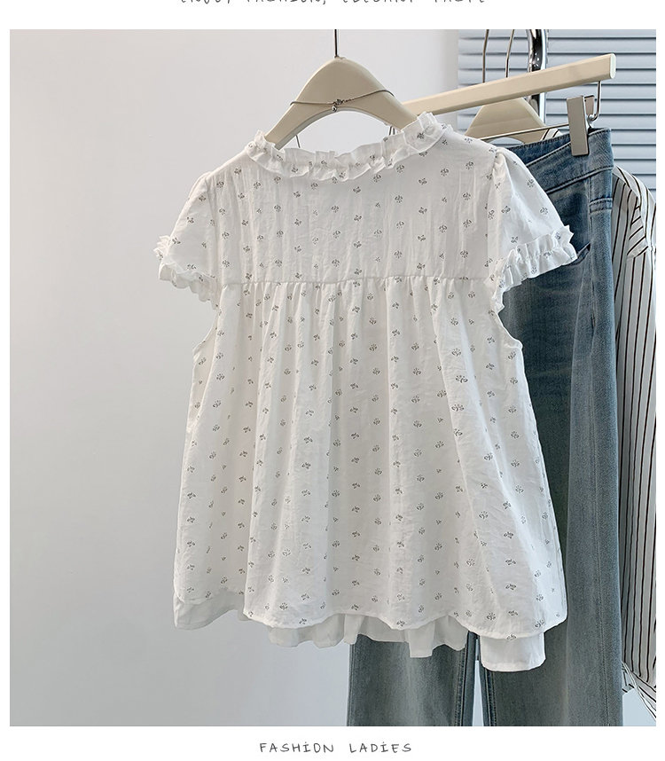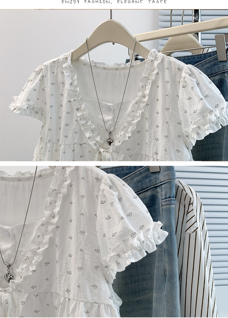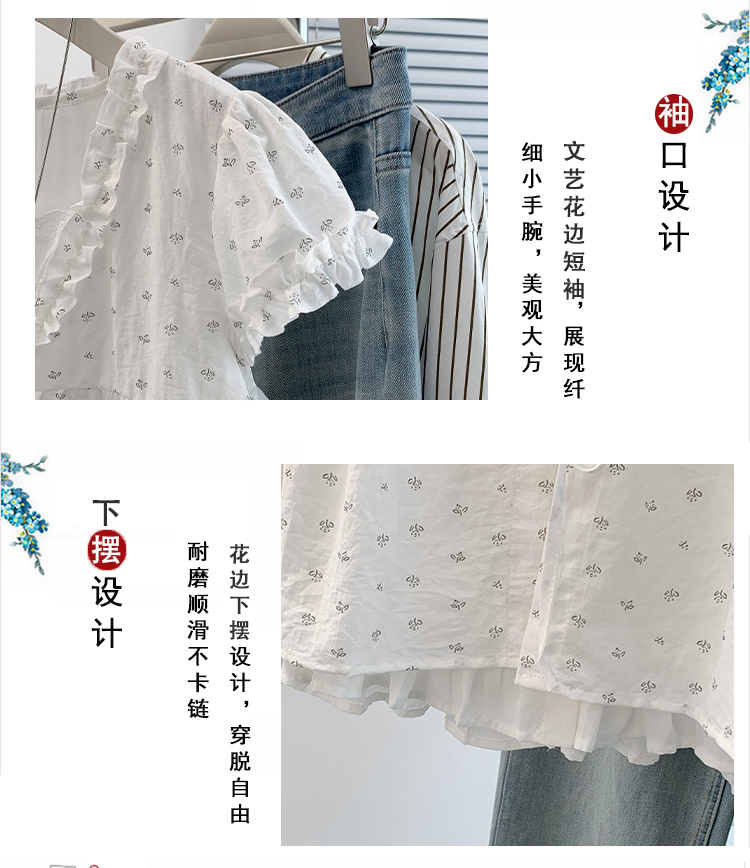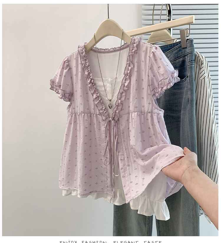 RY4059# 实拍 大码女装 假两件木耳边短袖上衣 宽松显瘦减龄v领甜系娃娃衫