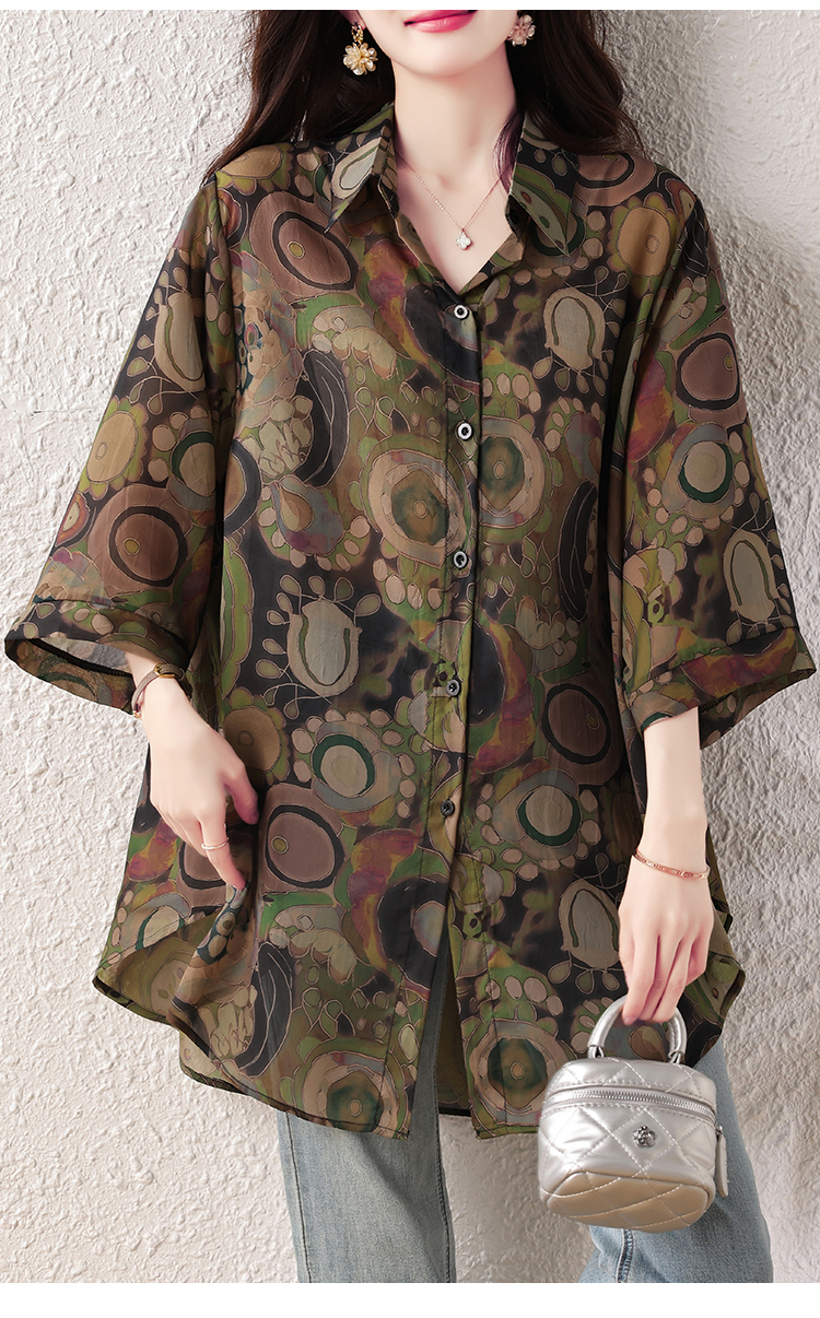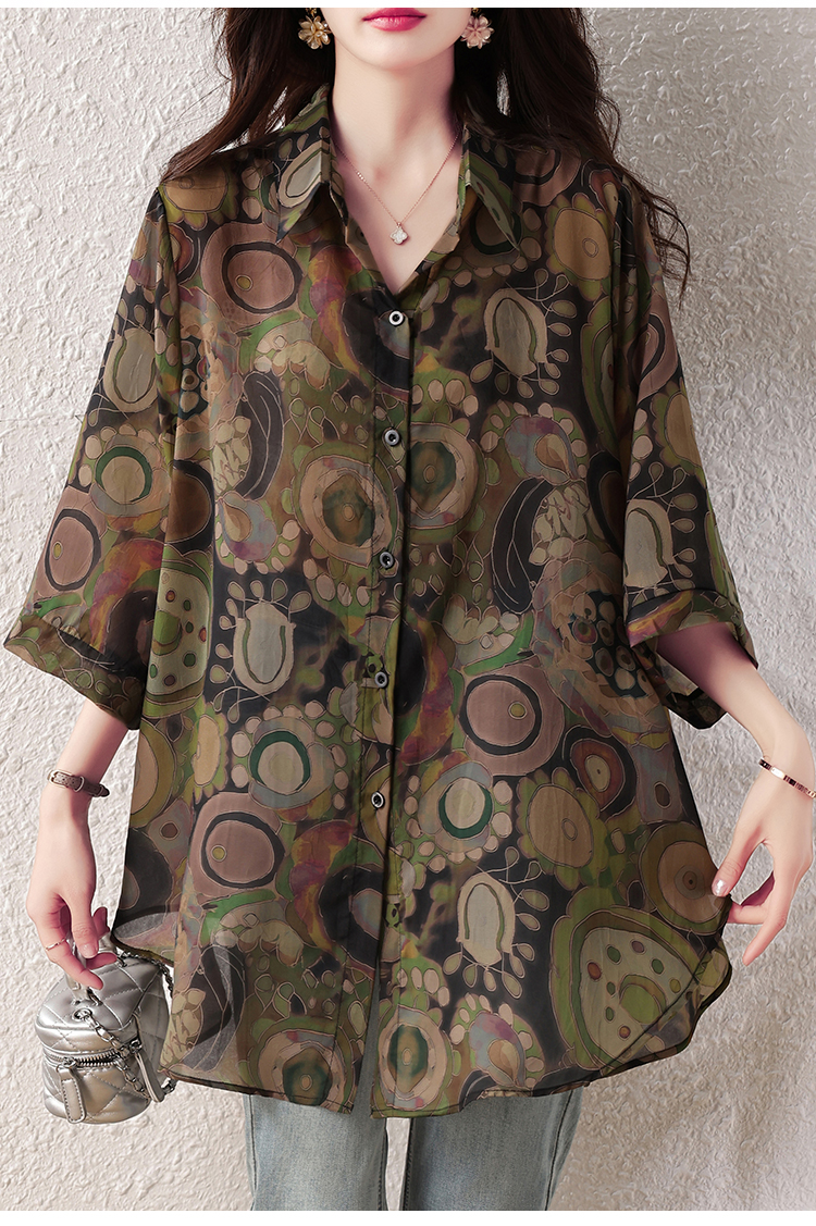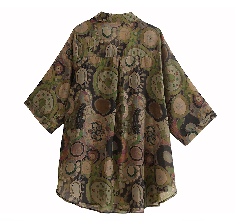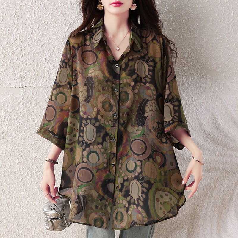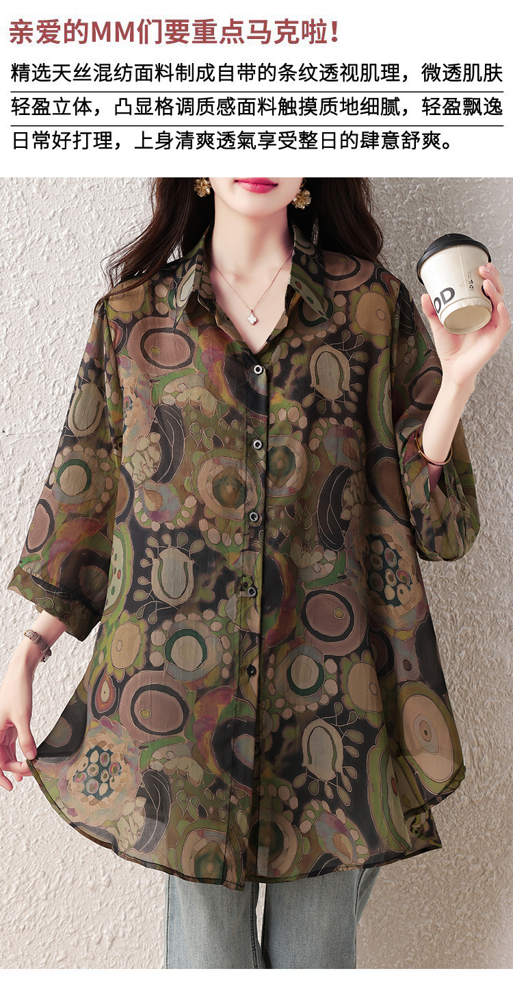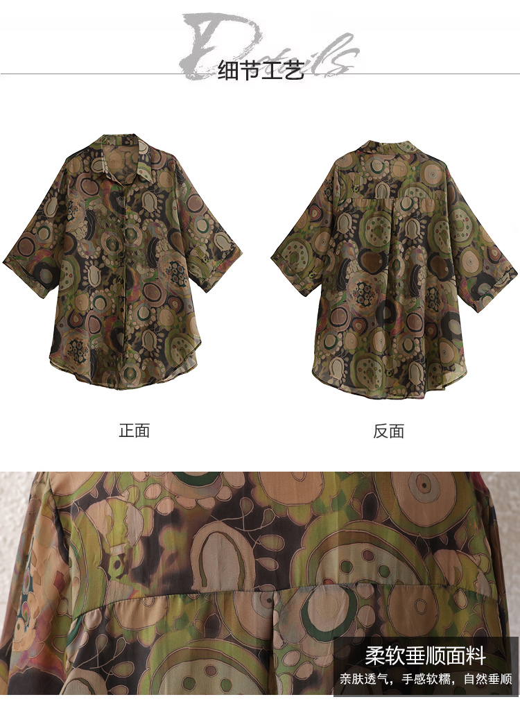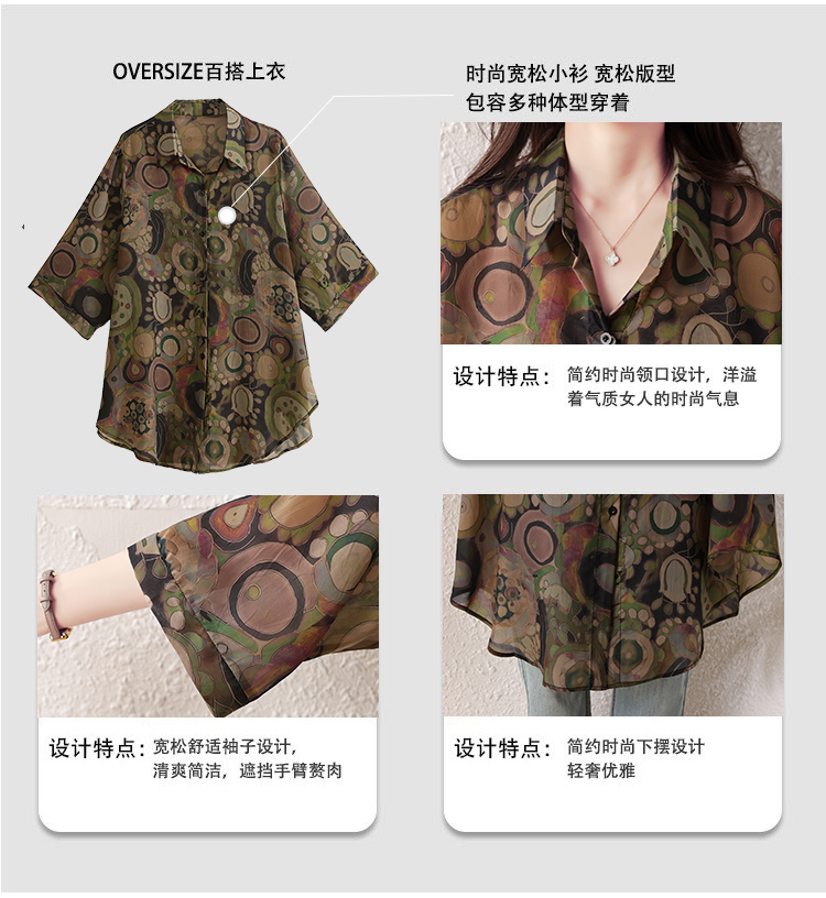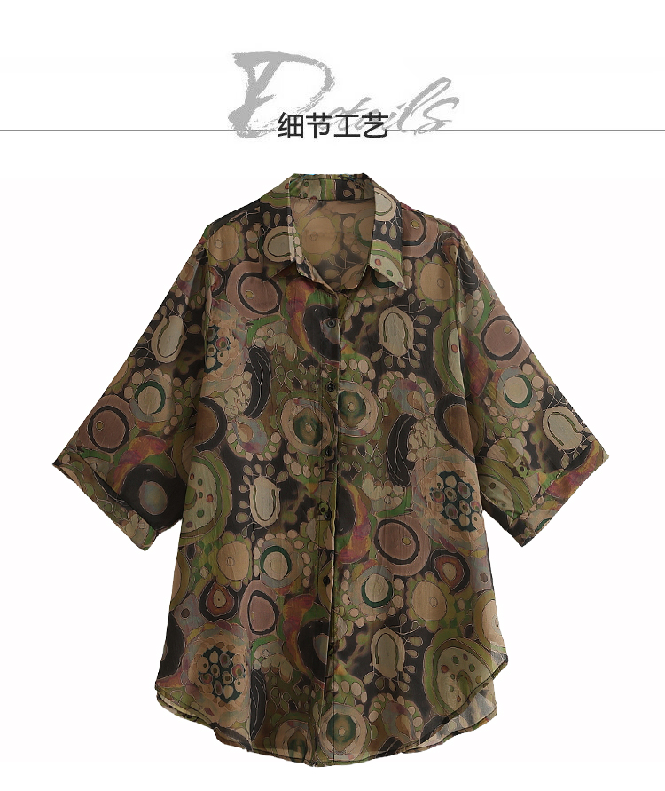 RY4102# 2026夏季新款大码雪纺衬衫女复古印花宽松遮肉显瘦中袖上衣