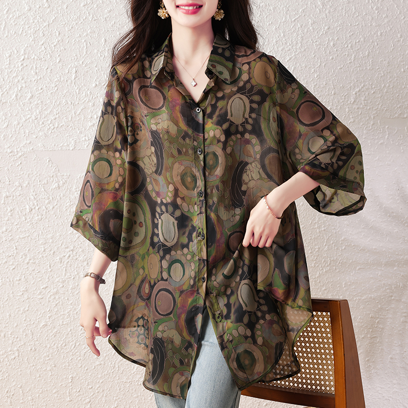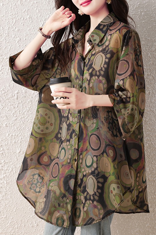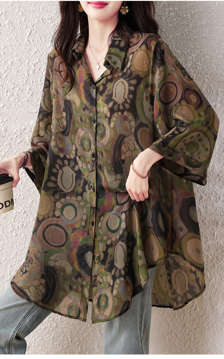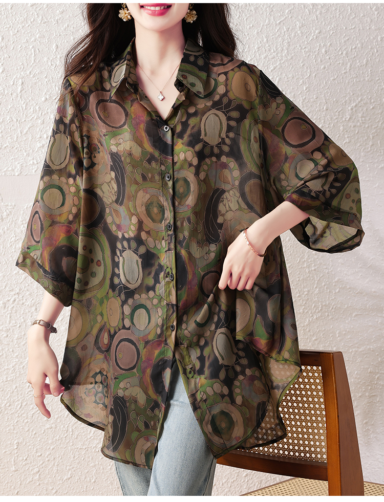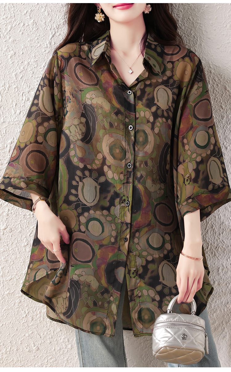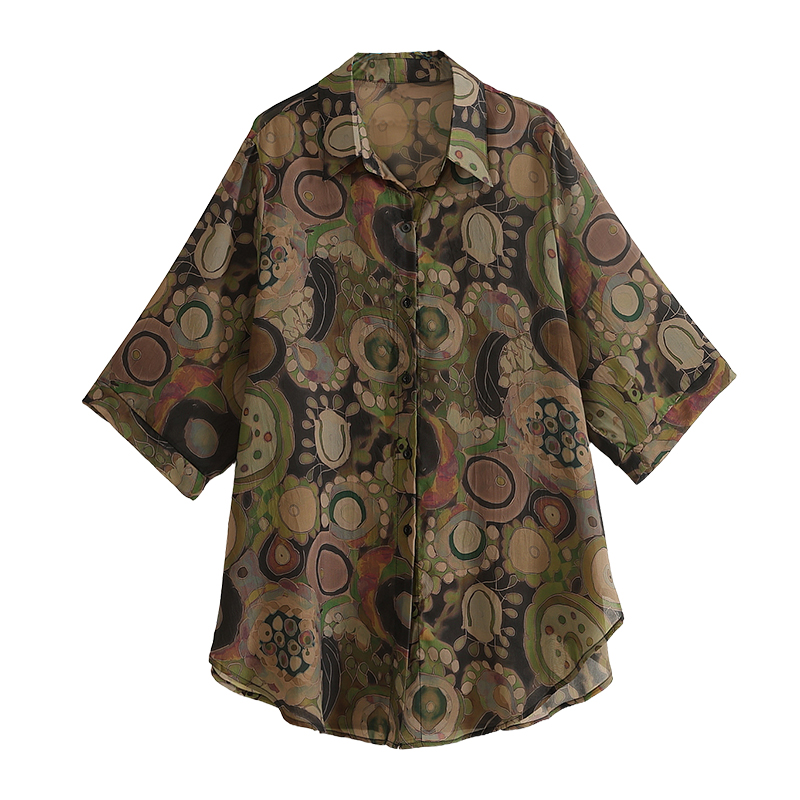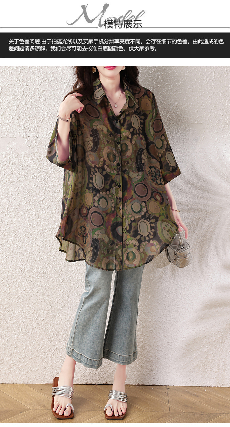 RY4102# 2026夏季新款大码雪纺衬衫女复古印花宽松遮肉显瘦中袖上衣