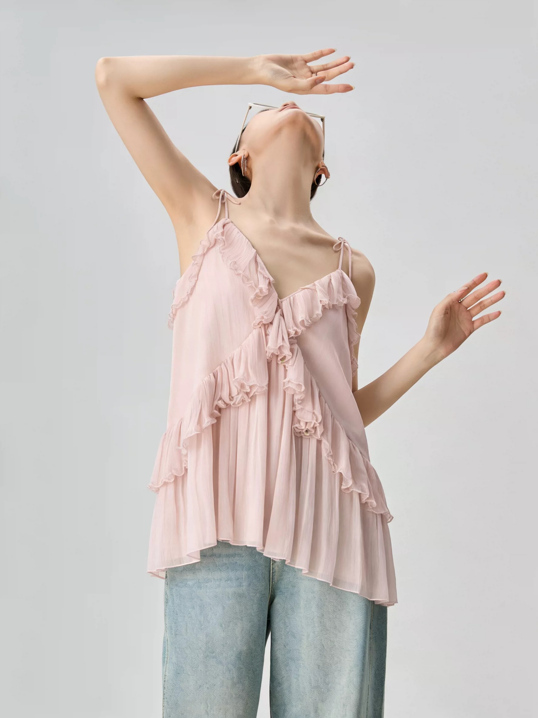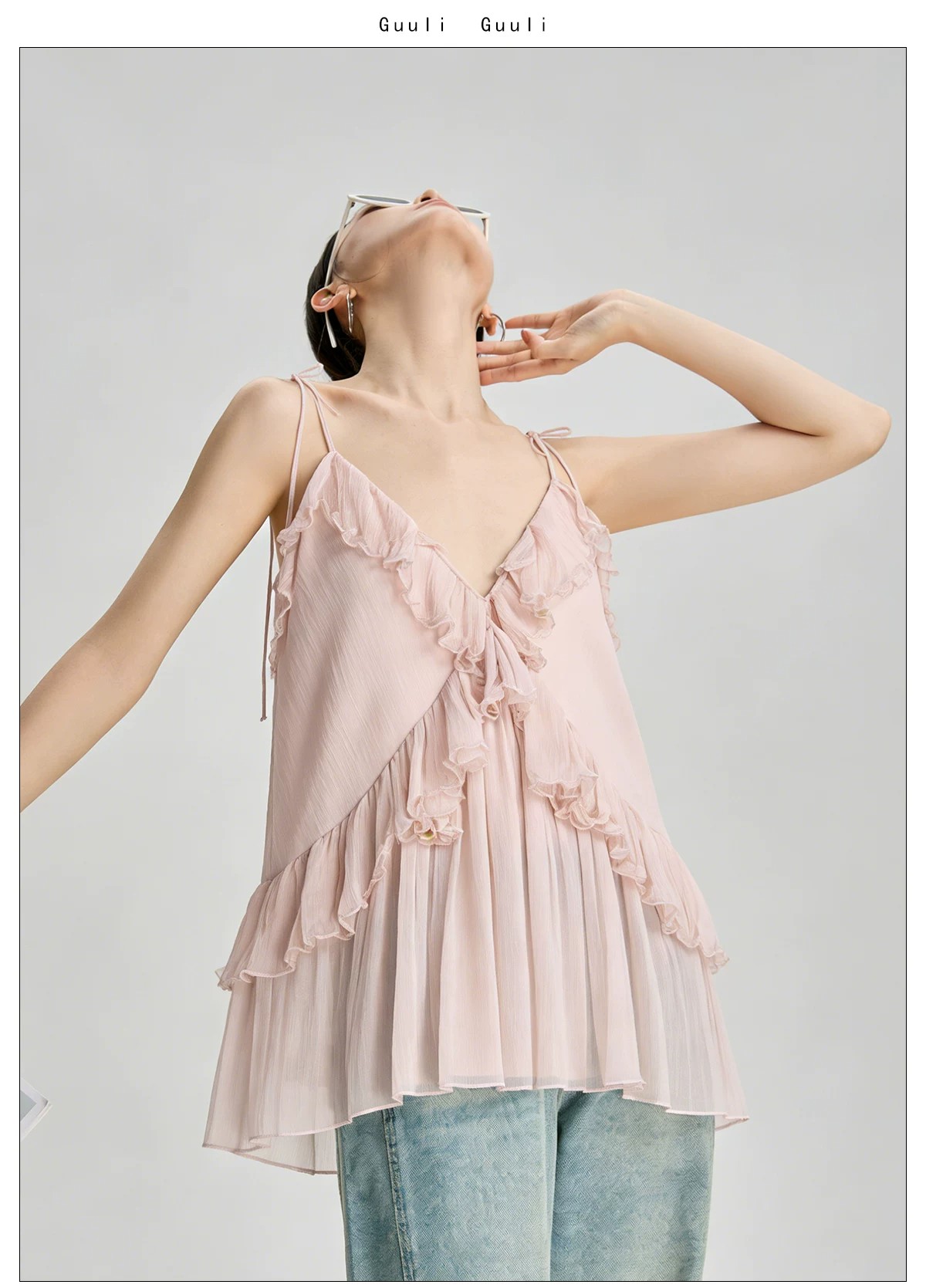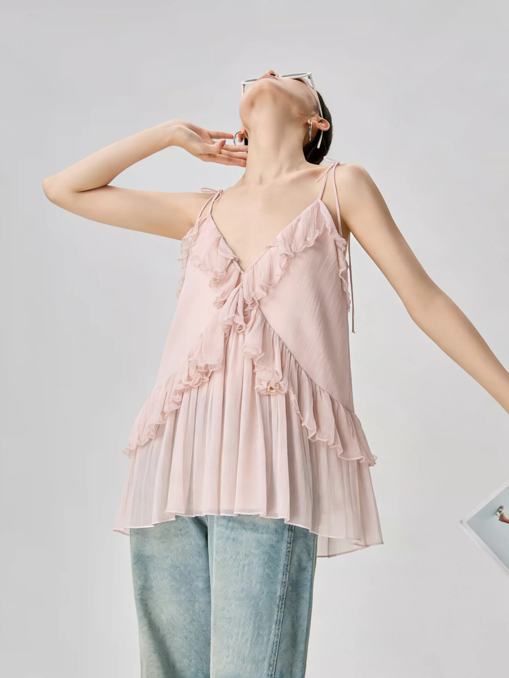RY4107# 法式度假风粉色v领荷叶边细肩带无袖上衣独特漂亮内搭小吊带夏季