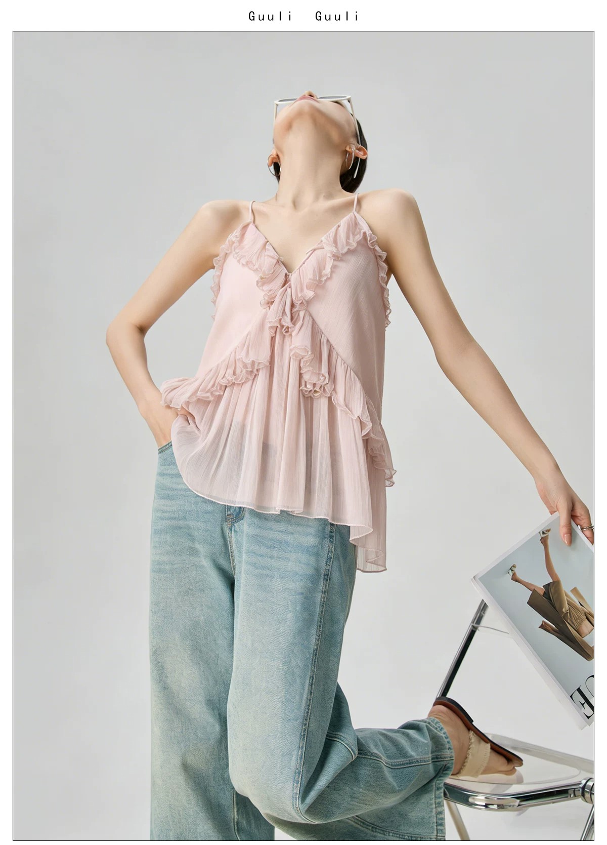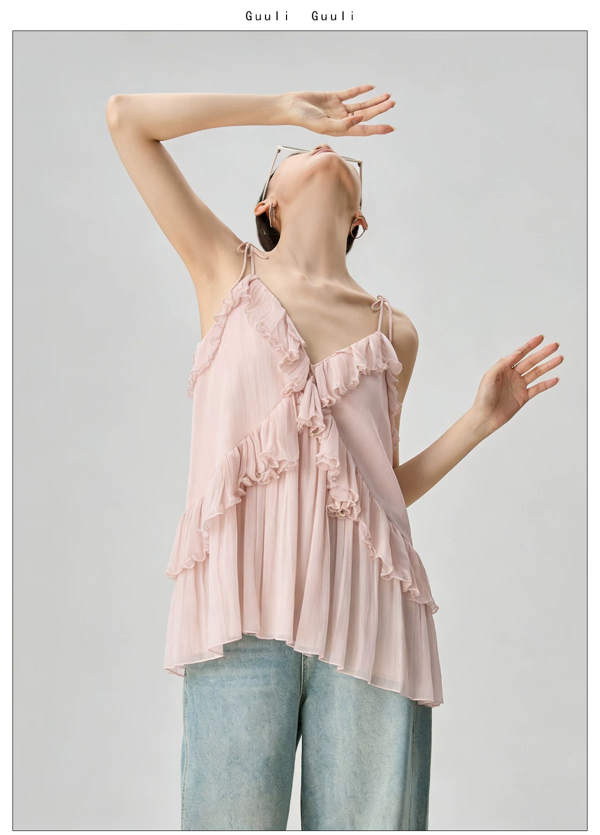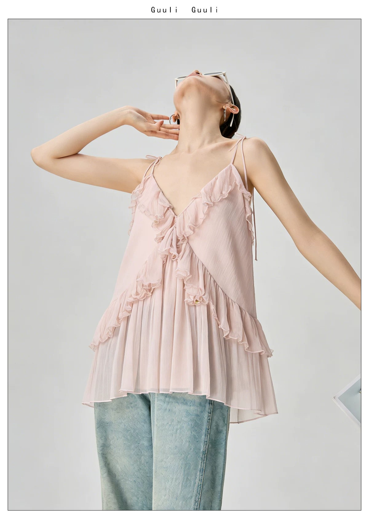 RY4107# 法式度假风粉色v领荷叶边细肩带无袖上衣独特漂亮内搭小吊带夏季