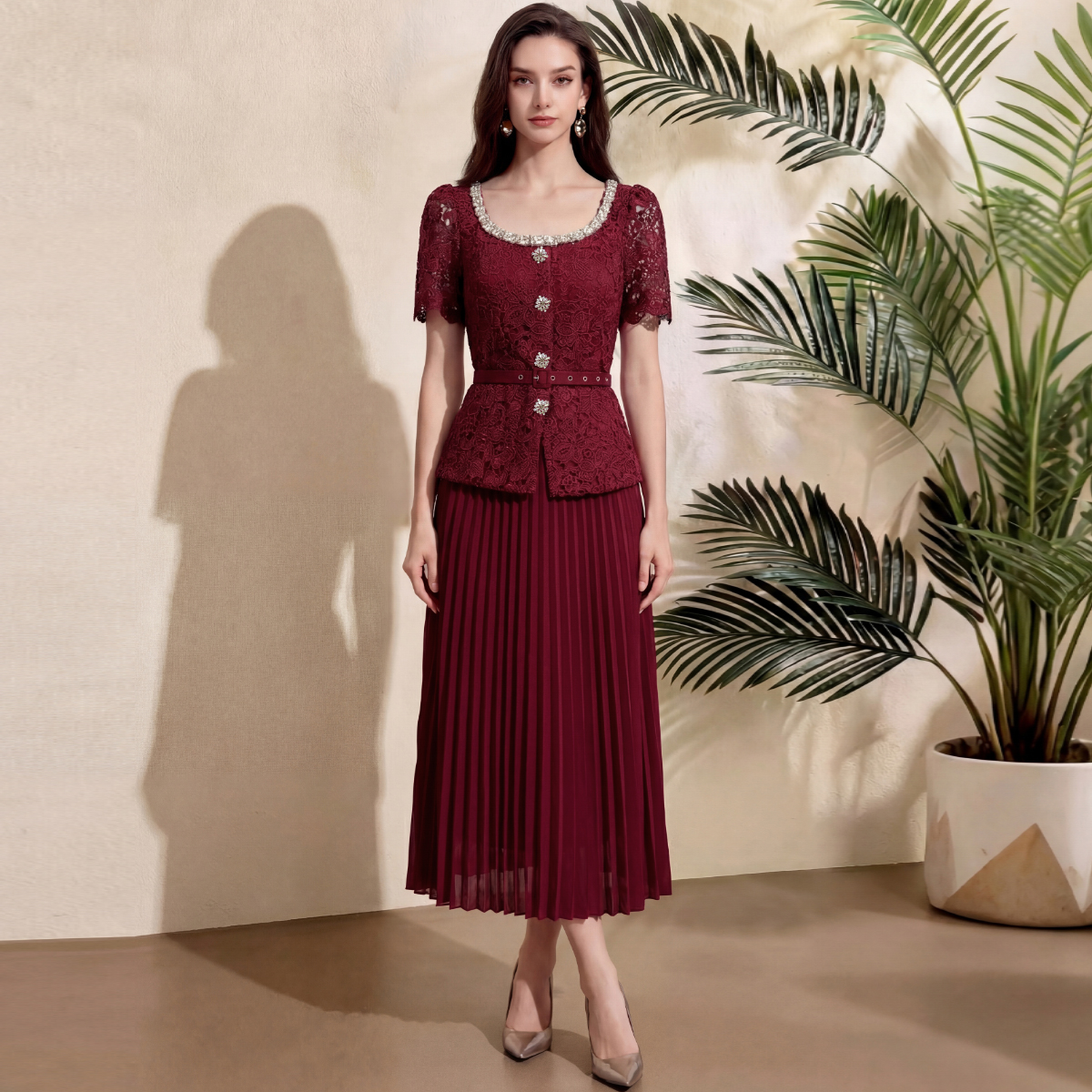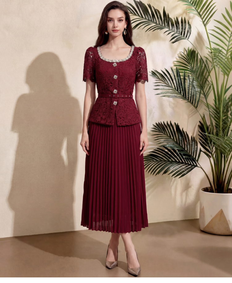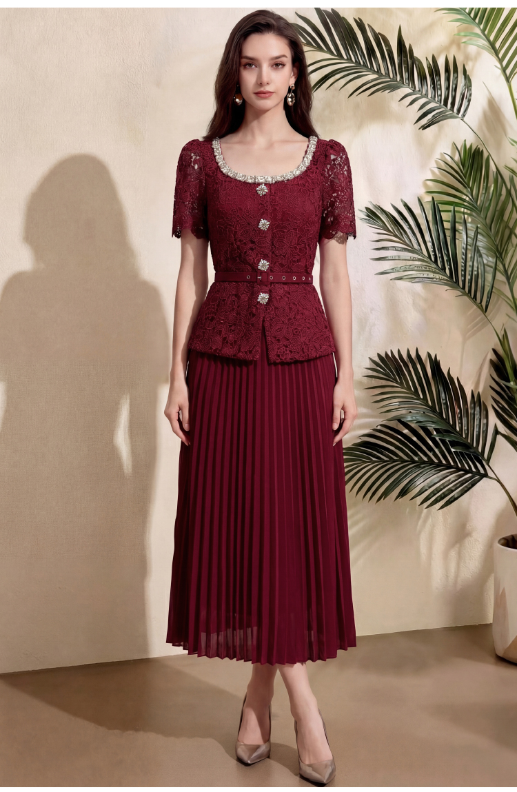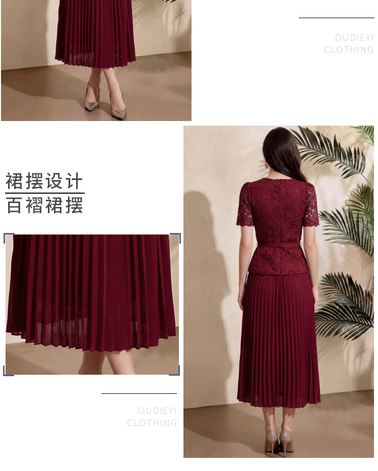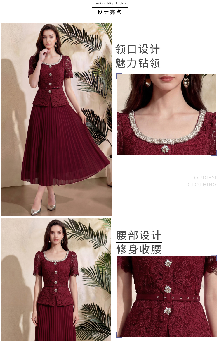 RY4114# 实拍法式小香风修身镶钻大圆领短袖蕾丝拼接中长百褶连衣裙配腰带