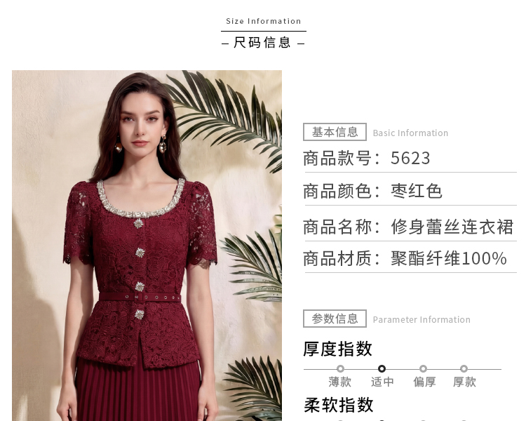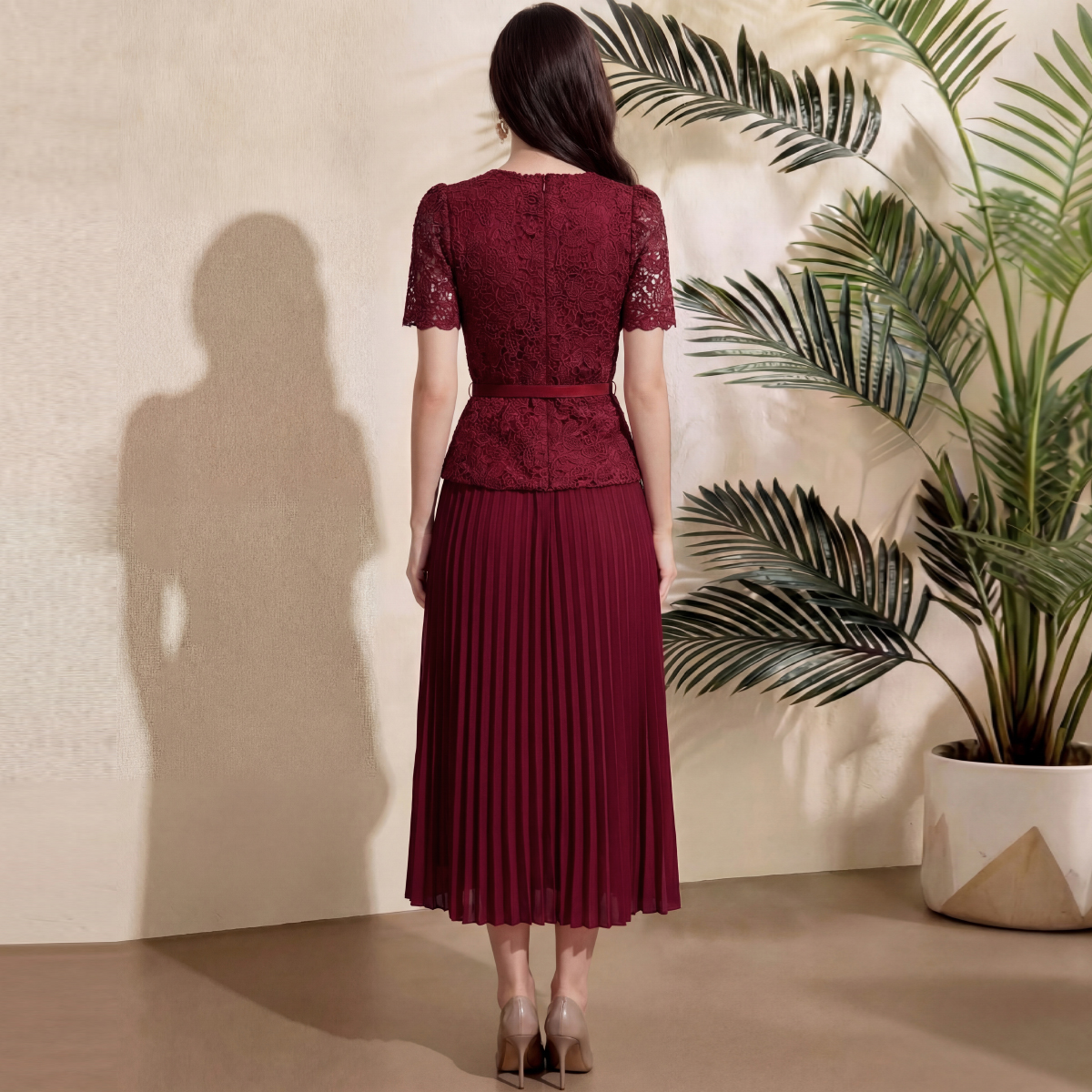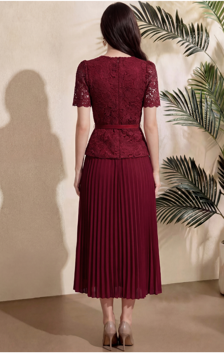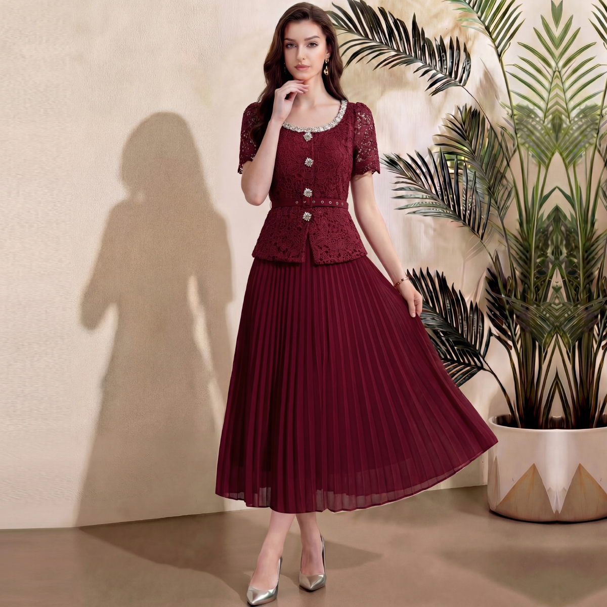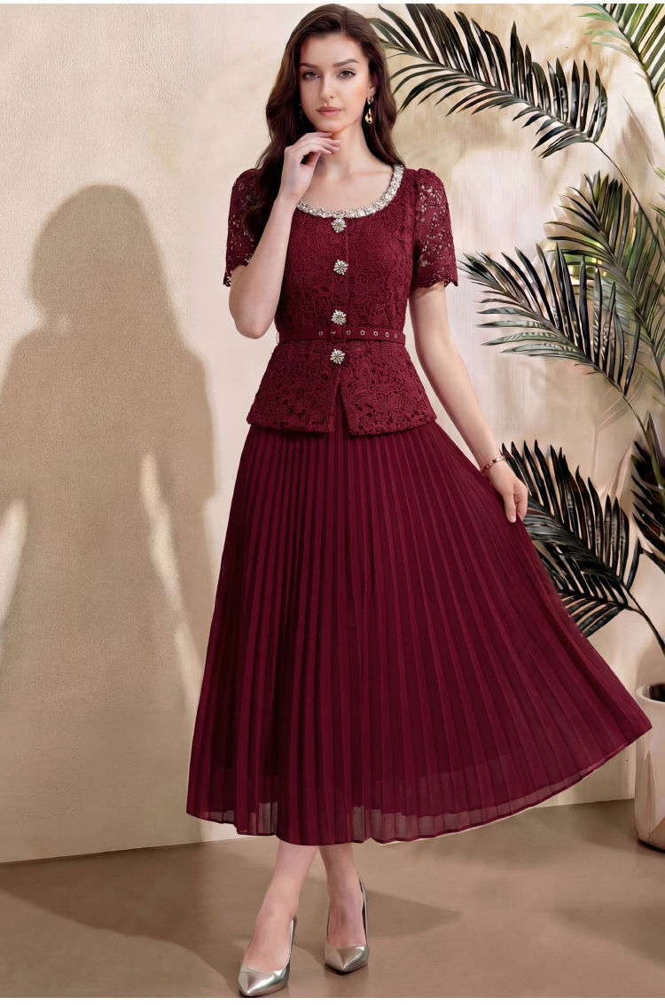RY4114# 实拍法式小香风修身镶钻大圆领短袖蕾丝拼接中长百褶连衣裙配腰带