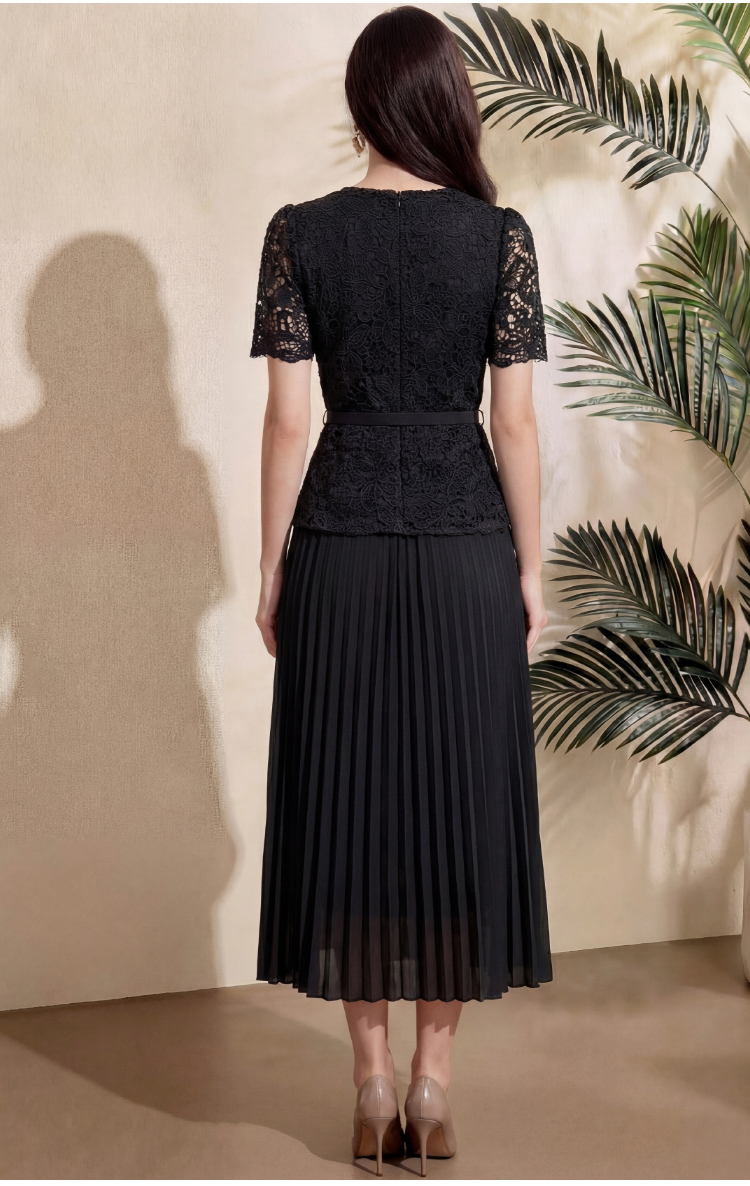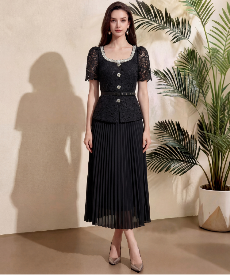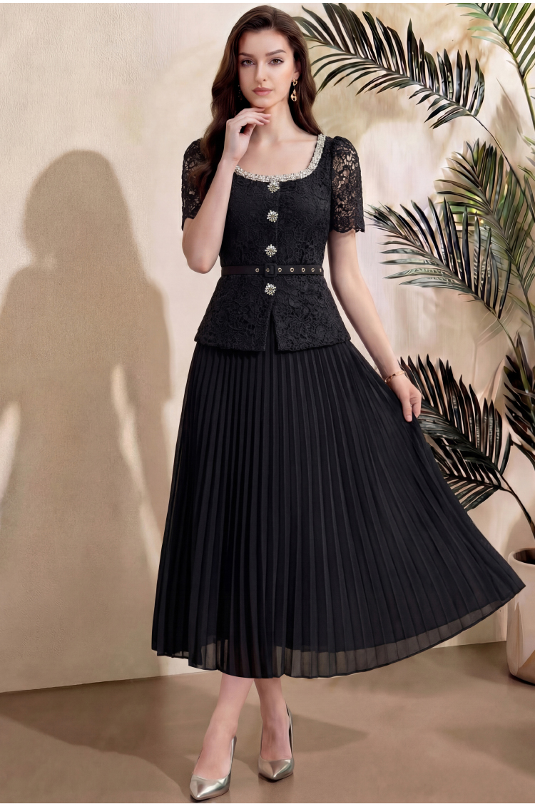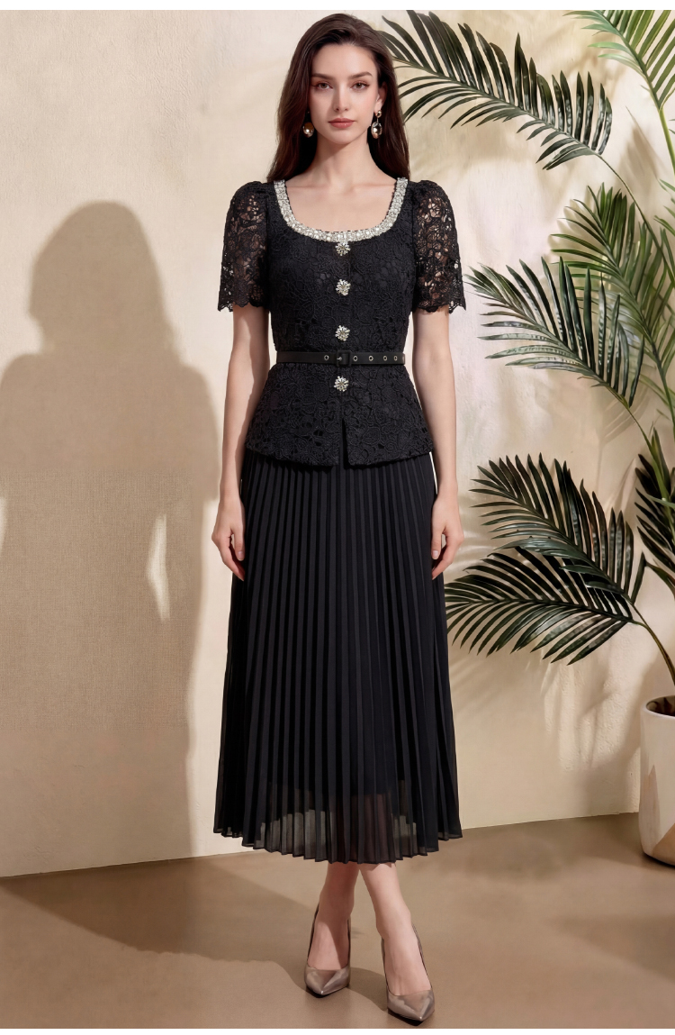 RY4115# 实拍法式小香风修身镶钻大圆领短袖蕾丝拼接中长百褶连衣裙配腰带